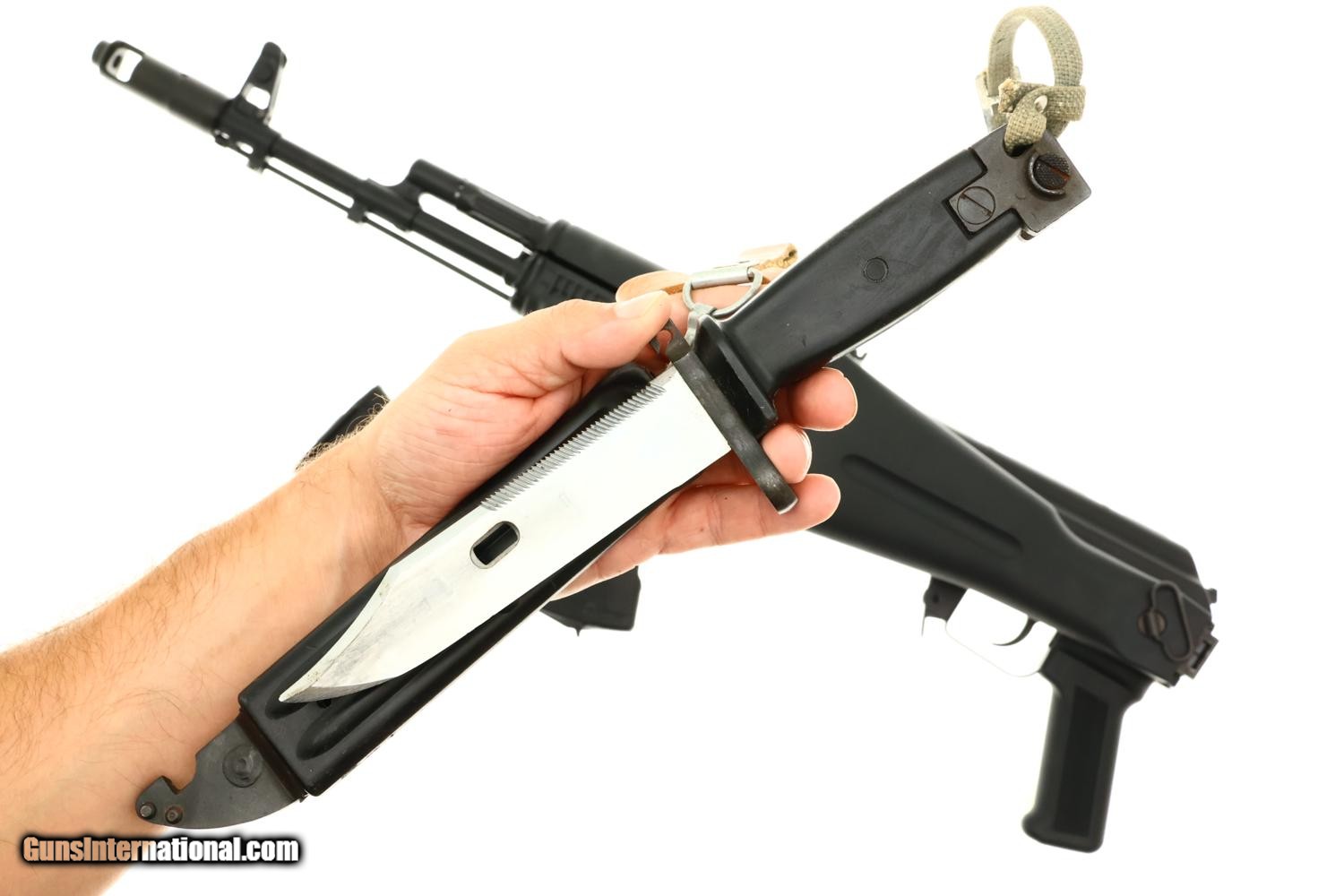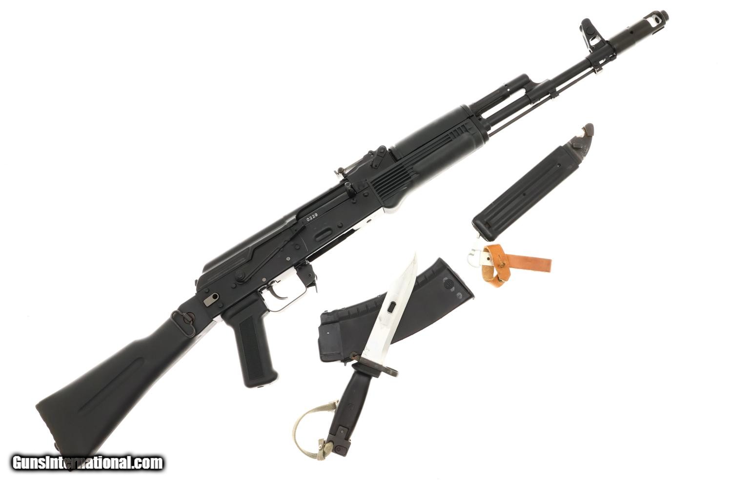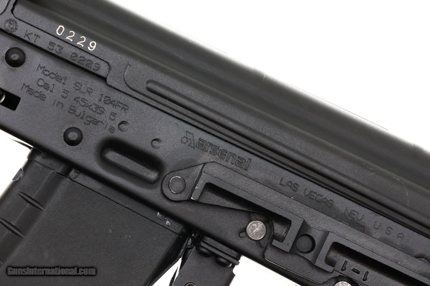 Standard configuration Arsenal SLR-104FR Rifle, basically an AKS-74 clone made in Bulgaria, cal. 5.45x39.5mm, with height adjustable post front sight and tangent rear sight graded 1-10, having a stamped receiver with left sided scope rail, chrome lined hammer forged barrel with removable muzzle brake, bayonet lug and accessory lug, black plastic furniture, and left-side folding stock. Left side of the receiver with manufacturer and importer markings along with full serial number with last four repeated on receiver cover, bolt carrier, and bolt. Fitted with 30-shot extended black plastic magazine, right side marked with an encircled "10". Bayonet blade and scabbard w/ hanger both electropenciled on the right side "K8". No box or other accessories