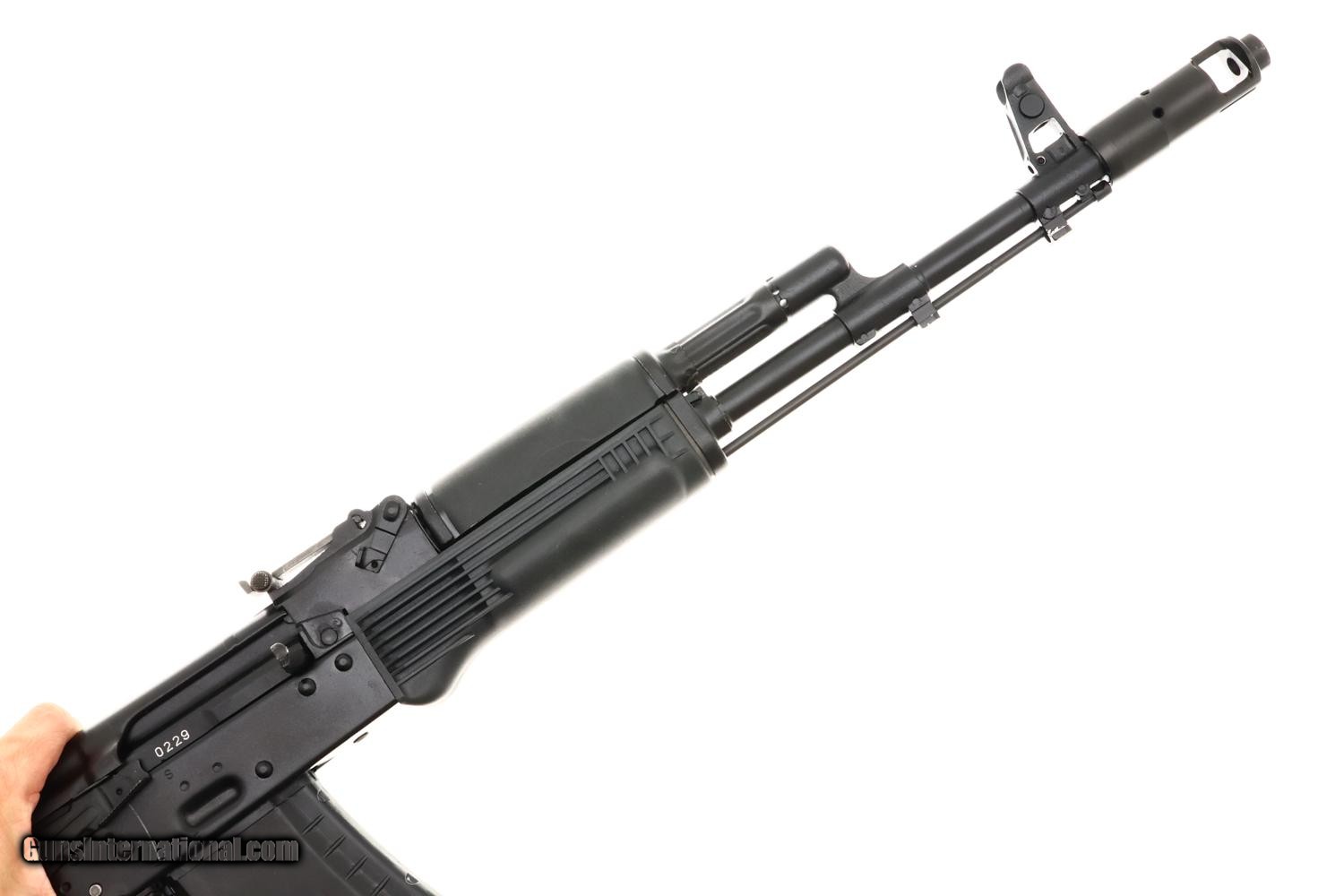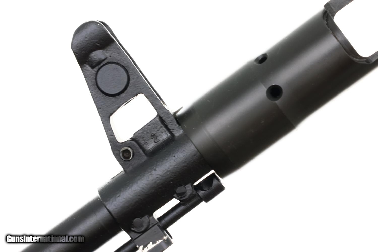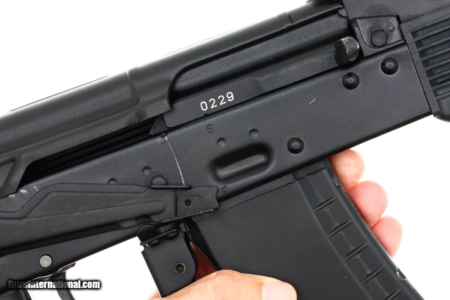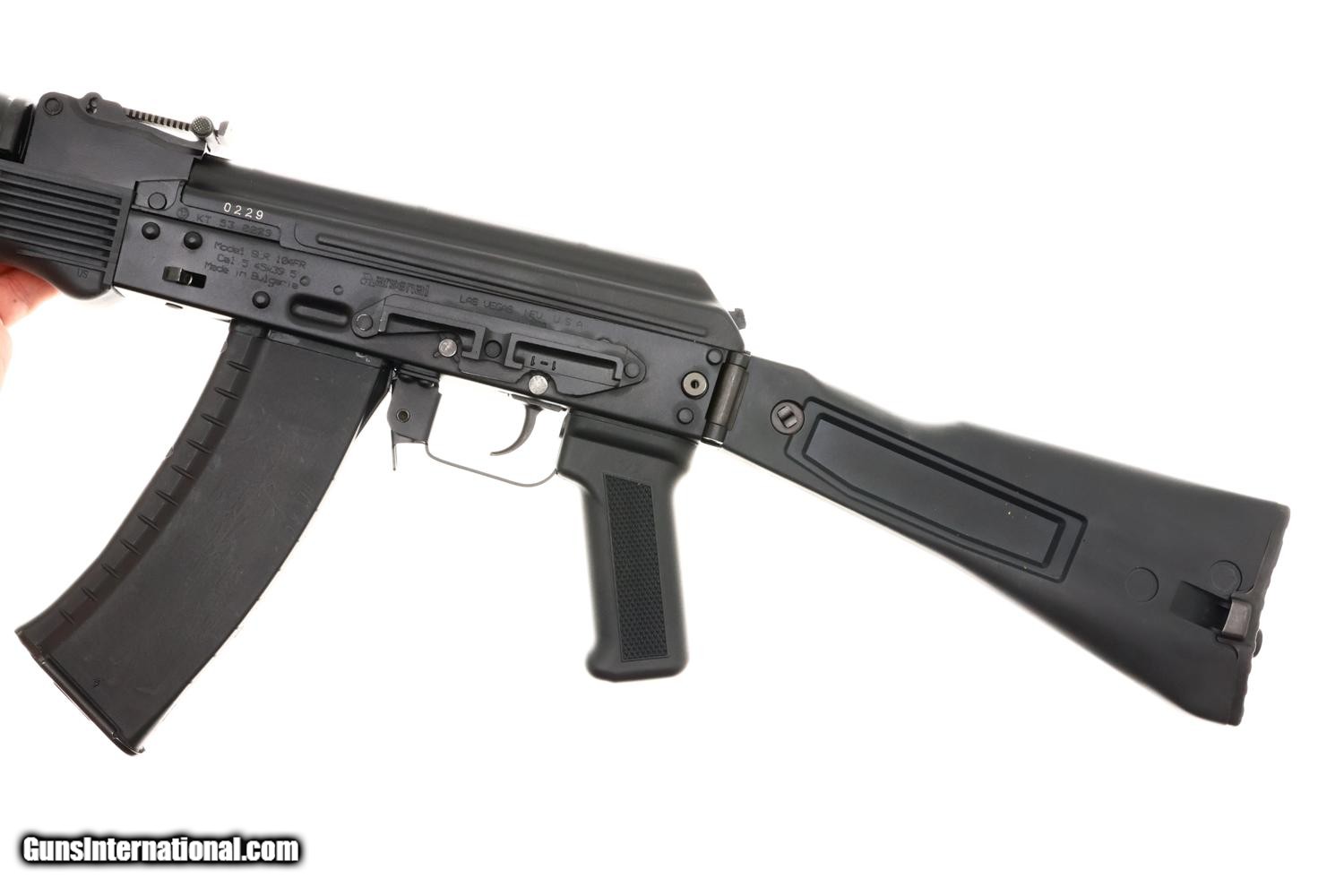 Description: Synopsis: This Arsenal SLR-104FR is a near-new semiautomatic rifle with bayonet/scabbard, made in Bulgaria, cal 5.45x39.5mm, with a stamped receiver, chrome-lined hammer-forged barrel, adjustable sights, and a left-side folding stock, representing a commercial variant of the AKS-74 design originally developed for military use. Description: Standard configuration Arsenal SLR-104FR Rifle, basically an AKS-74 clone made in Bulgaria, cal. 5.45x39.5mm, with height adjustable post front sight and tangent rear sight graded 1-10, having a stamped receiver with left sided scope rail, chrome lined hammer forged barrel with removable muzzle brake, bayonet lug and accessory lug, black plastic furniture, and left-side folding stock. Left side of the receiver with manufacturer and importer markings along with full serial number with last four repeated on receiver cover, bolt carrier, and bolt. Fitted with 30-shot extended black plastic magazine, right side marked with an encircled "10". Bayonet blade and scabbard w/ hanger both electropenciled on the right side "K8". No box or other accessories Condition: The rifle and associated bayonet/scabbard are nearly new with just a few faint handling marks. Mirror bore. Correct manual mechanics. Similar condition bayonet and scabbard. SOLD Manufacturer: Arsenal Inc. Model: SLR-104FR Serial Number: KT530229 Caliber Info: 5.45x39.5 Condition: Near New |