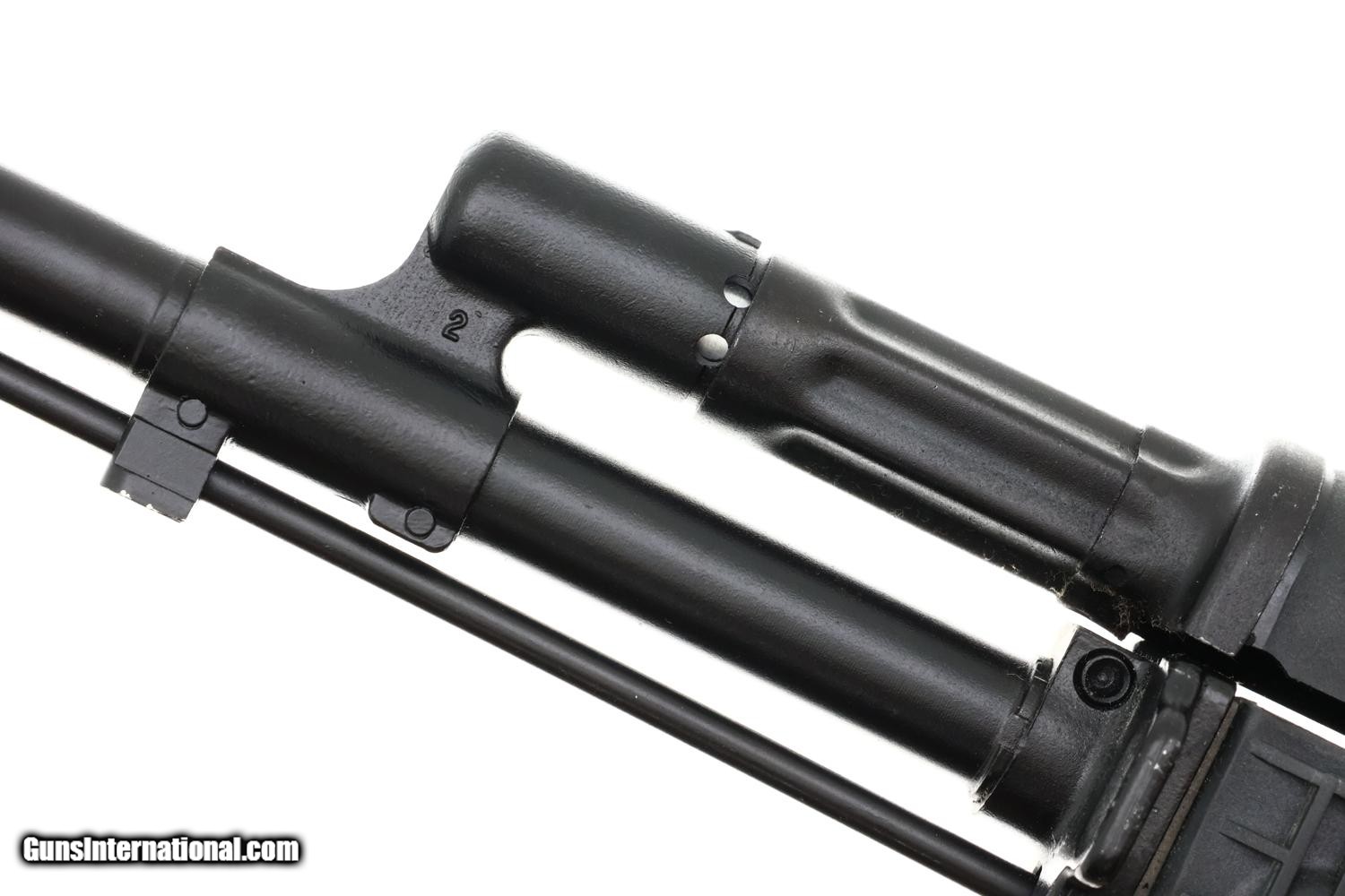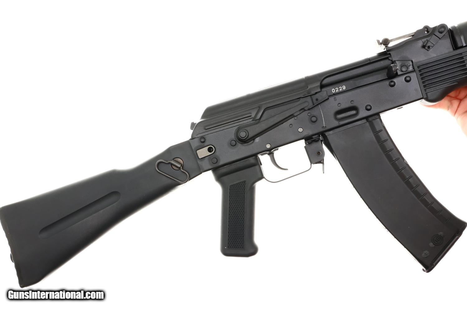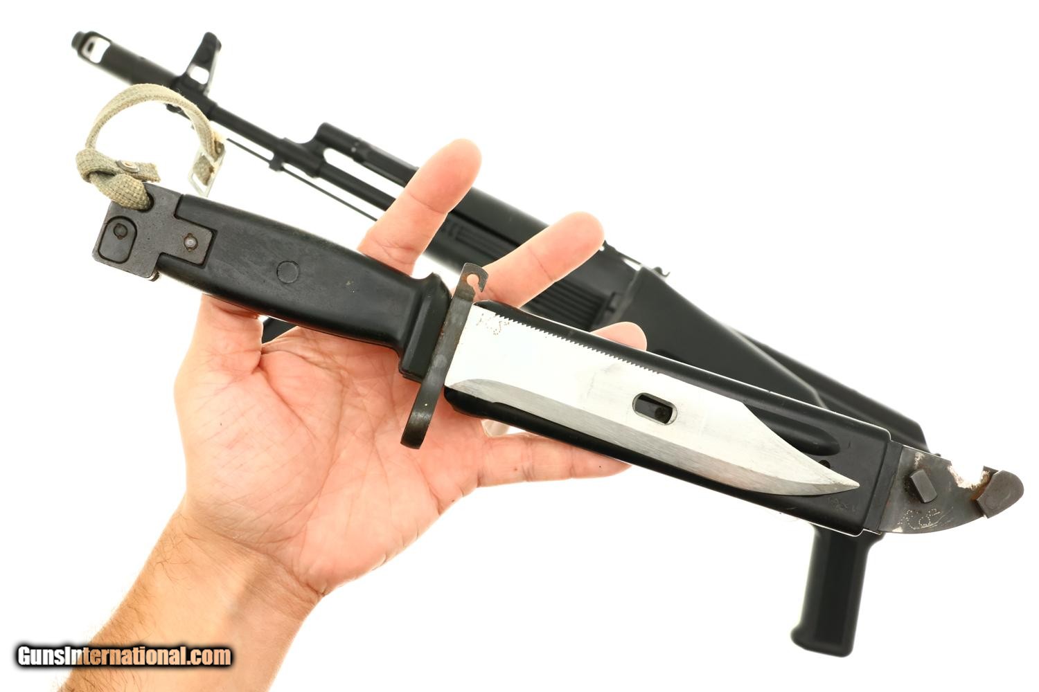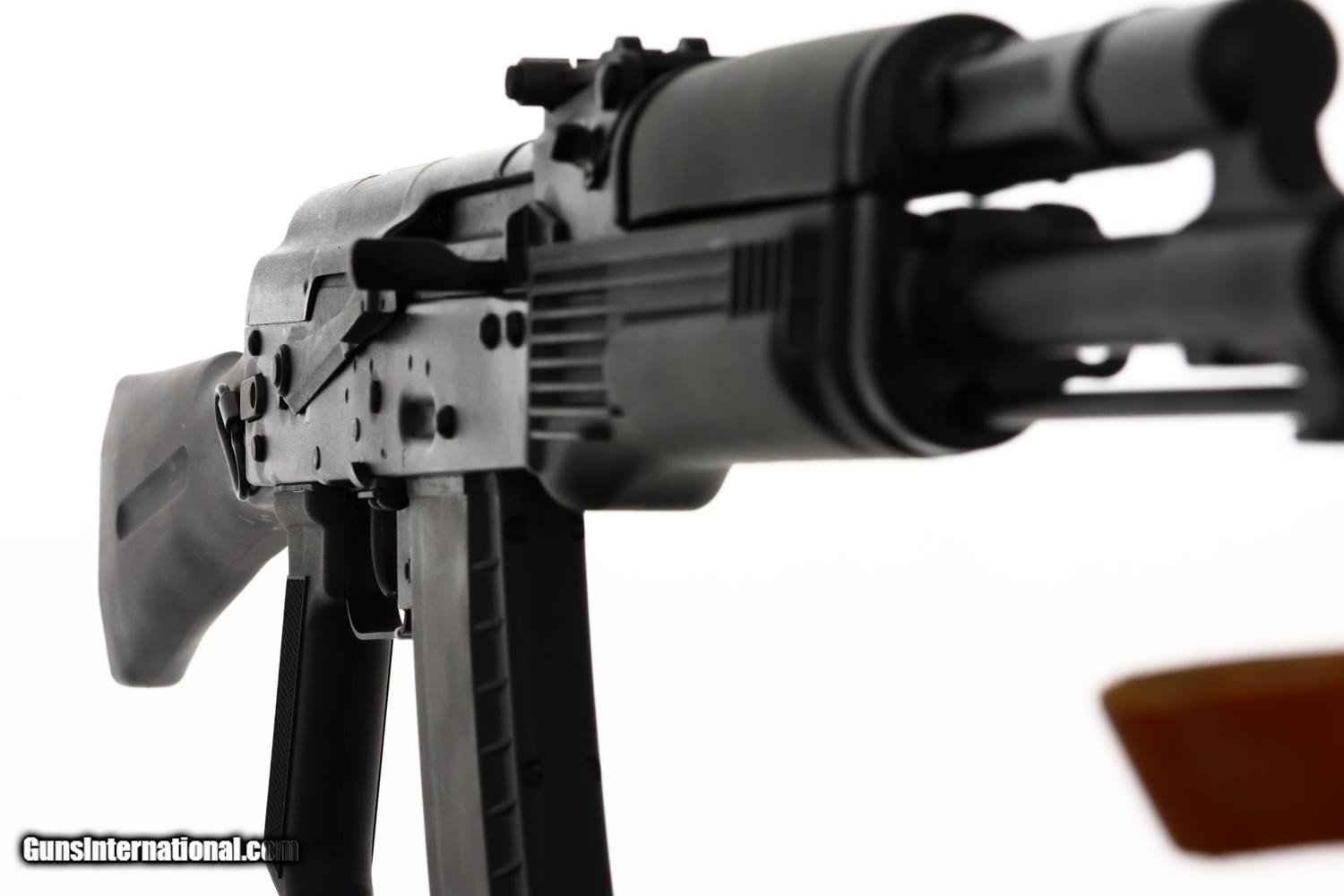 Description: Synopsis: This Arsenal SLR-104FR is a near-new semiautomatic rifle with bayonet/scabbard, made in Bulgaria, cal 5.45x39.5mm, with a stamped receiver, chrome-lined hammer-forged barrel, adjustable sights, and a left-side folding stock, representing a commercial variant of the AKS-74 design originally developed for military use. Description: Standard configuration Arsenal SLR-104FR Rifle, basically an AKS-74 clone made in Bulgaria, cal. 5.45x39.5mm, with height adjustable post front sight and tangent rear sight graded 1-10, having a stamped receiver with left sided scope rail, chrome lined hammer forged barrel with removable muzzle brake, bayonet lug and accessory lug, black plastic furniture, and left-side folding stock. Left side of the receiver with manufacturer and importer markings along with full serial number with last four repeated on receiver cover, bolt carrier, and bolt. Fitted with 30-shot extended black plastic magazine, right side marked with an encircled "10". Bayonet blade and scabbard w/ hanger both electropenciled on the right side "K8". No box or other accessories Condition: The rifle and associated bayonet/scabbard are nearly new with just a few faint handling marks. Mirror bore. Correct manual mechanics. Similar condition bayonet and scabbard. SOLD Manufacturer: Arsenal Inc. Model: SLR-104FR Serial Number: KT530229 Caliber Info: 5.45x39.5 Condition: Near New |