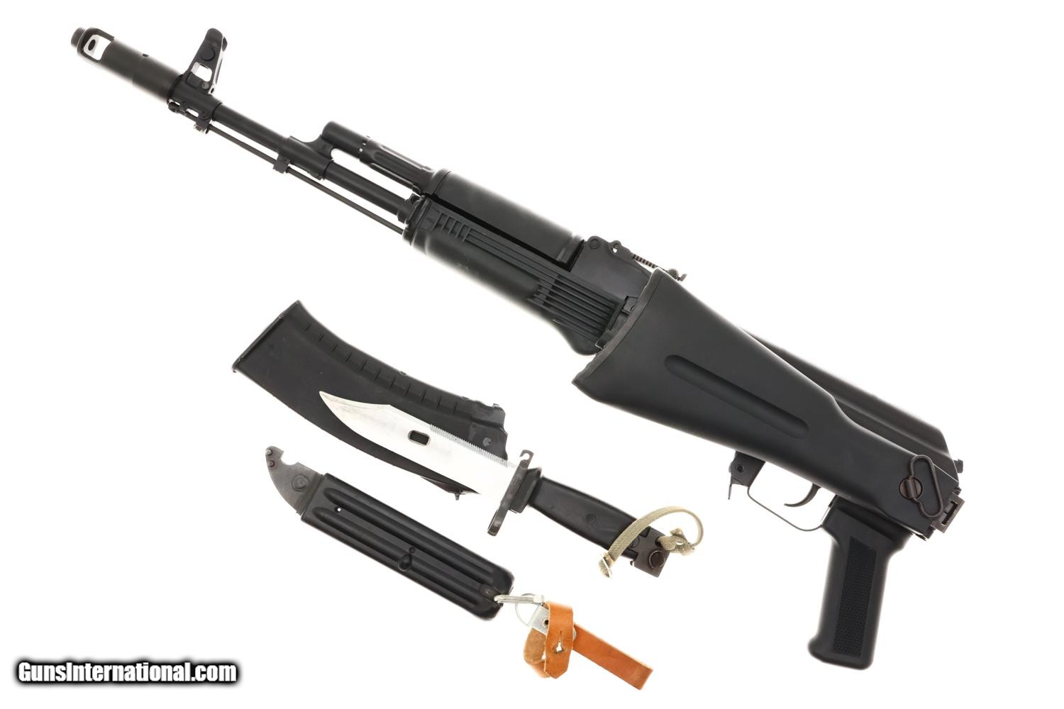 This Arsenal SLR-104FR is a near-new semiautomatic rifle with bayonet/scabbard, made in Bulgaria, cal 5.45x39.5mm, with a stamped receiver, chrome-lined hammer-forged barrel, adjustable sights, and a left-side folding stock, representing a commercial variant of the AKS-74 design originally developed for military use.