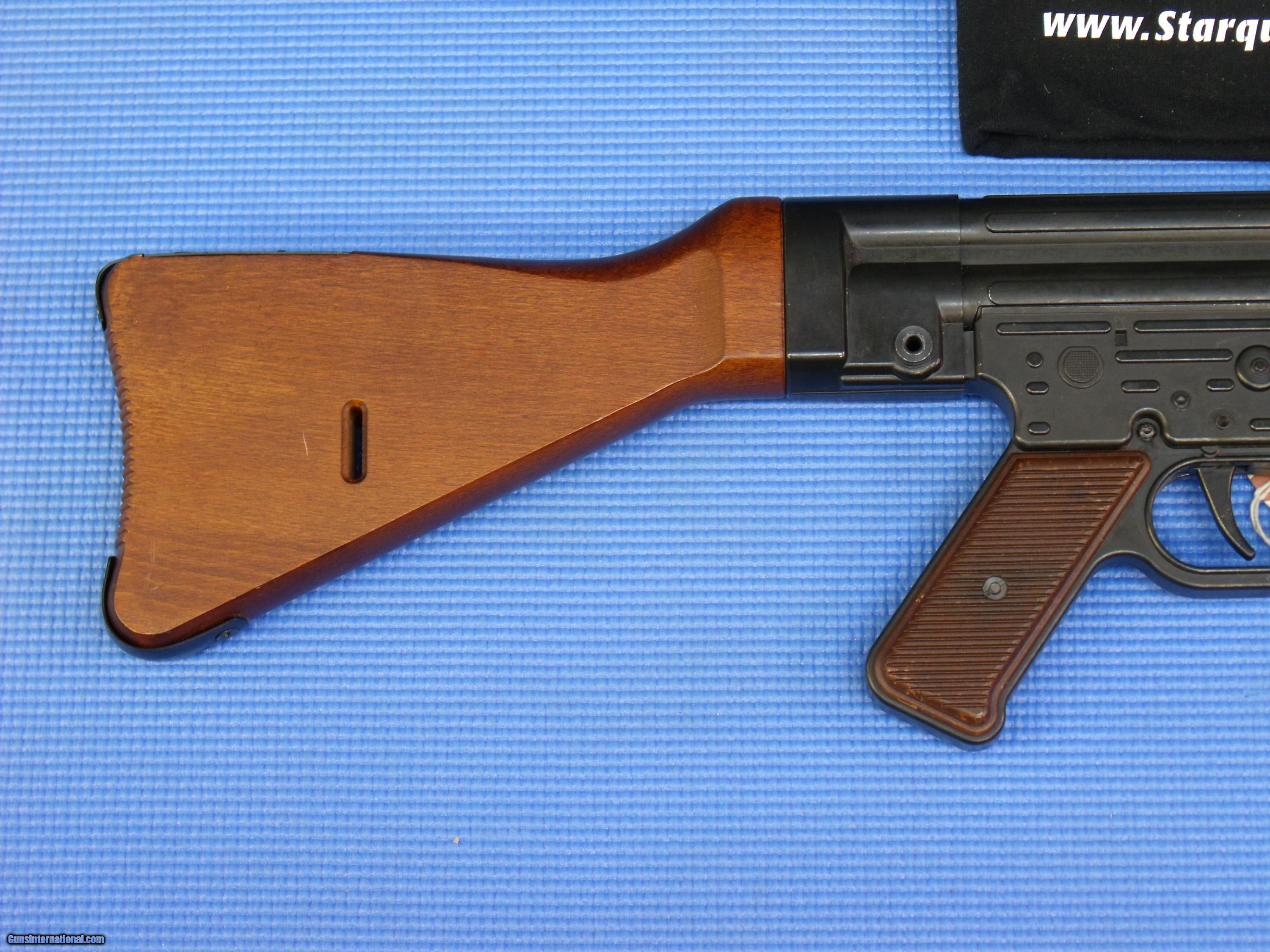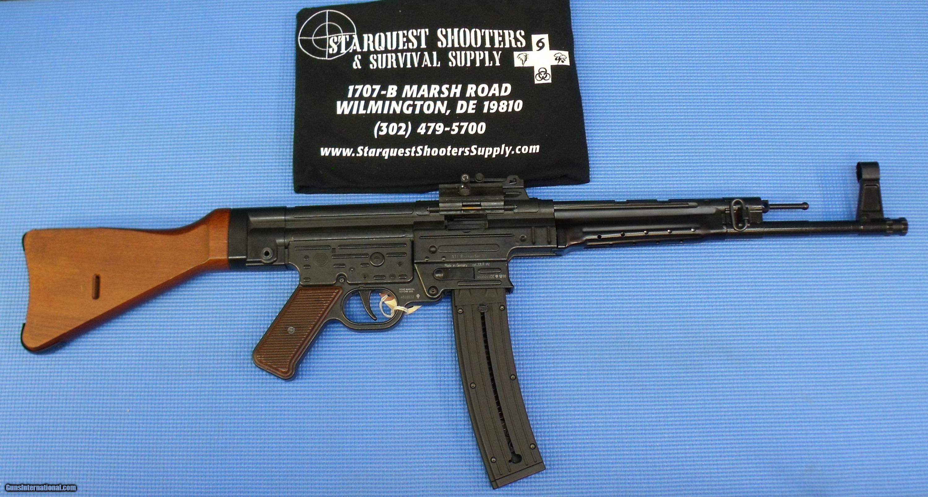 Description: American Tactical Imports / German STG 44 .22LR -- With Pine Storage Crate The STG-44 (Sturmgewehr 44) was developed in Nazi Germany during WWII and was the first ‘Storm’ (or assault) rifle to see major deployment. Retaining as many of the original specs as possible, the GSG 22.LR version of this piece of history flawlessly sends 25 rounds of ammo accurately and quickly downrange. Included is one 25 round mag, and is perfect for casual plinking, target shooting, and hunting. Stunning wood finishing, easy-to-adjust iron sights, and simple safety features add to the STG-44’s superb level of quality. Packed in an old-world style pine crate. The STG-44 offers everything to make any shooting experience a memorable one. Caliber: .22LR Condition: NIB / Store Display Metal Condition: NIB / Store Display Wood Condition: NIB / Store Display Bore Condition: NIB Finish: NIB Book # :1-16-272 Price: $399.95 THE PRICE OF THIS RIFLE IS $399.95 (if paying by cashier's check or Money Order... Credit Cards MUST add 5%) + $45.00 for shipping & insurance to the FFL of your choice. For more information, or to arrange purchase please call: StarQuest Shooters & Survival Supply 1707-B Marsh Road Wilmington, DE 19810 (302) 479-5700 OPEN 7 DAYS A WEEK Price: $399.95 THIS RIFLE IS IN STOCK AND READY TO SHIP TODAY!!!!!! SOLD Caliber Info: .22LR |