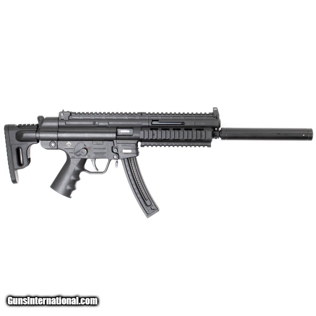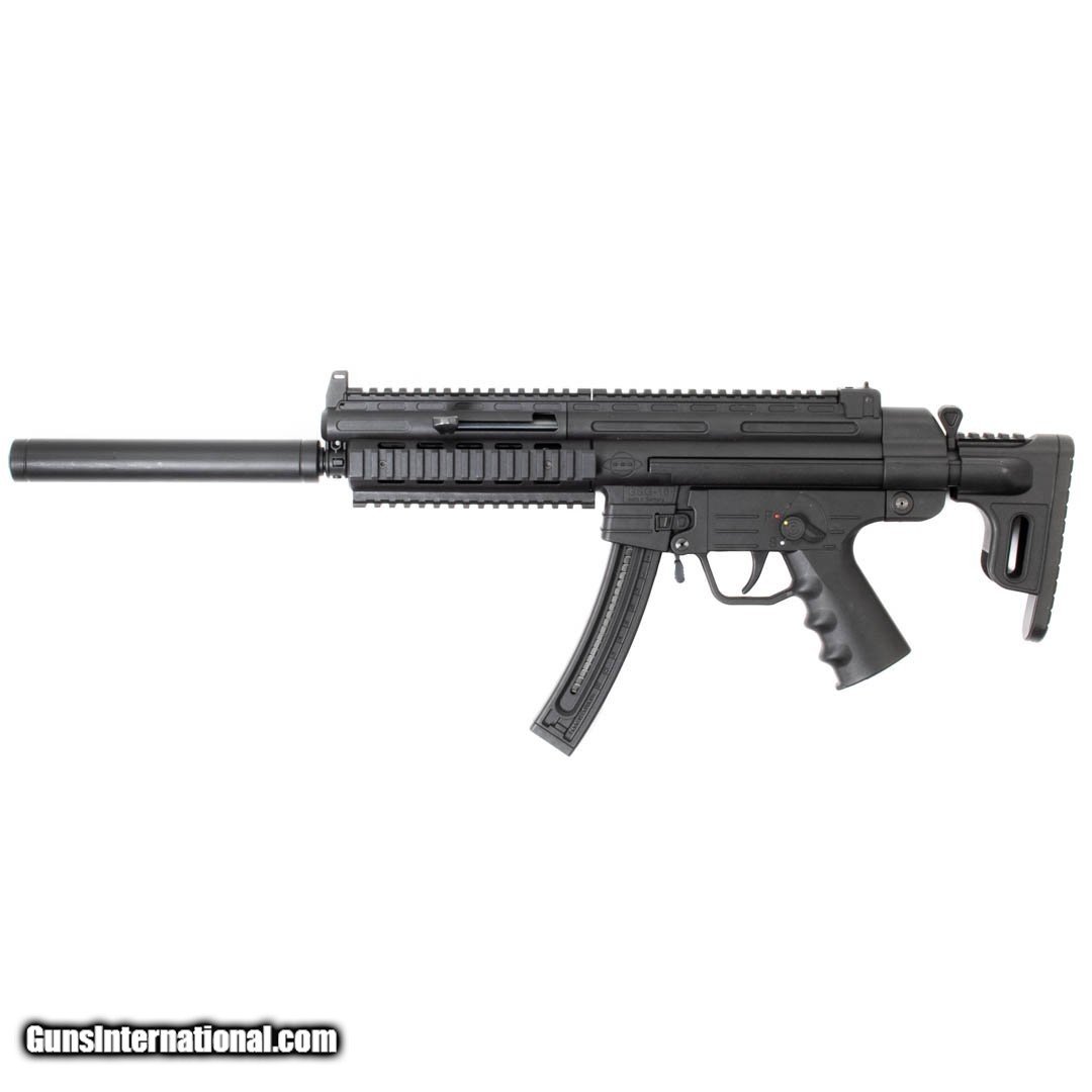 This German Sport Guns GSG-16 features an adjustable stock, a weighted pistol grip, an ambidextrous thumb safety, and a faux Silencer barrel shroud. The rear peep sight is broken off. One 22-round magazine is included.