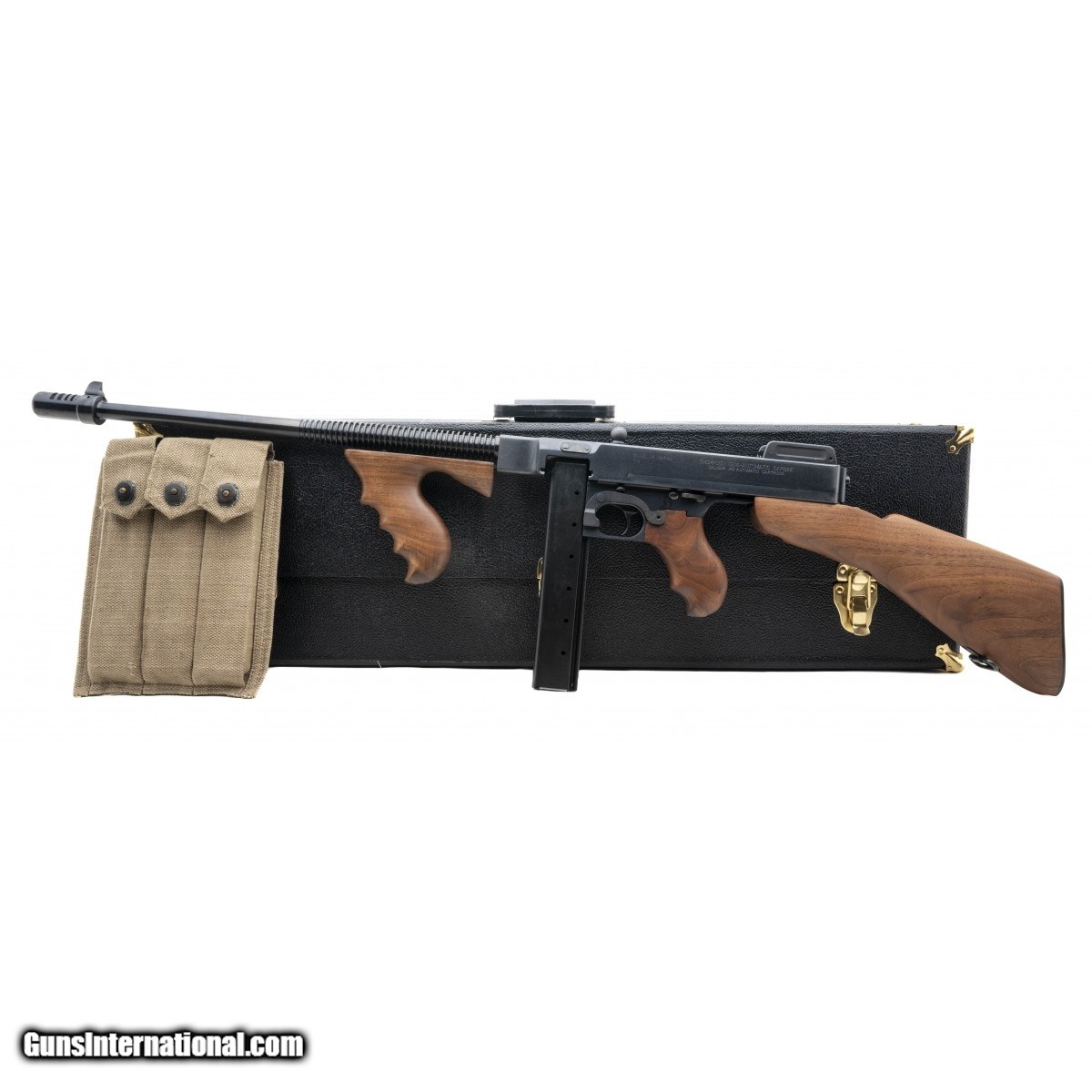 SN:KM6515. Modern Production, .45 ACP with a 18.5"" barrel. Bore is in excellent condition. Semi-auto carbine with wood furniture, adjustable rear sights, manual safety and detachable magazine. Overall condition is excellent. Comes with factory case, display velvet hardcase, magazine pouch, 10 30rd stick magazines, 1 50rd drum and 1 100rd drum. (Consignment)