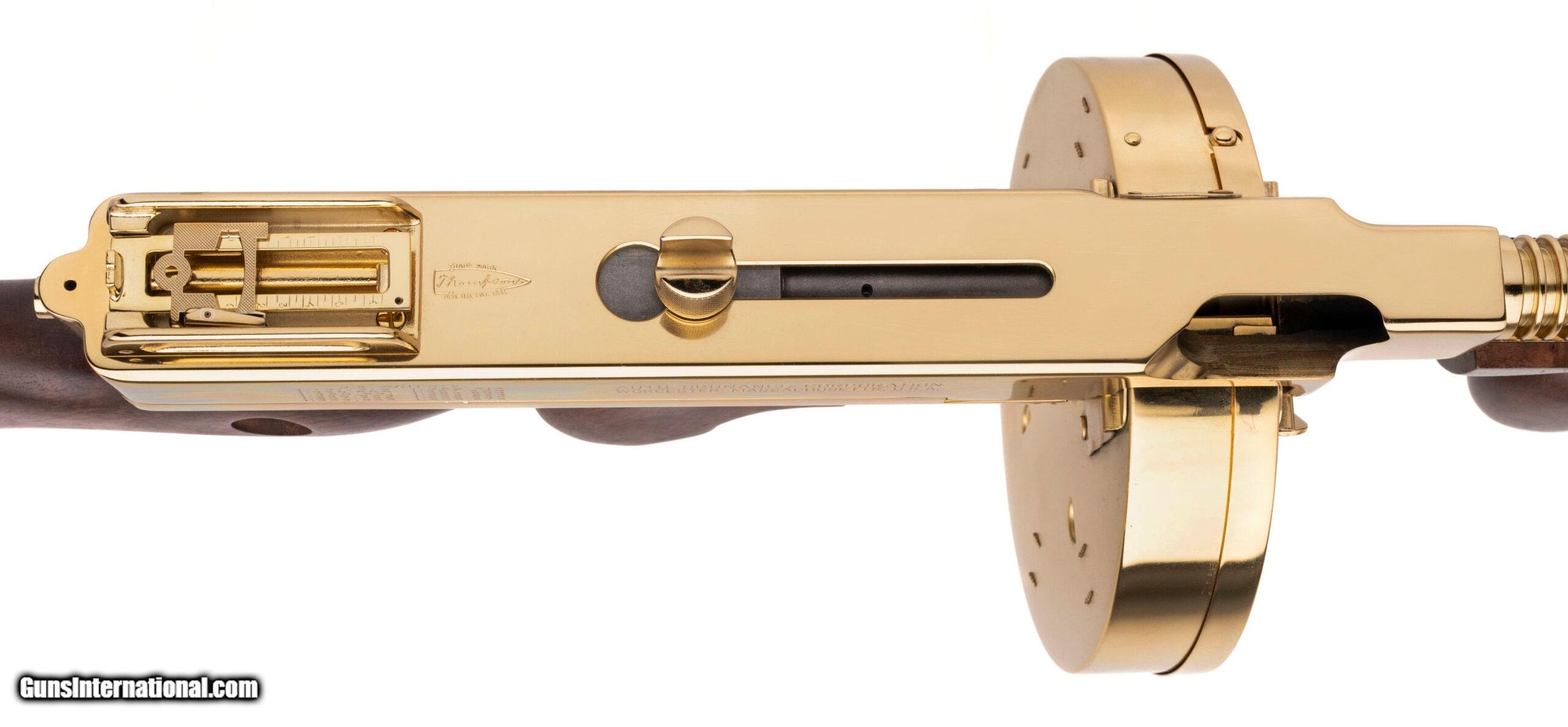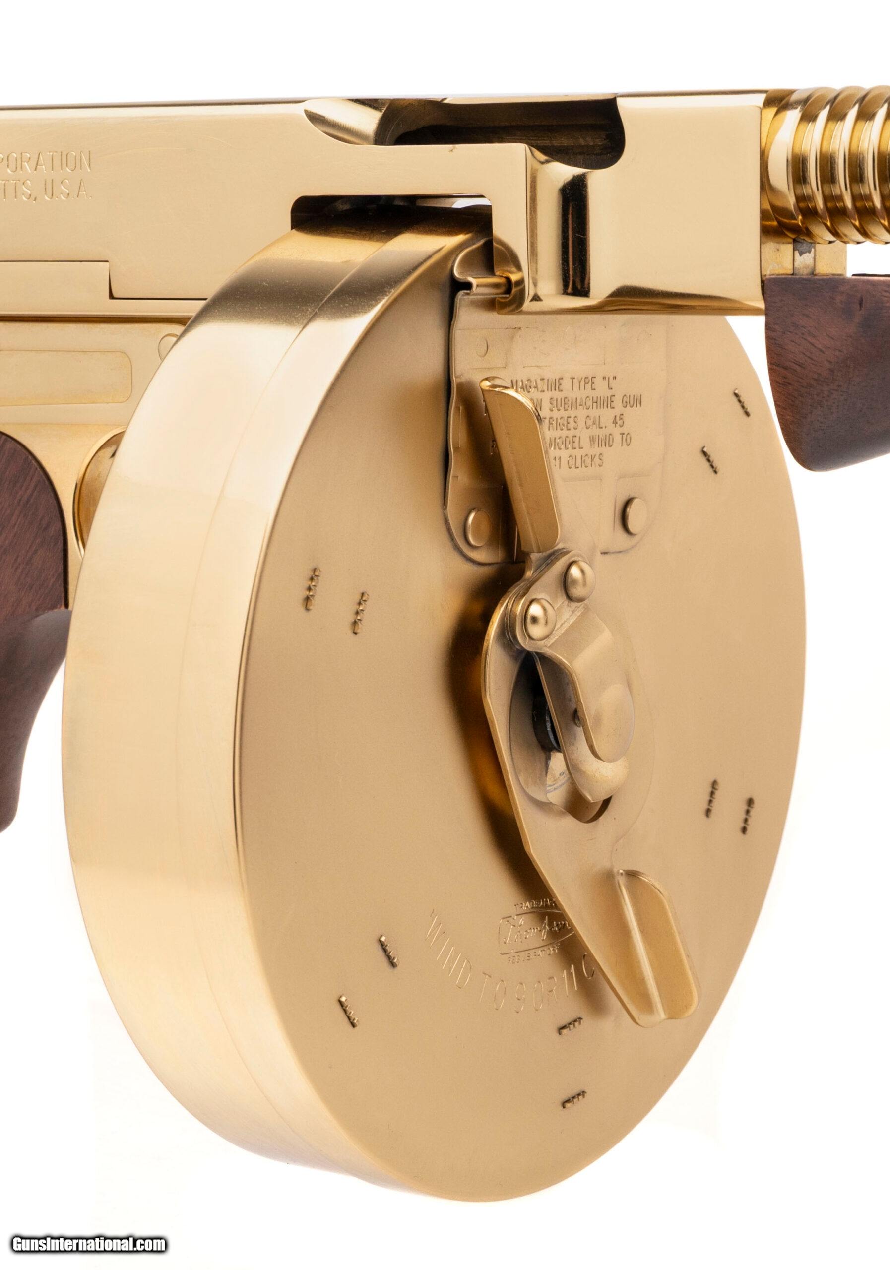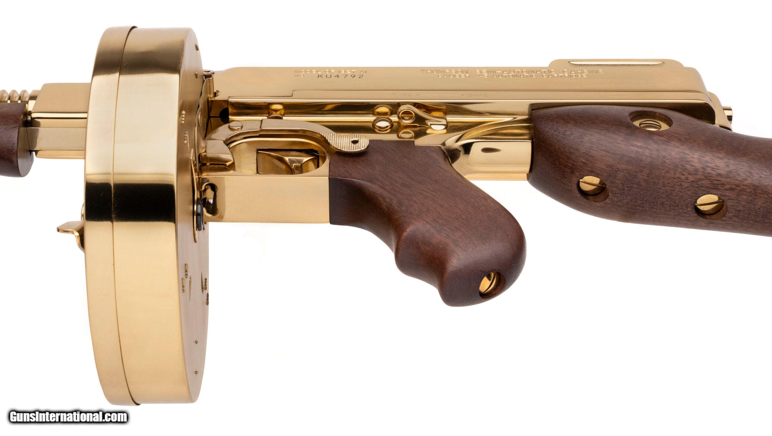 Description: "SN: KU4792. Modern production, .45 with a 16"" barrel. Bore is bright with strong visible rifling. Beautiful gold plated semi-auto Tommy Gun with wood furniture. Excellent condition overall. Comes with case and gold plated stick mag & drum mag. Price: $3,995.00 Contact Seller |
