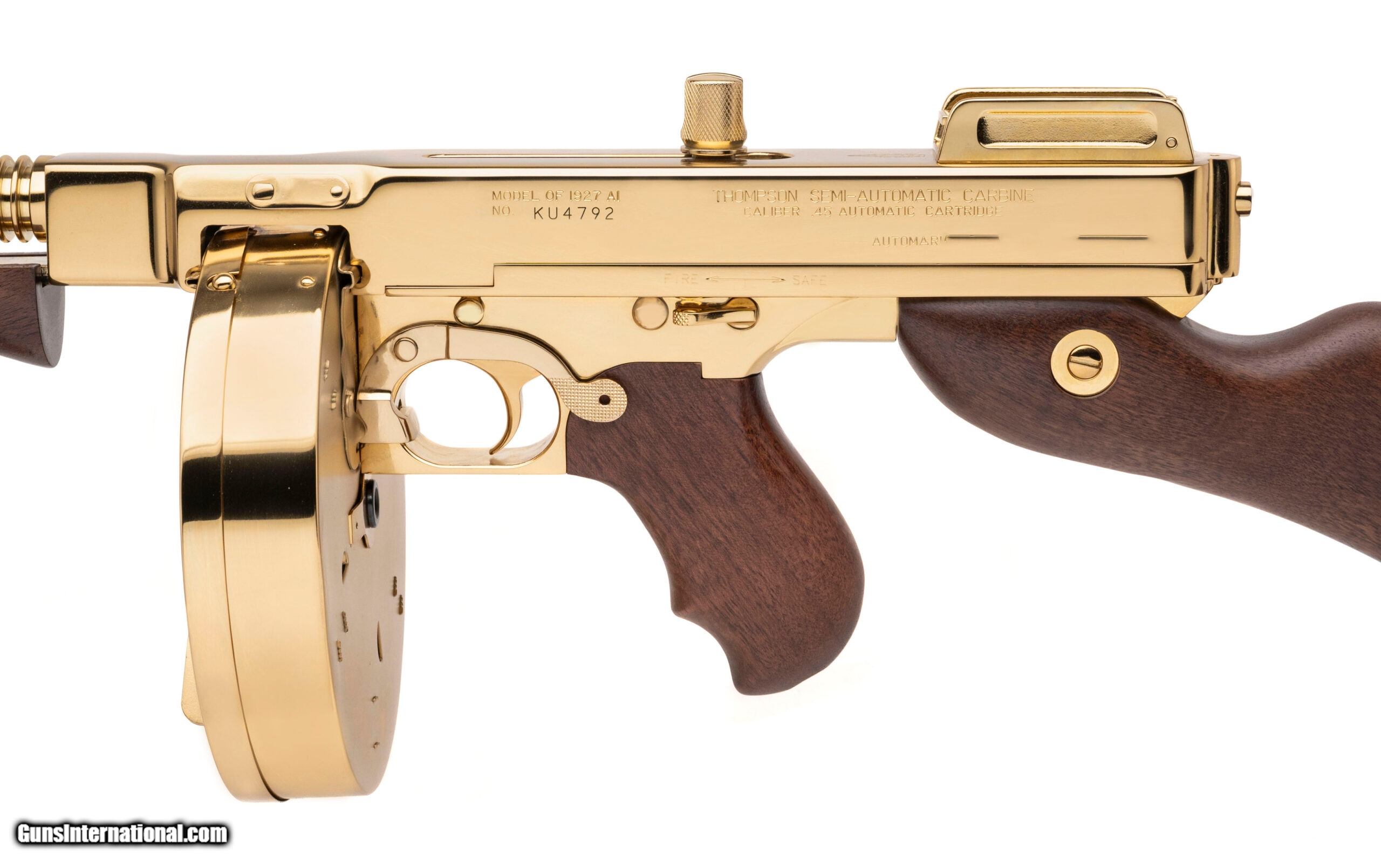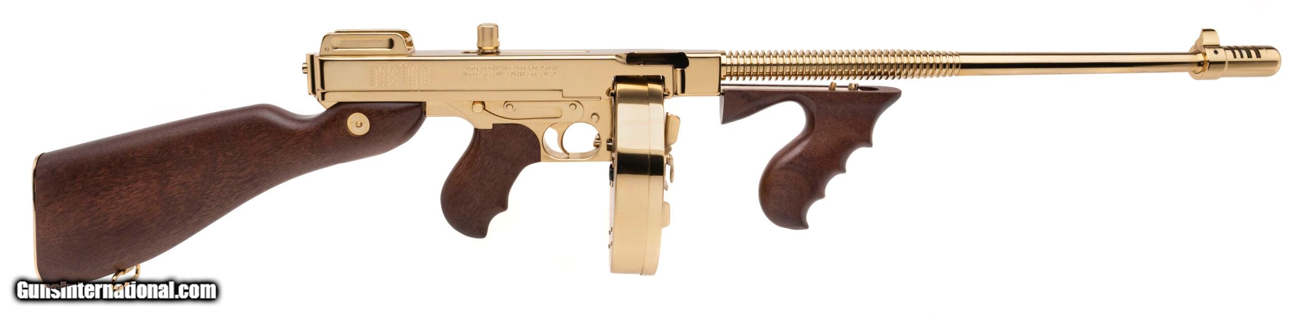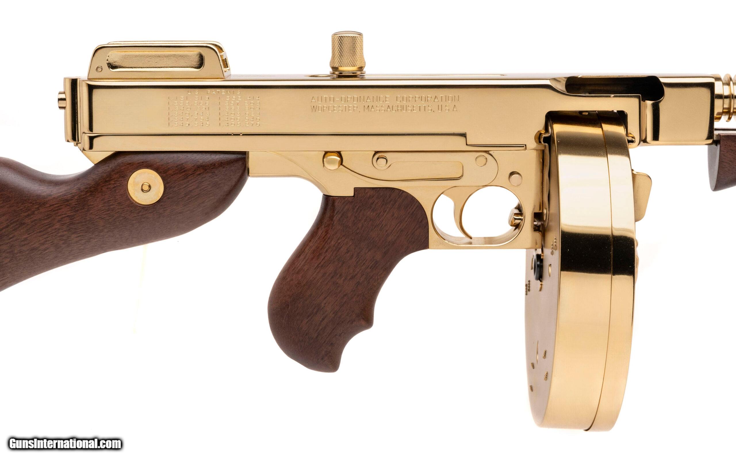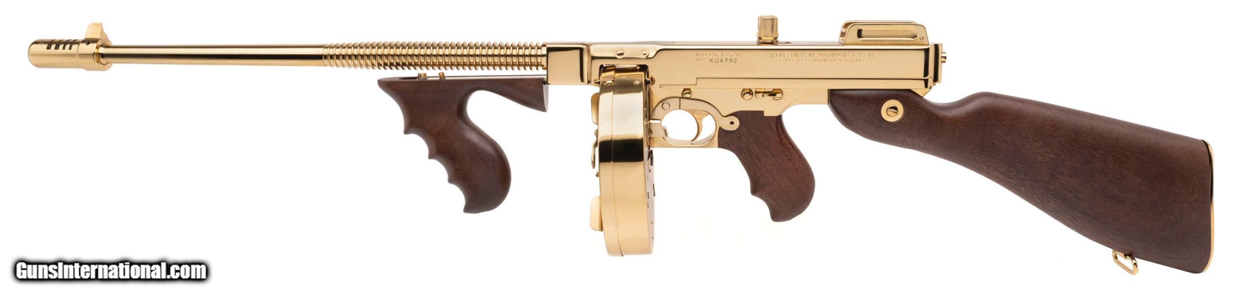 Description: "SN: KU4792. Modern production, .45 with a 16"" barrel. Bore is bright with strong visible rifling. Beautiful gold plated semi-auto Tommy Gun with wood furniture. Excellent condition overall. Comes with case and gold plated stick mag & drum mag. Price: $3,995.00 Contact Seller |