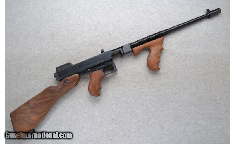 Description: This Auto Ordnance Model 1927 A1 .45 ACP comes with a 50 round drum magazine and a 30 round stick magazine. In like new condition this Thompson Chicago Typwriter comes with a foam lined guitar carry case and a hard black plastic case fitted for the gun and magazines. With gun lock and manuals. This is a classic replica of the gun used at the St. Valentine's Day massacre in Chicago, IL. 1929. SOLD Caliber Info: .45 ACP Chambers: 50 round drum magazine. 30 round stick magazine. Metal Condition: Excellent. Wood Condition: Excellent. Bore Condition: Excellent. Barrels: 18 inches finned and threaded with the compensator. Stock: Smooth walnut grip buttstock. Smooth walnut grip full pistol grip. Stock Dimensions: LOP 17 1/8 inches. Fore End: Smooth grip walnut with finger grooves. Butt Pad: Black steel plate. Weight: 11 lbs. 5 oz. Sights: Blade front. Folding adjustable ladder type rear. Item Location: Richfield, WI |