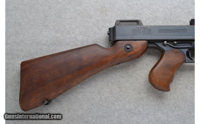 Description: This Auto Ordnance Model 1927 A1 Thompson Automatic Carbine is a semi-automaic .45 Cal. classic firearm. It comes with two 50 round drum magazines in a hard case. In overall very good condition it comes as is. SOLD Caliber Info: .45 Auto Chambers: Two 50 round drum magazines. Metal Condition: Very good with a few light handling/use marks. Wood Condition: Very good with light handling marks. Bore Condition: Excellent. Barrels: 16.5 inch finned barrel with compensator. Stock: Smooth grip walnut butt. Smooth grip walnut full pistol grip with finger grooves. Stock Dimensions: LOP 16 3/4 inches. Fore End: Smooth grip walnut with finger grooves. Butt Pad: Smooth steel plate with a trap door compartment. Weight: 11 lbs. 8 oz. with out a magazine. Sights: Blade front. Folding adjustable rear sight. Item Location: Richfield, WI |