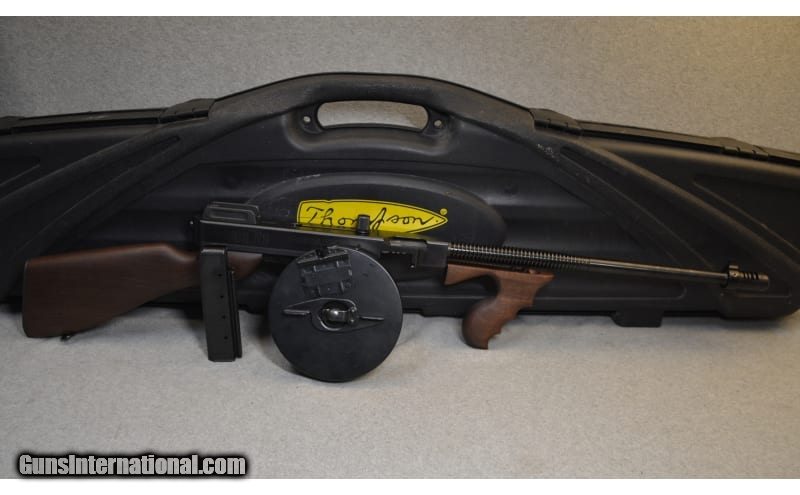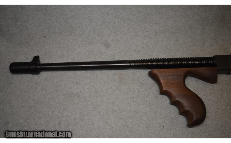 Description: This is an Auto Ordnance (Thompson) model 1927 A1 semi-auto rifle with a 16" barrel in .45 Auto. Overall, this rifle is in outstanding condition. There are no large handling marks but there are some tiny markings on the stock. The metal on this rifle is in excellent condition. This rifle does come with its original hard case, a drum magazine and box magazine, as pictured. This would make a great addition to any collection. .45 Auto SOLD Barrels: 16 inch Item Location: Hazelwood, MO |