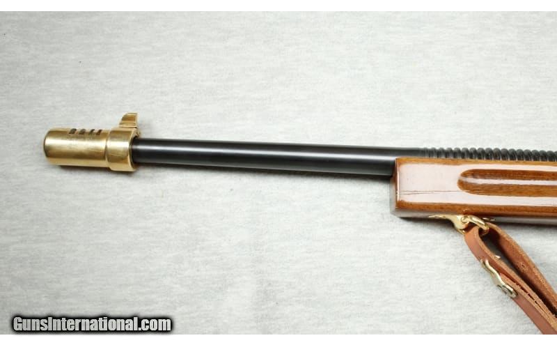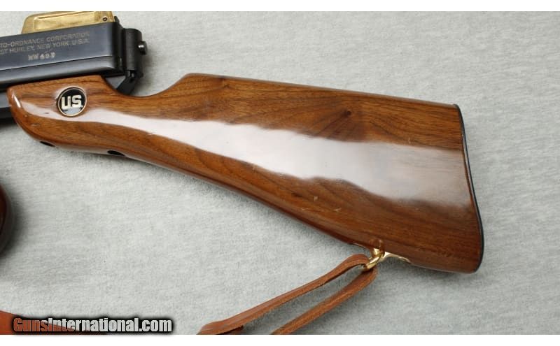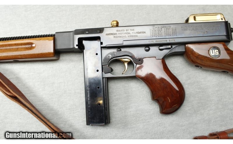 Description: Auto Ordnance Thompson 1927A1 WWII Commemorative in .45 ACP. The classic Thompson SMG look in a collectible, semi-auto variation with beautiful gold accents commemorating WWII. High quality wood furniture with a deep gloss, sporting several medallions, in a striking black & gold pattern. Blued barrel with classic fins and it is terminated with a gold plated Cutts style slotted compensator with fixed blade front sight. Slotted gold-plated charging knob on top of receiver. Gold plated, graduated rear ladder & peep sight. Gold plated trigger. 1927 Style receiver will accept stick mags. or drums. Gold plated sling swivels front & rear w/ high quality leather sling. It has 1-20 round mag, a hardwood & glass display box with an embellished American Historical Foundation brass plaque. .45 ACP SOLD Metal Condition: Excellent Wood Condition: Very good - Crack on the right side of stock and minor handling marks Bore Condition: Bright Barrels: 18 Inches Triggers: Factory - Gold Stock Dimensions: LOP 17 Inches Fore End: Grooved walnut Butt Pad: Metal plate with storage door Weight: 11 lbs 10 oz Item Location: La Vista, NE |
