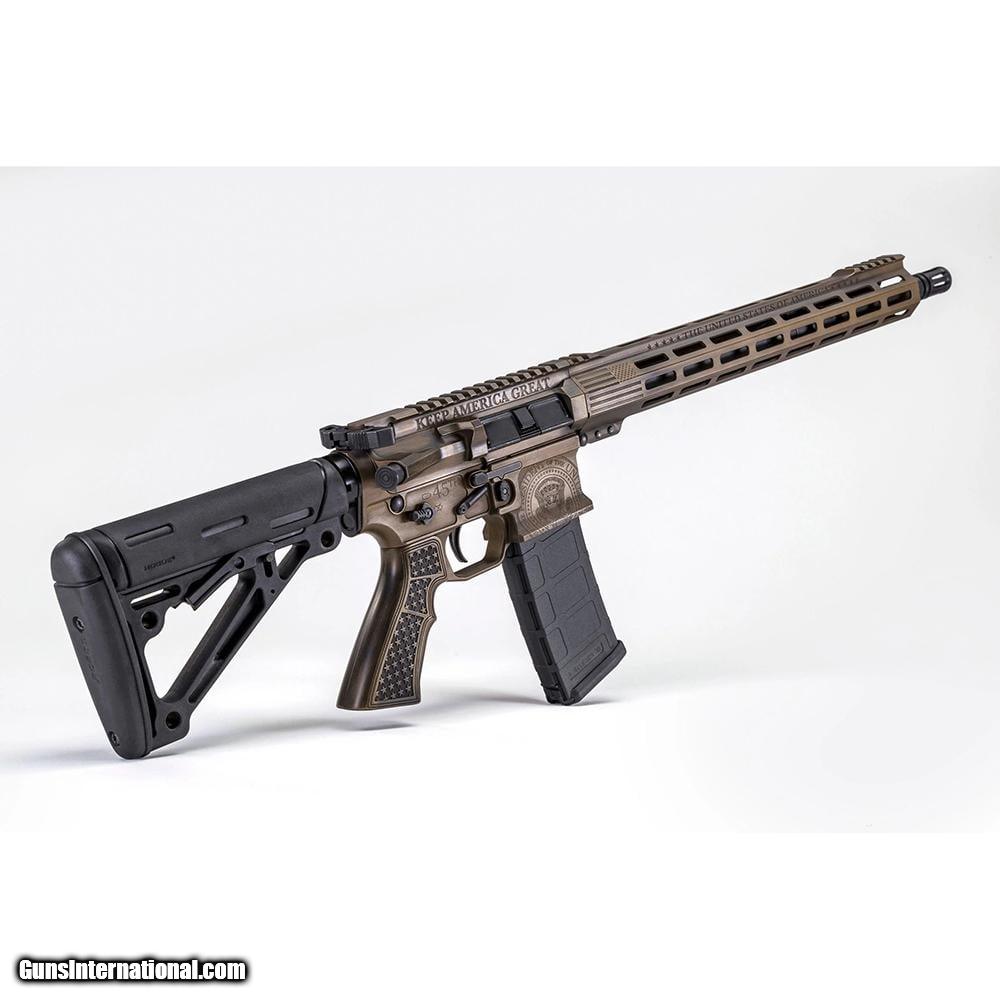 Description: Guns Listing ID: 306708 Kahr Firearms Group and Auto-Ordnance continue its series of President Donald Trump commemorative firearms, with the \"Commander in Chief\" custom AR15 rifle. This elaborately finished and engraved rifle honors the patriotism of the 45th President, and his determination to \"Keep America Great\". This motto is engraved on the right side of the upper receiver, and \"The United States of America\" on the aluminum free floated, M-Lok forearm. The left side of the upper receiver is engraved with President Trump‚‚s name and title, \"Commander in Chief\" of the Armed Forces. The lower receiver has beautiful relief cuts, along with \"45th\" noting his position in our nation‚‚s long line of presidents. The American flag, and a star pattern are detailed on the grip and forearm. The president‚‚s likeness in front of the White House adorn the left magazine well, with the Presidential Seal on the right. \"In God We Trust\" is placed on the forward assist housing. Each Commander in Chief AR15 is built on billet aluminum upper and lower receivers. The pistol grip and stock are by Hogue. The finish is Burnt Bronze and Black Cerakote. The rifle barrel is 16\", 1 in 8 twist, nitride coated, and chambered in 5.56. One 30 round Magpul P-Mag is included. As a limited edition piece, only 500 production models are available. The Commander In Chief custom by Auto-Ordnance and Kahr Firearms group. The rifle features a custom machined billet upper and lower receiver set along with a minimalist style handguard with a partial picatinny rail for reduced bulk and increased comfort. This firearm is a custom work and may exhibit variations in the finish and color patte SOLD Manufacturer: AUTO-ORDNANCE Model: AR15 (COMMANDER IN CHIEF CUSTOM) Caliber Info: 5.56X45MM NATO Condition: new Barrels: 16 BARREL Action: DIRECT IMPINGEMENT Finish: CUSTOM CERAKOTE Weight: 6.4 LBS. |