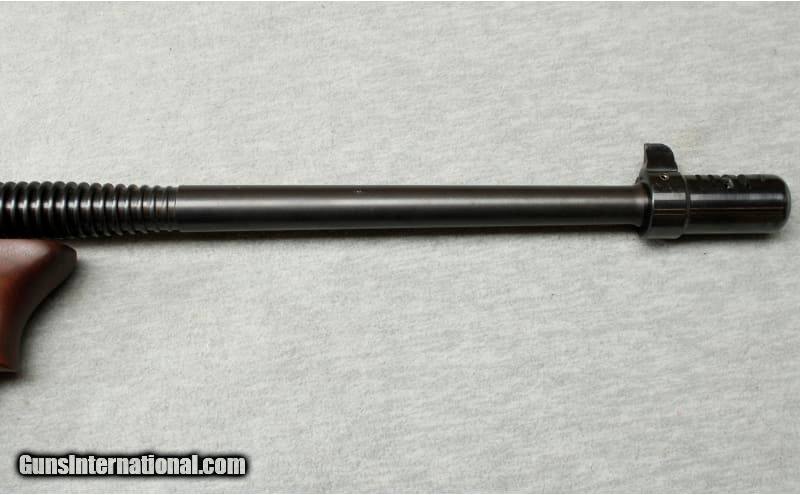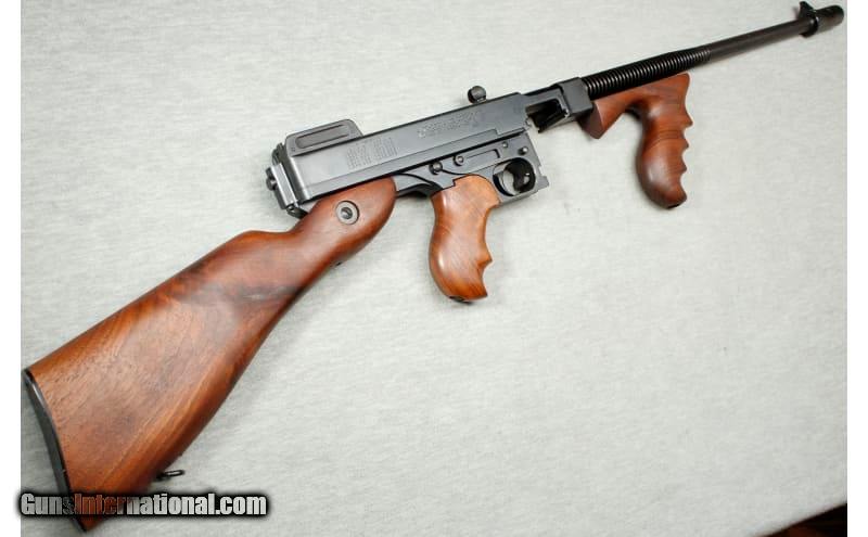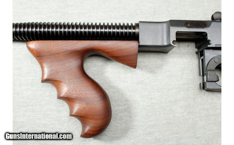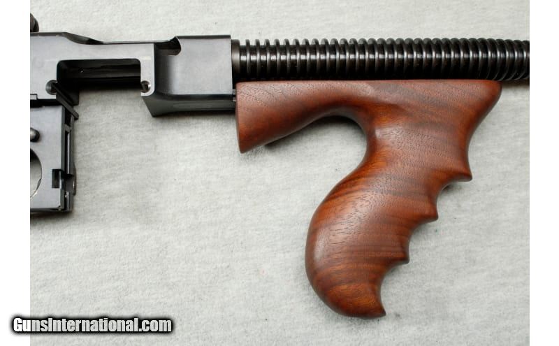 Description: For more than 100 years, the "Chicago Typewriter®", the time-honored submachine gun, has been a favorite among collectors and shooting enthusiasts. The .45 ACP caliber Thompson 1927A-1 has a pinned Cutts compensator, which lengthens the finned barrel length to 18". They have a blade front and open rear adjustable sight. The fixed stock is crafted in luxurious polished American Walnut and has a vertical foregrip. This example looks like it hasn't been used much. .45 Auto SOLD Metal Condition: very good Wood Condition: very good Bore Condition: bright Barrels: "16.5"", Finned (with compensator 18.5"") Stock Dimensions: 17.5" Walnut fixed stock and vertical foregrip Butt Pad: metal Weight: 11 lb - 10 oz Sights: "Blade front, open rear adjustable Item Location: La Vista, NE |