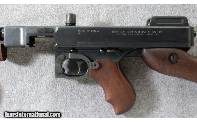 Description: If you always wanted a Tommy Gun; here it is. This Auto Ordnance semi-automatic version of the Thompson 1927 A1 comes with a 20 round stick magazine. .45 ACP SOLD Metal Condition: Excellent Wood Condition: Very good with scratches and dents Bore Condition: Excellent with signs of use Barrels: 16.5 inch barrel Stock Dimensions: 17 inch LOP Weight: 12 lbs. 6 oz. Sights: Ladder rear sight with blade front Item Location: Lehi, UT |