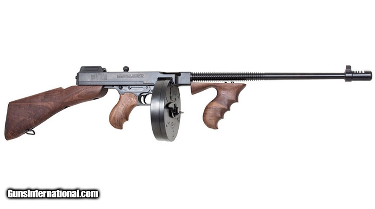 Description: Manufacturer: Auto-Ordnance / Thompson / Kahr Arms Model: Thompson 1927A-1 Deluxe SKU: T1B50D Caliber: .45 ACP / AUTO Capacity: (1) 50 Round Drum and (1) 20 Round Stick Magazine Barrel: 16.5", Finned (with compensator 18") Weight: 13 lbs Overall Length: 41" overall / 31.5" (without buttstock) Sight: Blade front sight, open rear adjustable Stock: Walnut Detachable Buttstock, Vertical Foregrip All items are factory new in box unless otherwise stated. Based on the information available to us, the above specifications describe this item to the best of our knowledge. For further information, please contact or visit the manufacturer's . SOLD |
