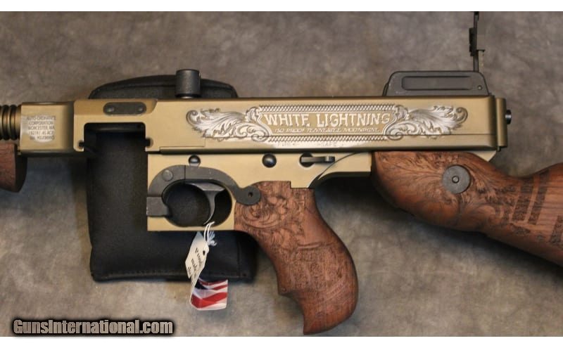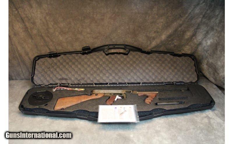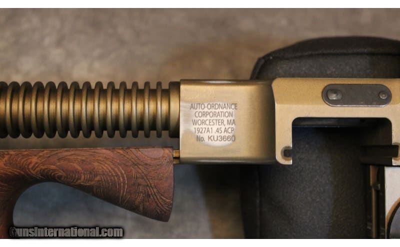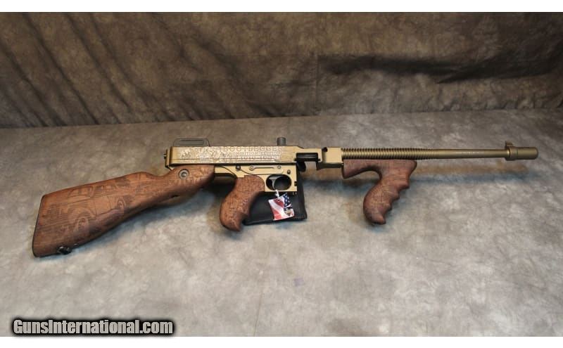 Description: This Bootlegger edition Auto Ordnance Thompson 1927A1 is in overall excellent condition. It shows no discernable evidence of use. It would make a great addition to a collection. .45 ACP SOLD Chambers: .45 ACP Metal Condition: Excellent Wood Condition: Excellent Bore Condition: Excellent Barrels: 16.5 Triggers: Blued steel Fore End: Walnut Butt Pad: Blued steel Weight: 12.5 Lbs Sights: "Open rear adjustable, pinned front blade Item Location: Columbia, MO |