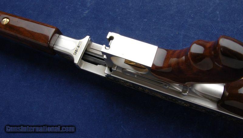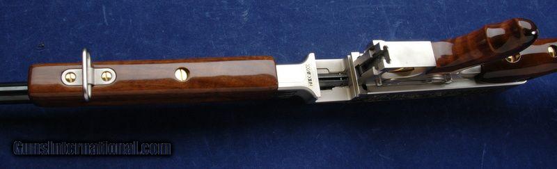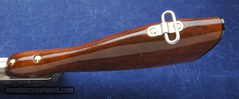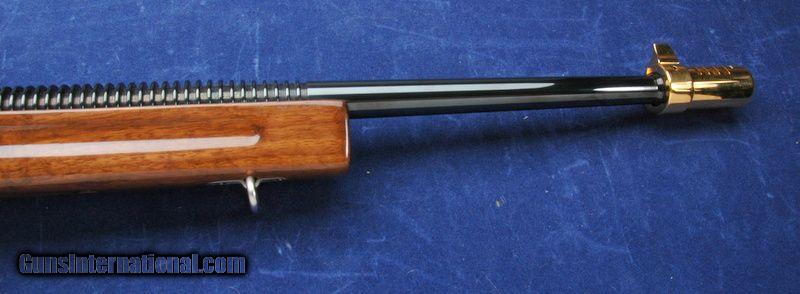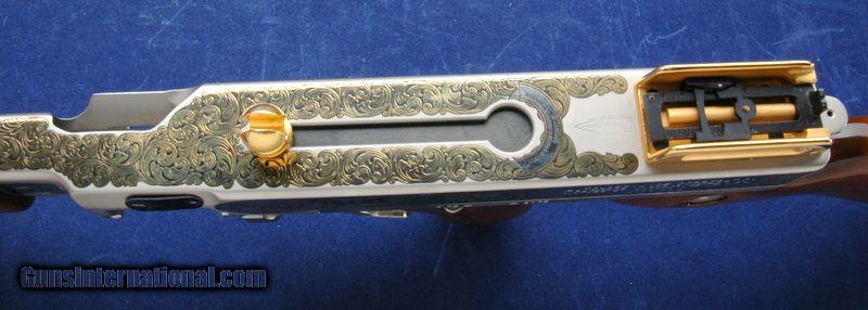 Description: This Auto Ordnance Commemorative is mostly nickeled with gold plated features. On the right side of the rec'r is engraved "Freedom Is Never Free", "Saluting America's Soldiers Defending Freedom" and "American Freedom Tribute". In between are various battle scenes from WW2, Korea and Viet Nam. Polished and highlighted with gold. The original Thompson muzzle break is also gold plated, as is the rear sight base. On the top of the rec'r is lots of scroll engraving that is also gold plated, along with the Armed Forces Commemorative Society seal. On the left side of the rec'r is a scroll with "Lest We Forget". More battle scenes and more scroll work featuring "Saluting America's Soldiers Defending Freedom", and "Saluting America's Armed Forces". Stock, and grip screws also gold plated as is the trigger and cocking knob.. Barrel and buttplate are a deep blue. Note that this rifle comes with the original nickel plated 30 rnd stick mag, plus 3 mag pouches that hold 8 30 rnd mags each. So 24 additional used 30 rnd mags, various conditions and manufacturors. Mostly ww2 mags. These mags can only be transferred if the rifle is sold to an out of state customer. There are a couple of scuffs on the buttstock that are visible in the pic showing the right side of the buttstock. There is no display case or box. In order to protect your investment, all long guns over $500 must be shipped in a hard case. Minimum shipping at this level is $55 and includes the hard case. Shipping cost could increase depending on value or weight of the firearm. For long guns less than $500, we still recommend the purchase of a hard case, again to protect your investment. These numbers are for shipping to the lower 48. There is also a 3% surcharge for customers using a credit card on internet sales. Thank you! SOLD |