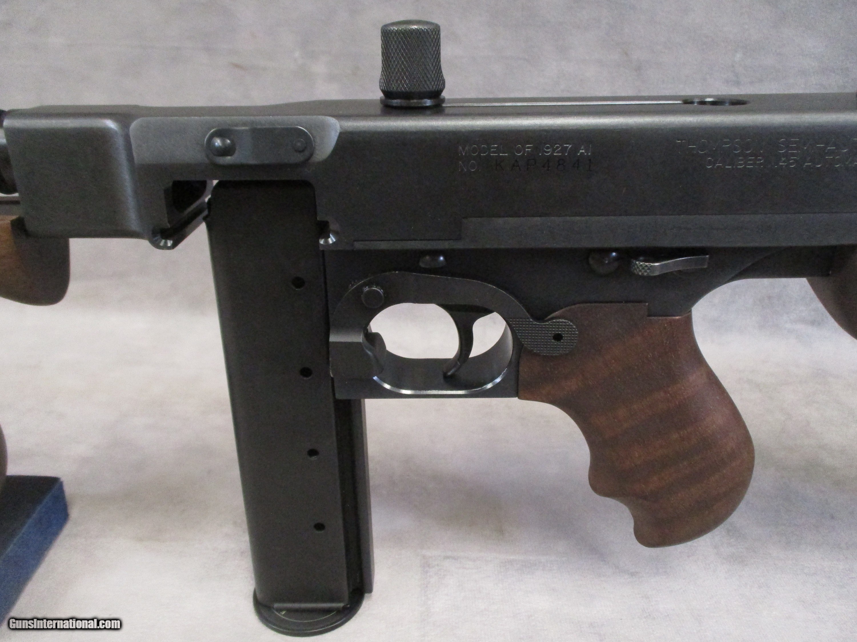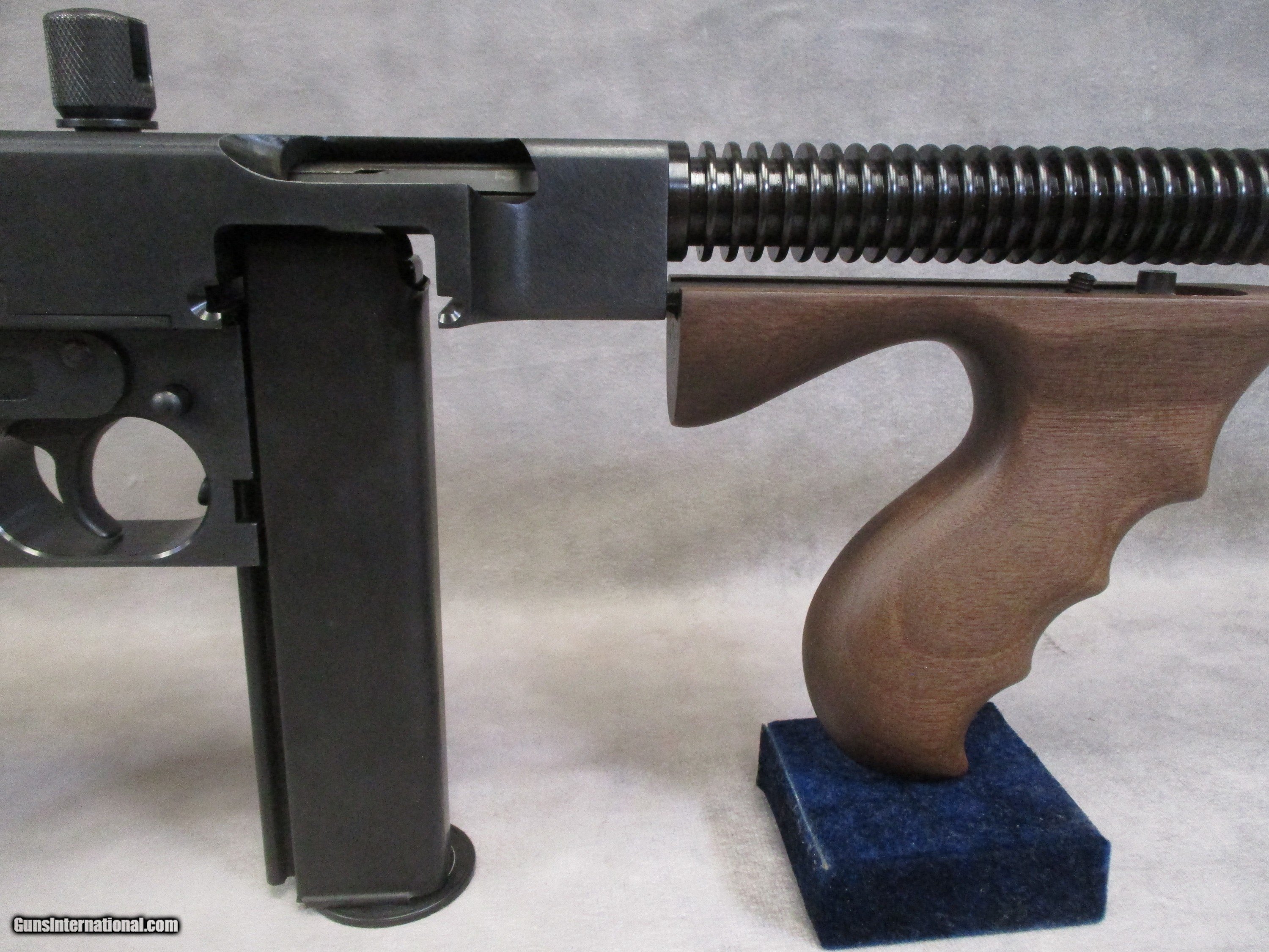 Description: This is a fairly accurate representation of the original 1920s era Thompson Sub-Machine Gun. It of course uses a longer barrel to meet NFA requirements. The gun also fires from a closed bolt rather than the original’s open bolt design to prevent illegal full auto conversions. This example is indeed brand new in the box, though there is one small blemish. There is a small spot of patina on top of the compensator; otherwise, the finish is as it should be. The M1927A1 is a popular firearm thanks to its very close appearance to the original Thompson sub-gun as it appeared in the late 1920s. Other versions are also available, one of which nearly duplicates the appearance of the U.S. Army’s Thompson M1A1 sub-guns used during the Second World War. The difference is in the longer barrel. Some versions have a 14.5 inch barrel with a pinned compensator for an overall length of 16.0 inches. This keeps them from being classified as short-barreled rifles. The Thompson Sub-Machine Gun was originally created by Brigadier General John T. Thompson to replace the longer rifles then in service, such as the ’03 Springfield rifle. While in hindsight this would not have worked due to the sub-gun’s short effective range, it did point the way towards the future of military arms with respect to full-auto rifles. The trench fighting which in World War One certainly indicated the need for a compact (compared to the rifle), fully automatic weapon for use in confined spaces. The appearance on the battlefield of the famous German SMG, the Schmeisser MP18, could only have validated the existence and need for BG Thompson’s weapon in the eyes of other Army generals and the Ordnance Dept. Ultimately, the Thompson would see use in many conflicts worldwide, similar to the later AK47. One advantage that the older versions of the Thompson had over the later M1A1 was the vertical grip. This allowed for far better control when firing the gun. The simple horizontal grip on the M1A1 gave that SMG its one notable flaw, a tendency to “buck up” when fired in longer bursts. The M1A1 was also limited to its stick magazines and could not use the drum magazine. Since the drums were usually unreliable in mud and dirt, this was not as much of a handicap as it sounds. One very important component that comes with the 1927A1 is what is known as the “third hand”. This is a tool that is 2.12 inches long, 0.468 inches wide, and 0.19 inches thick. The lower portion of the piece of steel is drilled through, the slot taking the form of a medicinal “pill”. The slot is 0.750” long and 0.380” wide. The top of the third hand has beveled edges for easier insertion. Since the 1927A1 is a closed-bolt gun, rather than the open-bolt type like the originals, this creates as problem for the insertion of the drum mag as the bolt is partially in the way. There is also no way for the drum mag to hit the bolt-hold-open lever when the last round is fired. By comparison, the stick mag is inserted vertically, making use of the T-shaped rib on the back of the magazine body to trip the bolt hold open lever. The drum on the other hand, because it is inserted from the side, does not have any component which contacts the bolt catch lever. This is where the third hand comes in. It is inserted (bevel end first) into the same slot the stick mag’s T-rib fits into. Pushed up all the way, it will allow the user to lock the bolt back to insert or remove the drum magazine. The slot allows the nose of the magazine catch to pass through the third hand, keeping it in place with it enough vertical movement remaining to allow for the bolt to be locked back or released. The M1927A1 Deluxe shown here is part of a kit which includes the carbine’s original case, a 1920’s style “violin case”, one 20-round stick magazine, and one 50-round drum mag. SOLD Handgun Caliber: .45 ACP (.45 Auto) Manufacturer: Auto Ordnance Model: M1927A1 Deluxe Carbine Serial Number: KAP4841 Bore: Rifled, 1:16 inches (1 in 406 mm) RH twist Ejectors: Auto-ejection Condition: New in Box Barrels: Carbon Steel Barrel Type: Finned Action: Semi-automatic, closed bolt Triggers: Standard Stock: American Walnut, separate shoulder stock and pistol grip Fore End: American Walnut, Classic Foregrip Butt Pad: Metal plate LOP: 17.0 inches (432 mm) Finish: Blued Weight: 13.0 lbs. Sights: Open rear with adjustable ladder, blade front, sight radius 28.0 inches (710 mm). Extras: See description Case: Auto Ordnance factory case |