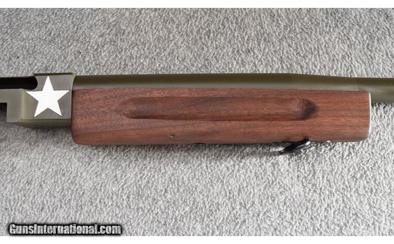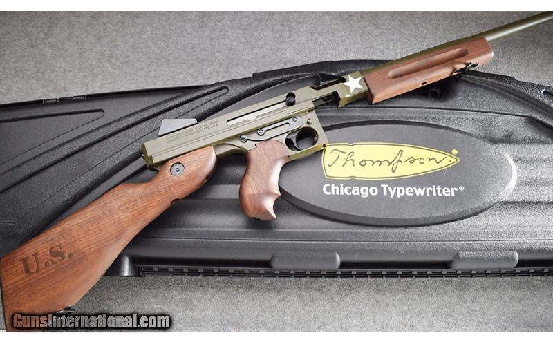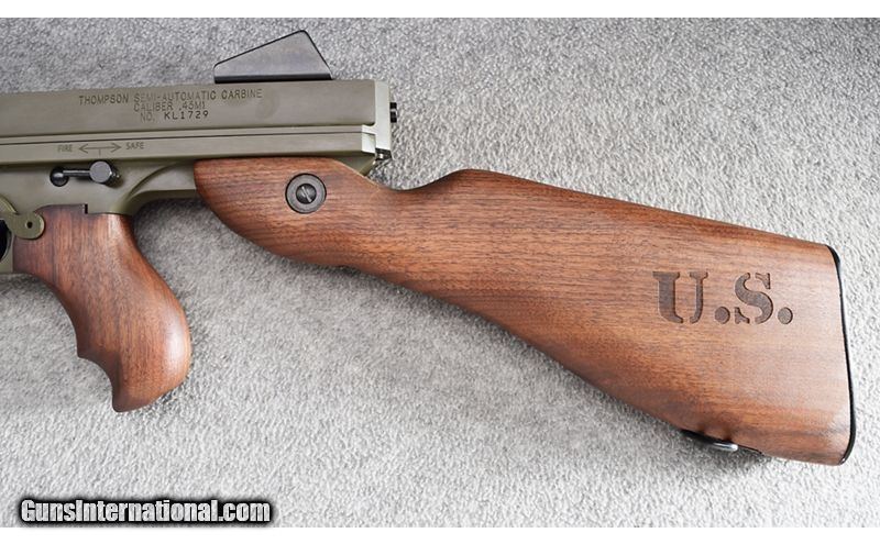 Description: This Auto Ordnance is a WWII Tanker Thompson replica manufactured in 2019. Sherman tank star is engraved on both sides of receiver. Barrel and receiver are painted in OD green cerakote finish. Gun is in excellent condition throughout showing only light use. Complete with case, sling, one 20 round and one 30 round stick mags, 3 stick magazine pouch and original paperwork. Very cool gun! .45 Auto SOLD Metal Condition: Excellent Wood Condition: Excellent Bore Condition: Excellent Barrels: 16 1/2 Triggers: Factory Stock Dimensions: 17 1/4" LOP Fore End: Uncheckered Walnut with Walnut Grip & Uncheckered Walnut Finger Groove Forend Butt Pad: Uncheckered Metal Butt Plate Weight: 11 lb Sights: Blade Front - Military Aperture Rear Item Location: Wheeling |