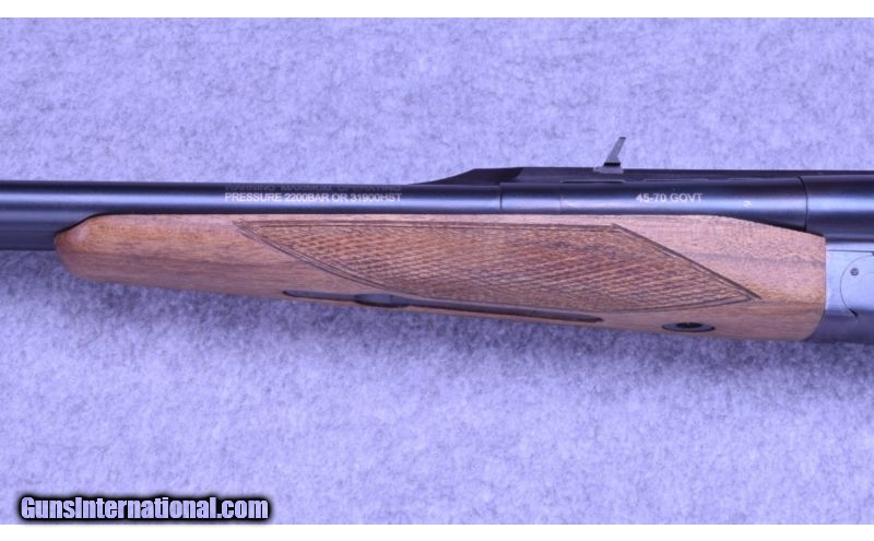 Description: Excellent throughout showing little to no use. No box. SOLD Manufacturer: S/N 12221XXXXXB Caliber Info: .45-70 Gov't. Metal Condition: Excellent Wood Condition: Excellent Bore Condition: Excellent Barrels: 23 1/2 Triggers: Double Stock: Checkered Hardwood Pistol Grip Stock Dimensions: 14 1/8" LOP Fore End: Checkered Hardwood Butt Pad: Black Vented Rubber Weight: 6 1/2 LB Sights: Post Front - Notch Rear Item Location: Wheeling, WV |