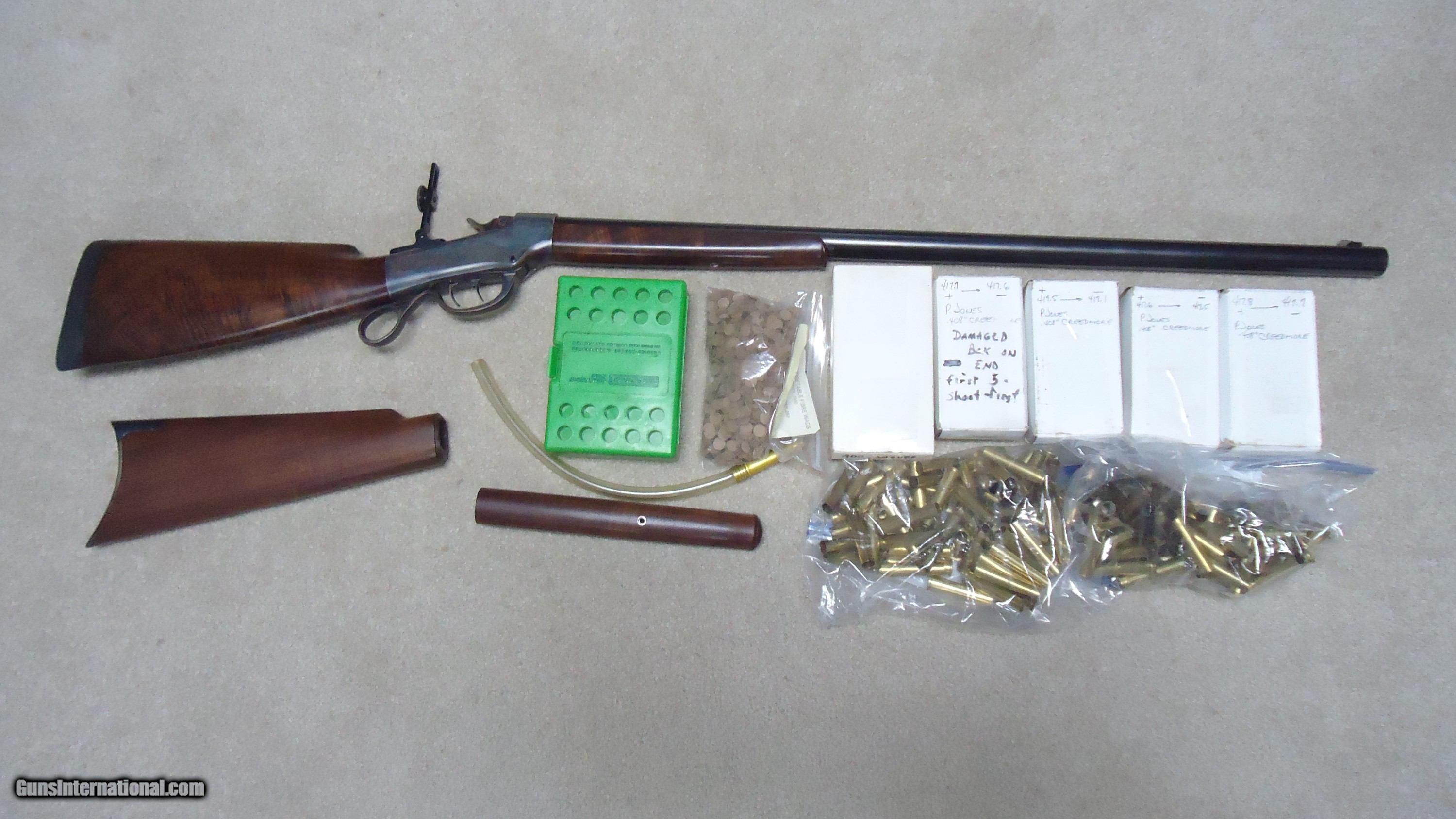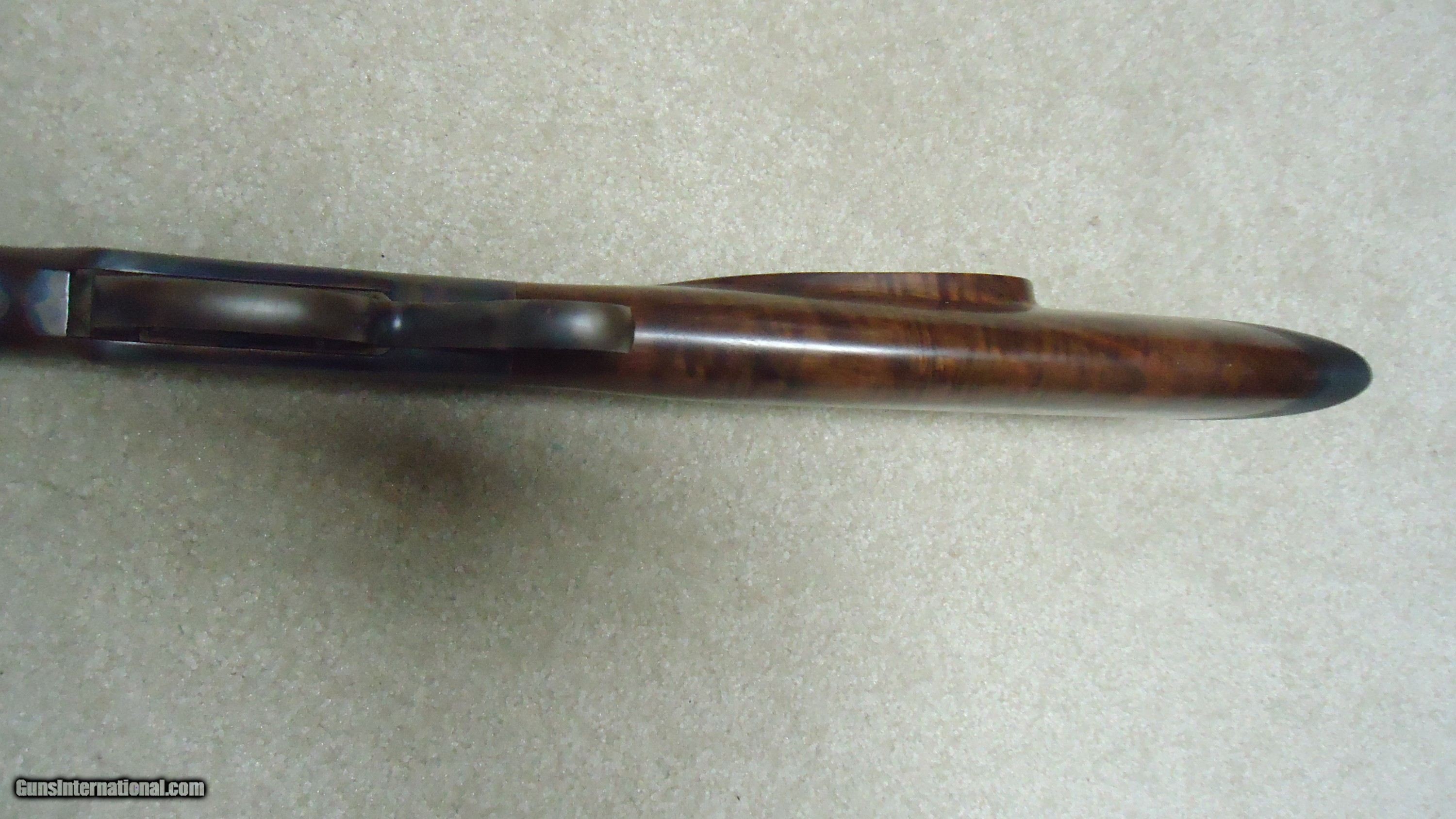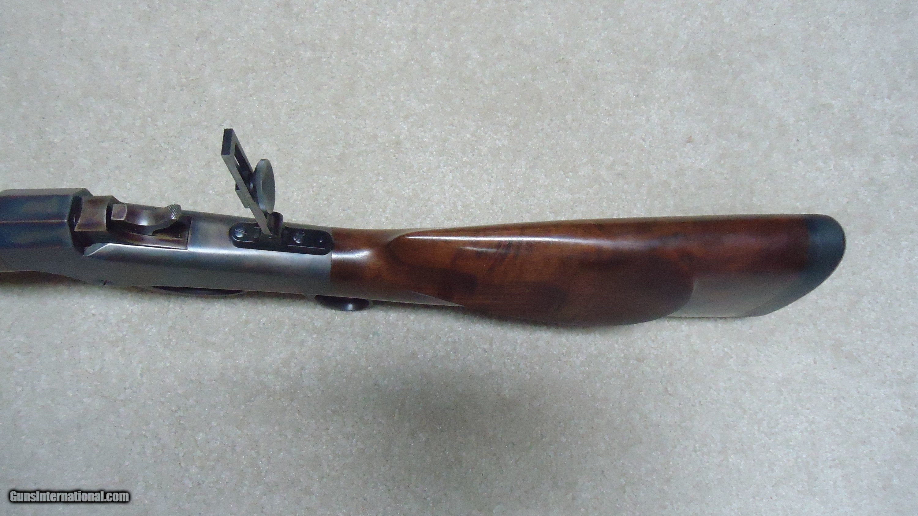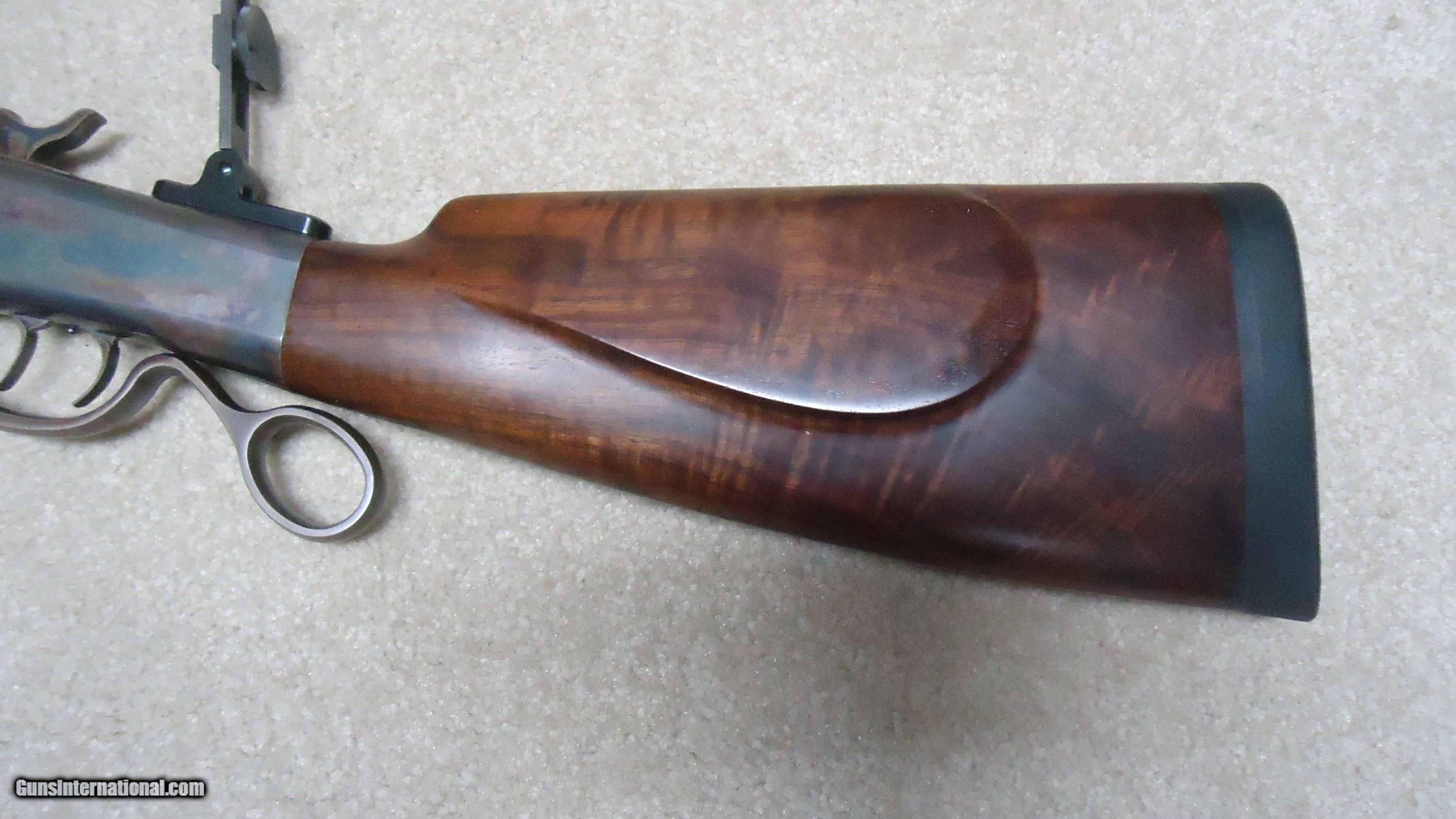 Description: BALLARD RIFLE AND CARTRIDGE, CODY, WYOMING MADE No. 1 3/4 "FAR WEST" SPORTING RIFLE, .40-65 CALIBER WITH EXTRAS. Superb quality unfortunately no longer made, this one features double set triggers, 30" round barrel, beautifully color cased receiver with ring lever, sporting tang sight with Rocky Mountain blade front sight and no rear barrel dovetail. Extra fancy rich walnut stock with cheek piece and matching forend- stock measures 14" length of pull from the center of the black Pachmayr Decelerator pad to the front trigger. Rifle weighs just under 11 1/2 lbs. and appears about new condition inside and out. Comes with standard extra cresecnt butt plate sporting stock and matching forend, Reddiong .40-65 loading dies, 200 415 gr. P. Jones .408" Creedmoor bullets, 50 400 gr. Snover bullets, 115 cases perfectly formed from W-W .45-70 brass, blow tube and a bag of .060" Walters vegetable fiber wads. All for $3750. SOLD Rifle Caliber: .40-65 Winchester Manufacturer: BALLARD RIFLE/CTGE. Model: 1 3/4 FAR WEST Serial Number: C7XX Barrel Length: 30 Condition: LIKE NEW |