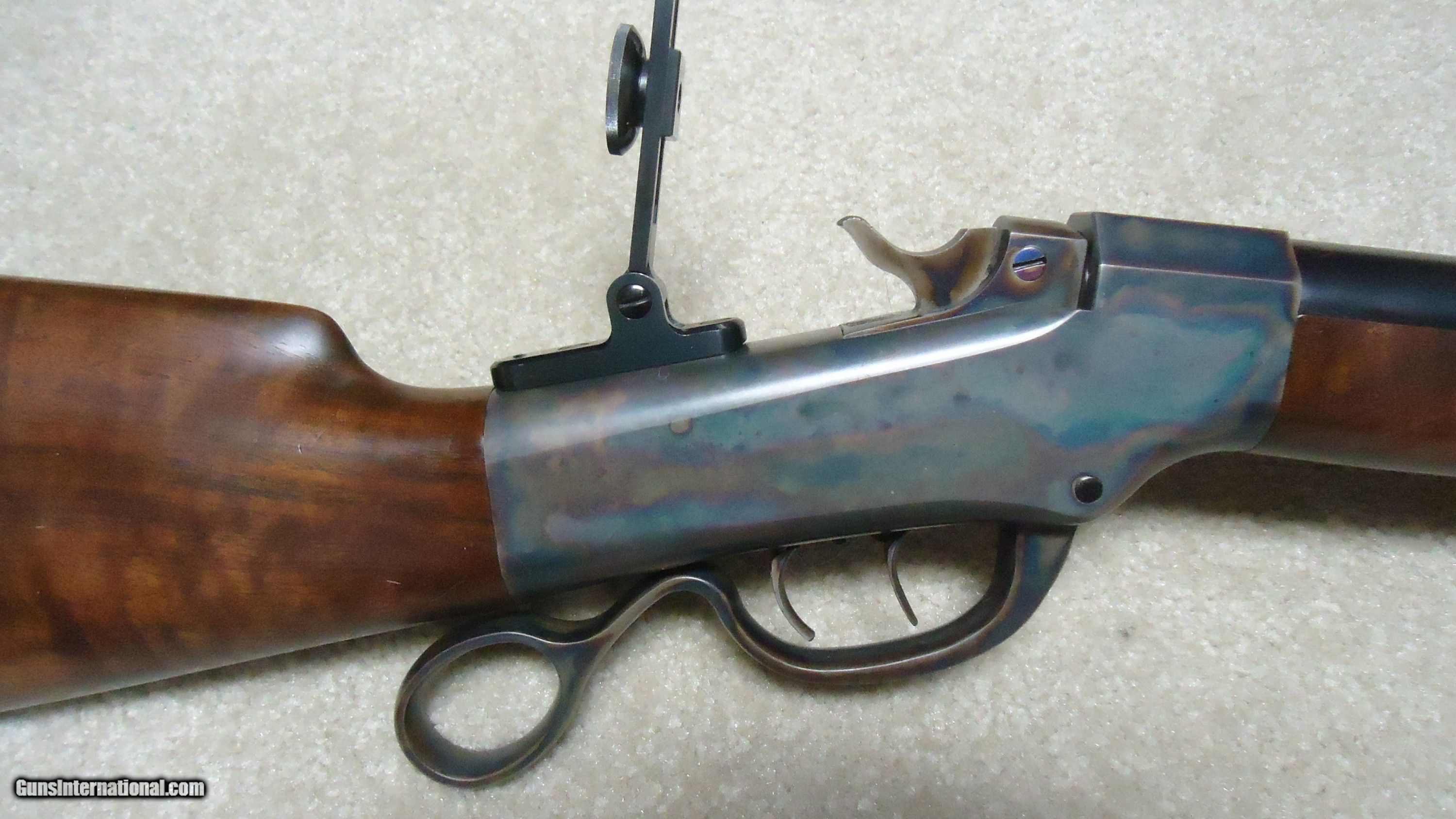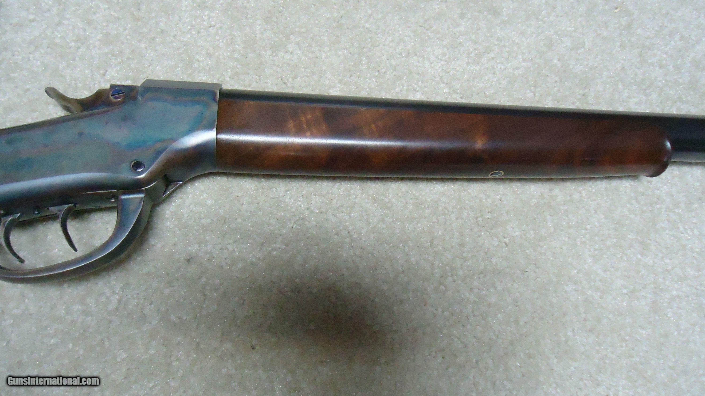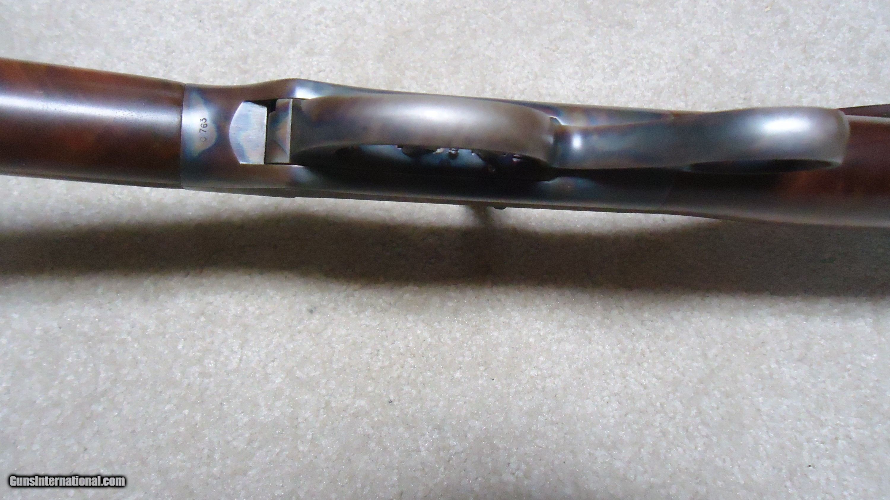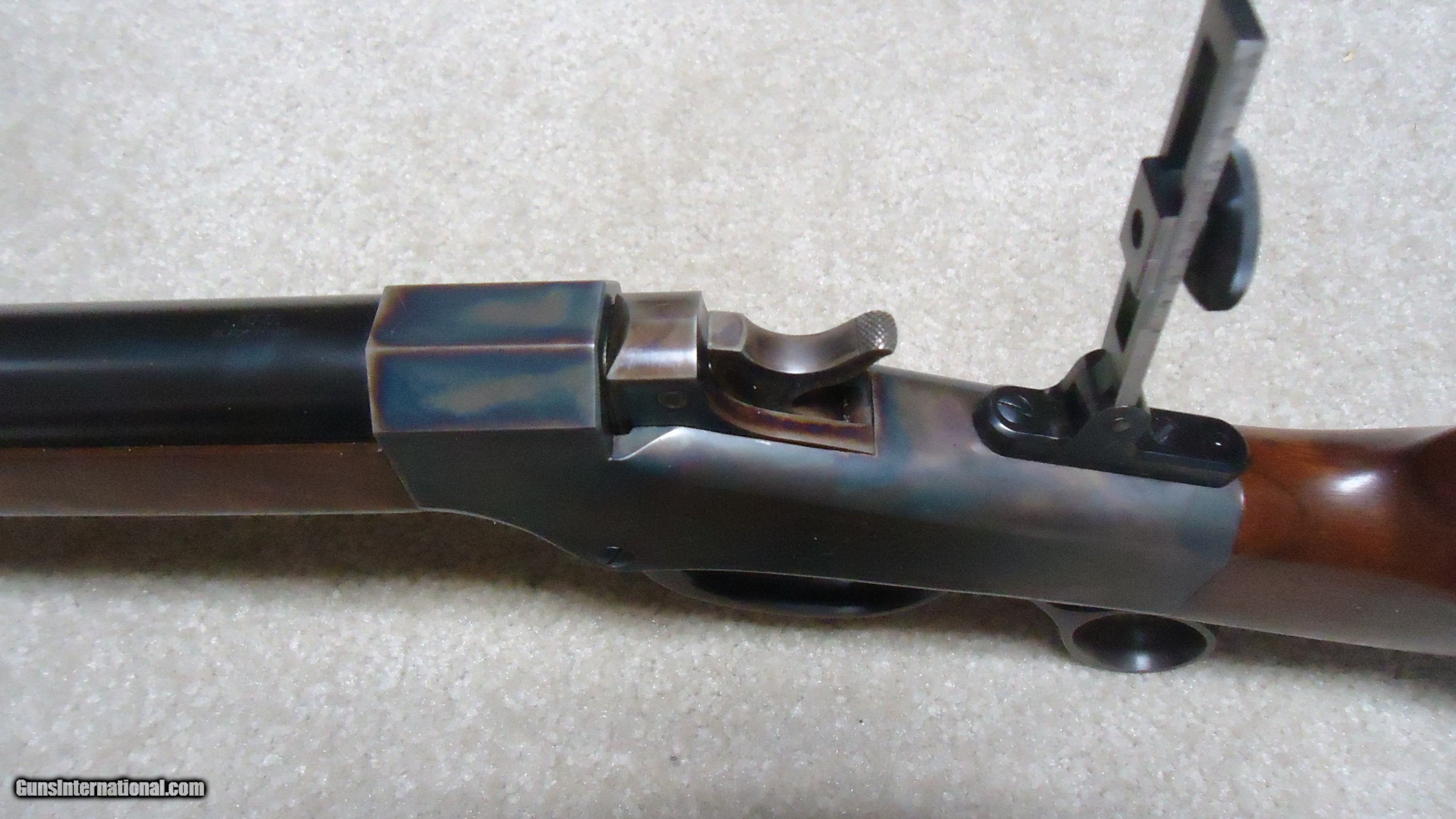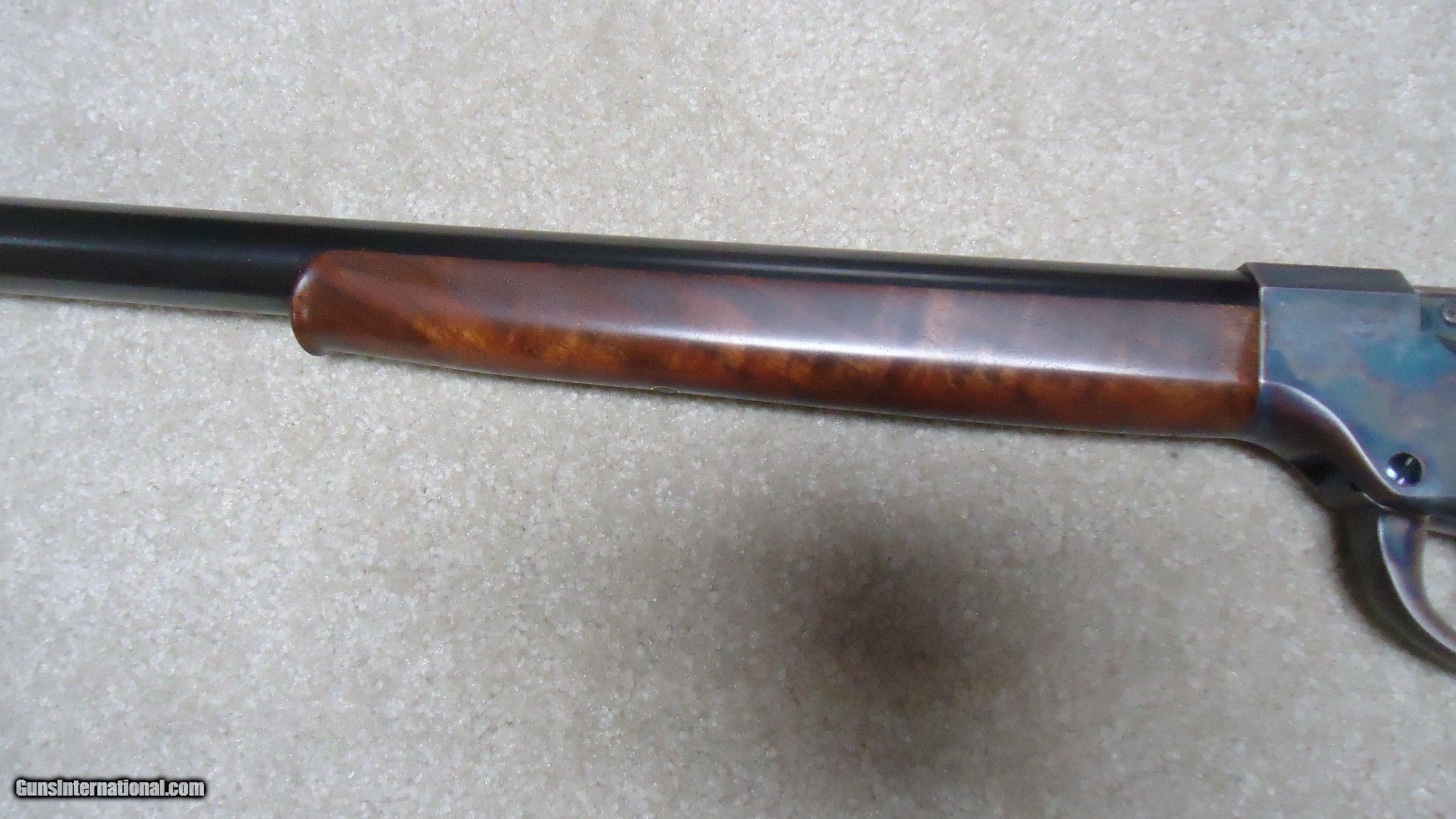Description: BALLARD RIFLE AND CARTRIDGE, CODY, WYOMING MADE No. 1 3/4 "FAR WEST" SPORTING RIFLE, .40-65 CALIBER WITH EXTRAS. Superb quality unfortunately no longer made, this one features double set triggers, 30" round barrel, beautifully color cased receiver with ring lever, sporting tang sight with Rocky Mountain blade front sight and no rear barrel dovetail. Extra fancy rich walnut stock with cheek piece and matching forend- stock measures 14" length of pull from the center of the black Pachmayr Decelerator pad to the front trigger. Rifle weighs just under 11 1/2 lbs. and appears about new condition inside and out. Comes with standard extra cresecnt butt plate sporting stock and matching forend, Reddiong .40-65 loading dies, 200 415 gr. P. Jones .408" Creedmoor bullets, 50 400 gr. Snover bullets, 115 cases perfectly formed from W-W .45-70 brass, blow tube and a bag of .060" Walters vegetable fiber wads. All for $3750. SOLD Rifle Caliber: .40-65 Winchester Manufacturer: BALLARD RIFLE/CTGE. Model: 1 3/4 FAR WEST Serial Number: C7XX Barrel Length: 30 Condition: LIKE NEW |