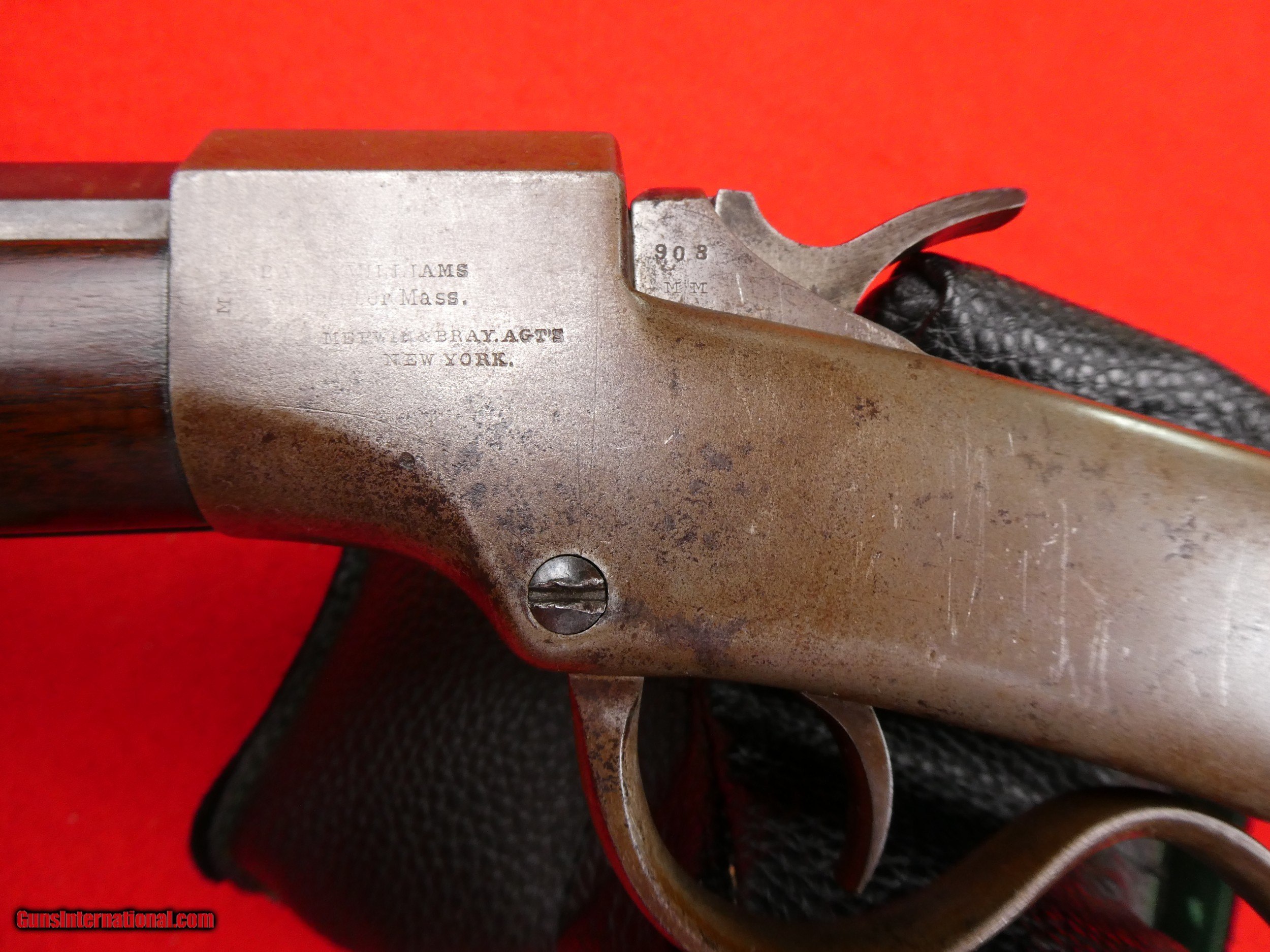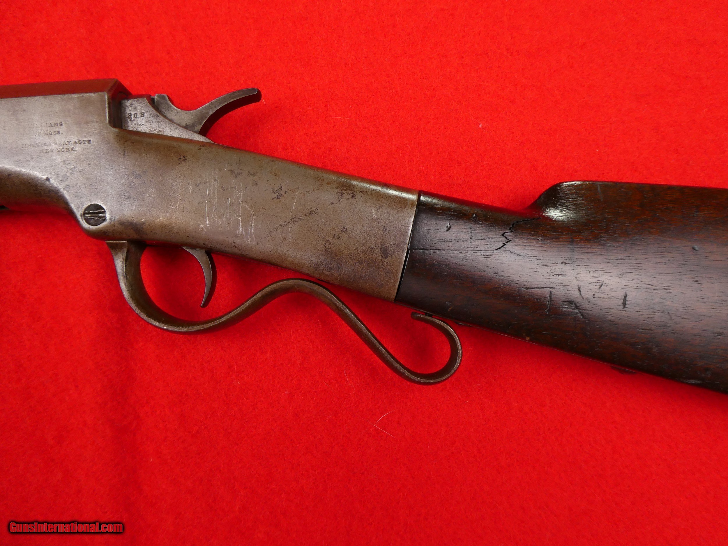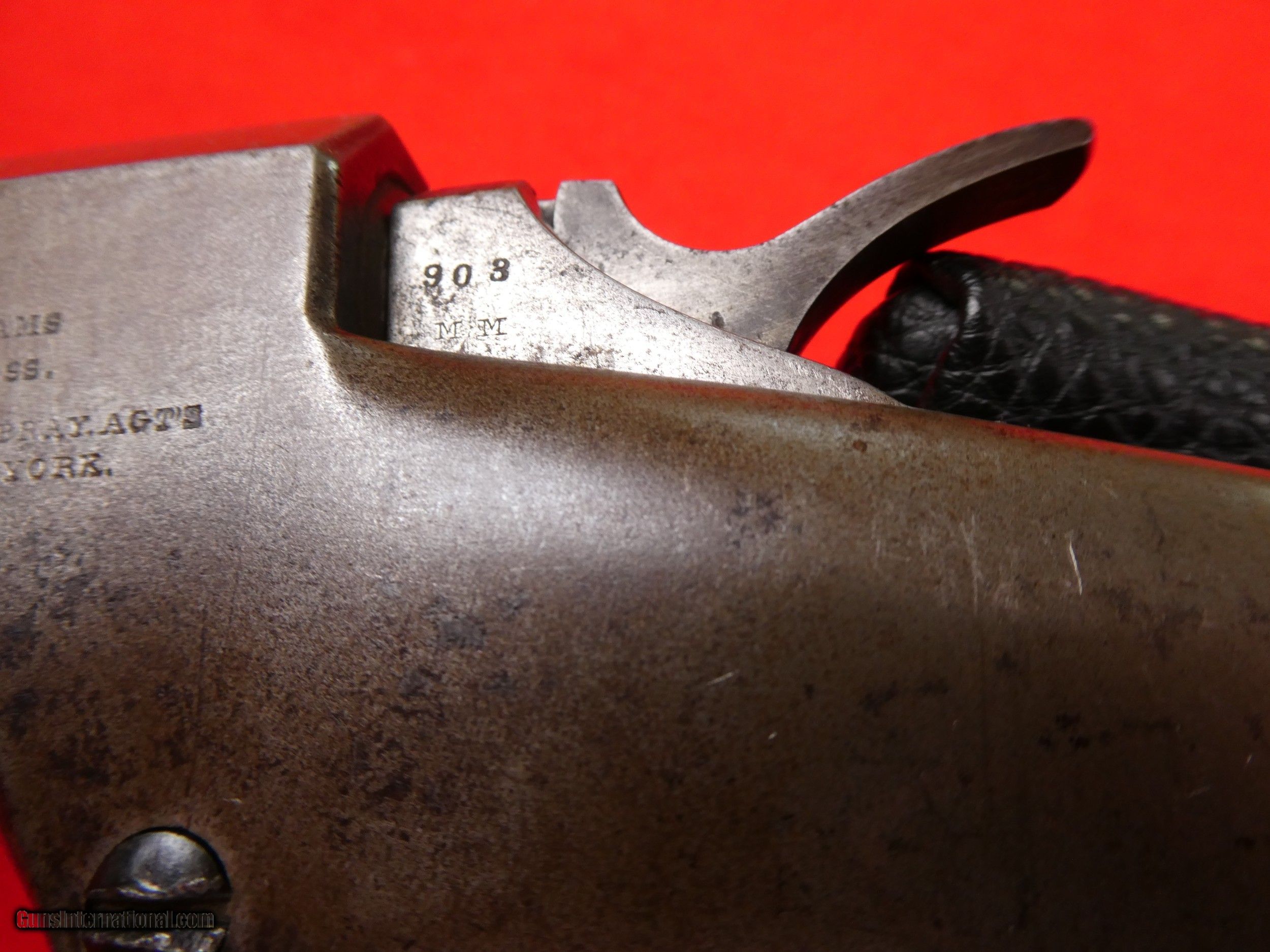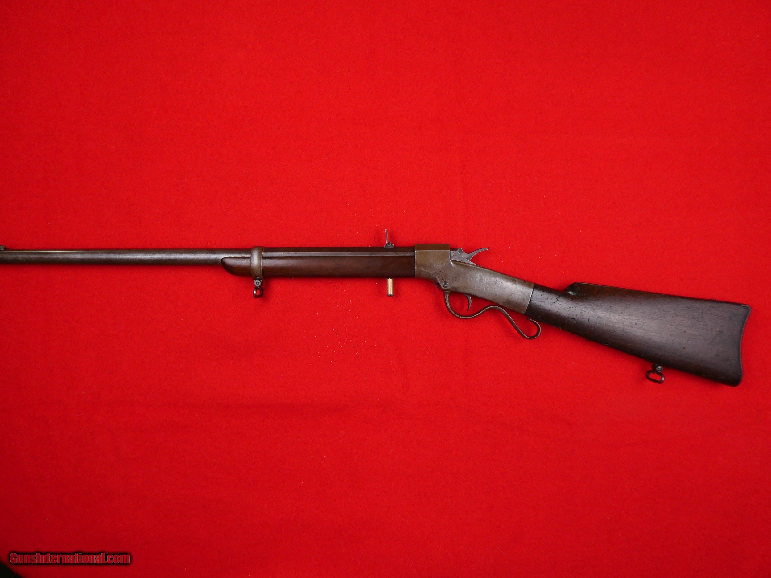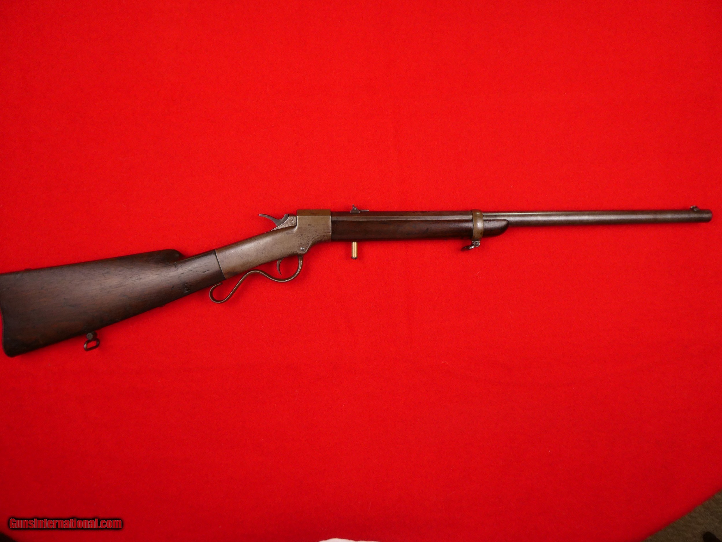 Description: ***SOLD*** Ball & Williams Ballard 1861 Carbine .44 rimfire. Ser # 9903, Merwin & Bray Agents New York, Ballards Patent Nov. 5. 1861, Ball & Williams, Worester, Mass. MM inspection marks and numbers all match, Cartouche Stamped MM very faint, ( MM- Milton Morris) Scarce Government Inspector Mark. Octagon to round barrel, Nice rifling and bore, Front sight has some damage, Rear sight is a two leaf variety with 100 yd- 250 yd- 500 yd, Original sling swivels, Small crack in stock at wrist, Features a spring loaded manual shell ejector, The lever is a replacement but looks and function very nice, Rifle appears to be all original except for this. Overall very nice original condition military issued carbine. Layaway Available No Text; Call 269-358-1027 or 269-489-5109 or email only; PERSONAL PROPERTY of David Walters; $1995.00 plus $50.00 shipping. SOLD |