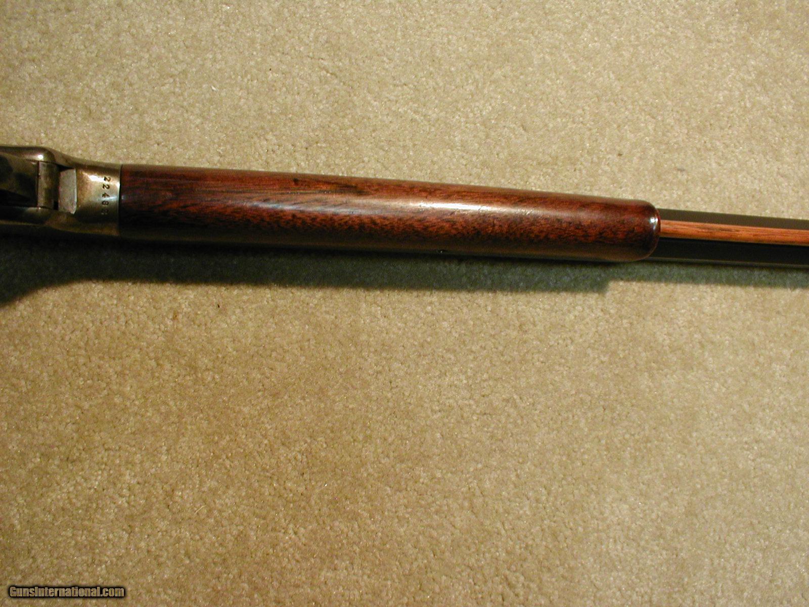 Description: No. 5 PACIFIC RIFLE IN .40-63 CALIBER, MARLIN FIREARMS COMPANY MARKED, #22XXX serial number matching on the receiver, barrel, forend and butt plate, 30" octagon barrel, a particularly fine example with fine deep barrel blue showing only very light age and wear, mottled silvery receiver, correctly stamped "40-63" on barrel top ahead of receiver, double set triggers function fine, exc. forend and butt stock with only a hint of a typical short hairline crack coming back from the receiver for an inch or so- difficult to see unless you look for it, minor- exc. bore needs a good clean only, fitted with a two leaf folding rear sight in the factory dovetail, Lyman style globe front sight that will take apertures, and very rare (and valuable in its own right) Lyman tang sight that is made with a graduated windage adjustment and eye disc, tight action, double set triggers function fine, twin factory thimbles intact with wiping rod, considered the standard caliber for the No. 5 Pacific rifle and was very popular as a sporting round as well as a target cartridge, weighs approx. 10 3/4 lbs., fine example in hard to find condition, SOLD Antique: Yes Manufacturer: Ballard/MARLIN FIREARMS CO. Model: No. 5 Pacific Serial Number: 22XXX Caliber Info: .40-63 Condition: fine+ Barrels: 30" oct. |