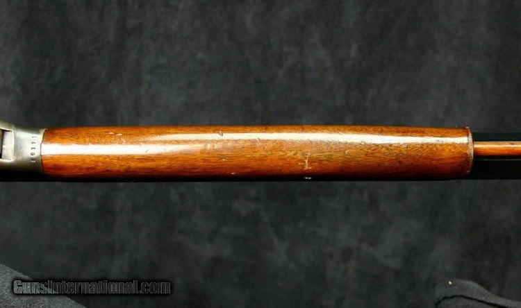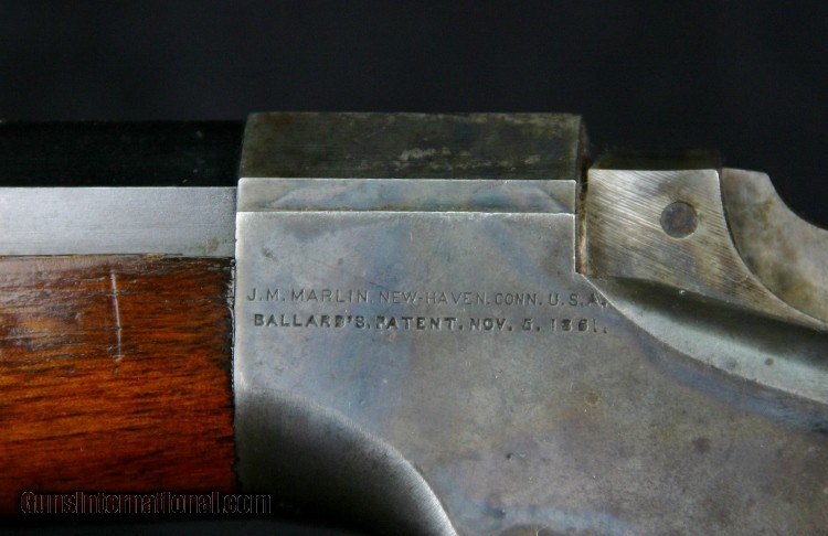 Description: .45-100, #14153, 30 inch heavy barrel (12 pound total weight), blue and case color finish, walnut stock and forearm, tang rear sight and globe front sight, double set trigger, wiping rod appears original, "J. M. Marlin, New Haven, Conn.USA/Ballards, Patent, Nov 5, 1861" on left side of receiver, circa 1880's Condition: sharp bright bore, 99% barrel blue, 90% case color on receiver, hammer and lever mellowing, excellent wood has layer of finish applied and use dings, excellent marks, excellent mechanically. SOLD Antique: Yes |