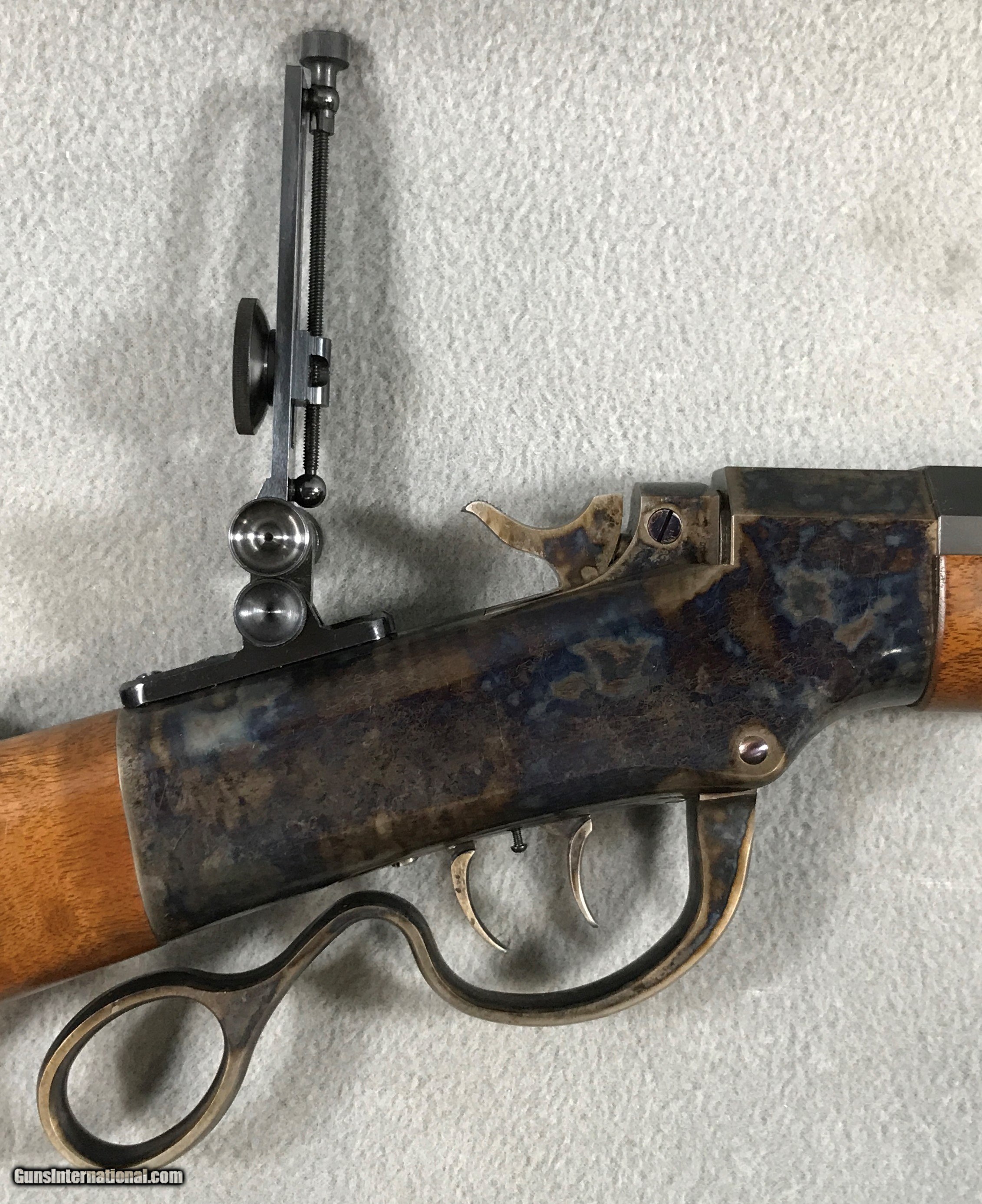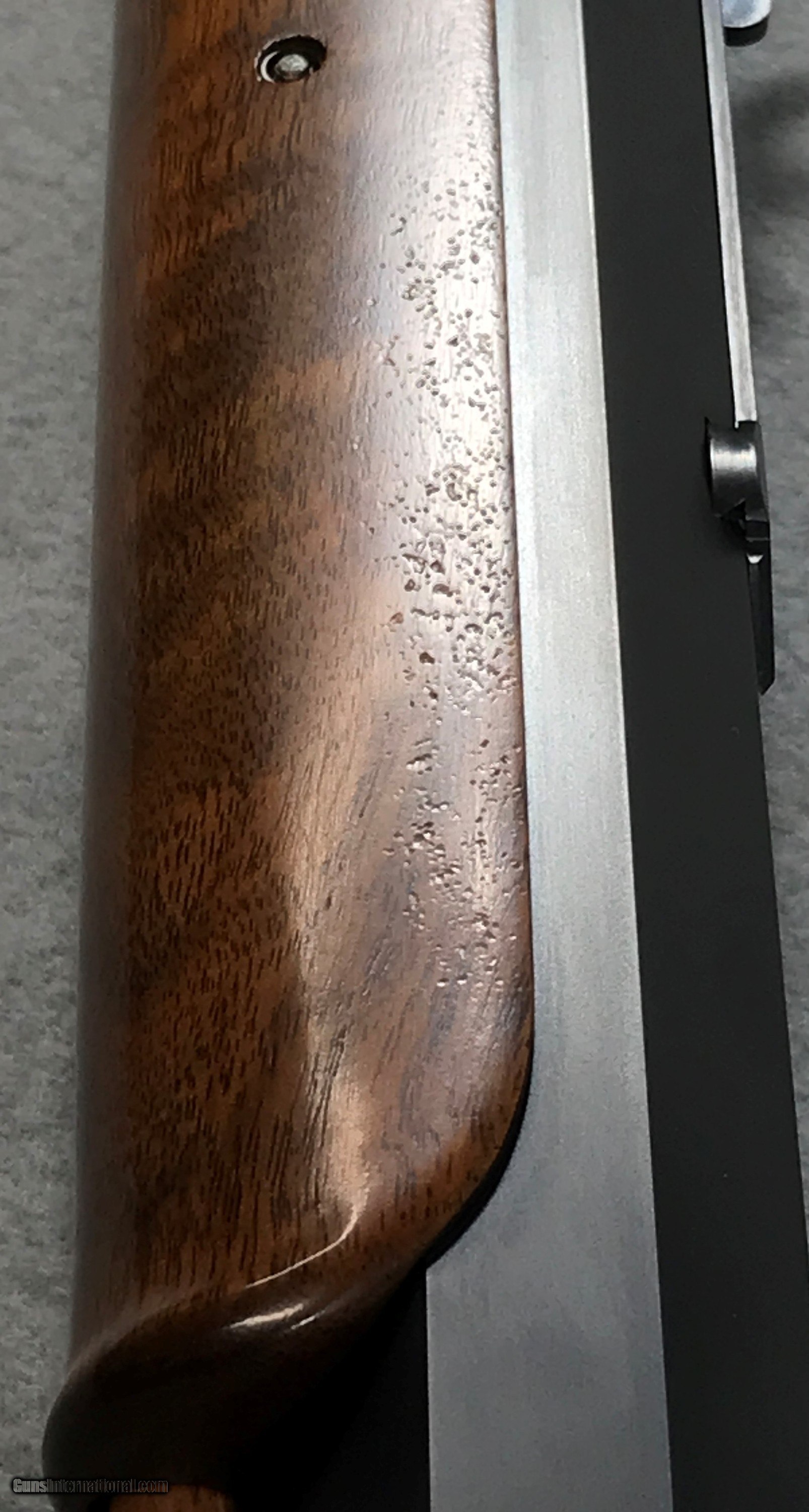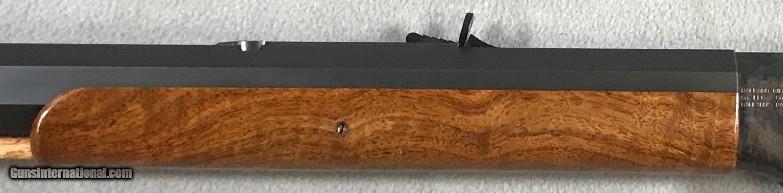 Description: Ballard Rifle & Cartridge Co. # 5 1/2 Montana .45-110-2 7/8" 32" Long x 1 1/4" Diameter Heavy Octagon Barrel Double-Set Triggers MVA #101 Mid-Range Soule Rear Sight Silver Blade Front Sight Wiping Rod Steel Shotgun Buttplate 14" LOP 15lbs Metal is in excellent condition, with minor handling marks. Wood is in excellent condition, with minor handling marks. There is an area on the right side of the forearm that has a bunch of small dents, it looks like it has been laid on a rough surface. It is not highly visible unless you get a reflection on it. I have tried to show it as much as possible. It is visible in pic's #4, 22, 23 and 24. Shipping and Insurance. Buyer pays actual shipping. Estimate is $150.00-$190.00. SOLD Rifle Caliber: .45 2 7/8" Manufacturer: BALLARD RIFLE & CARTRIDGE CO. Model: #5 1/2 MONTANA Serial Number: C353 Barrel Length: 32 Condition: EXCELLENT Metal Condition: EXCELLENT Wood Condition: EXCELLENT Bore Condition: EXCELLENT Barrels: 1 1/4" DIAMETER Barrel Type: HEAVY OCTAGON Action: FALLING BLOCK Triggers: DOUBLE SET Stock: WALNUT LOP: 14 Weight: 15 Sights: MVA #101 MID-RANGE SOULE Manufacture Date: 1996-2009 |