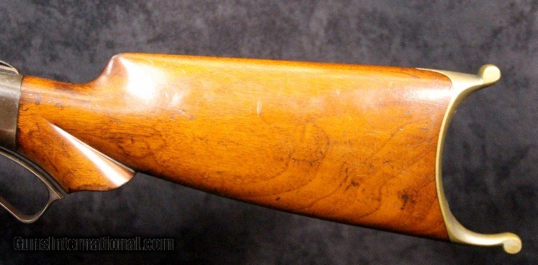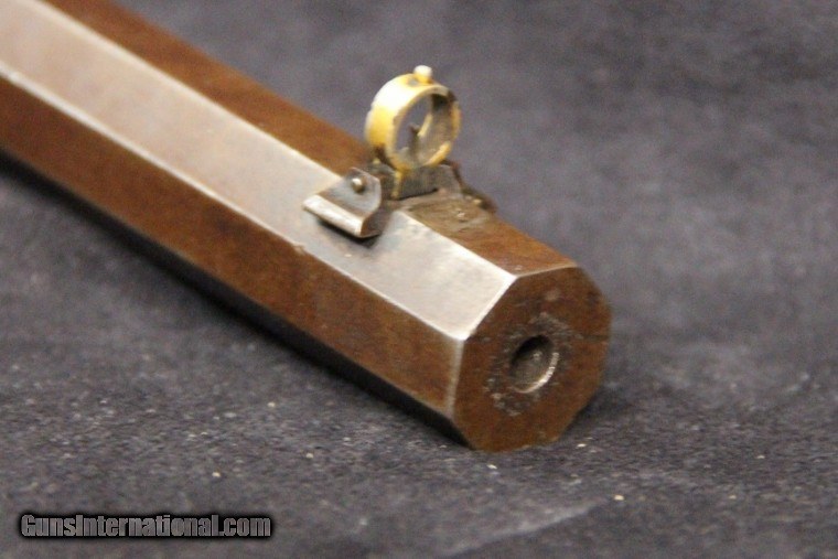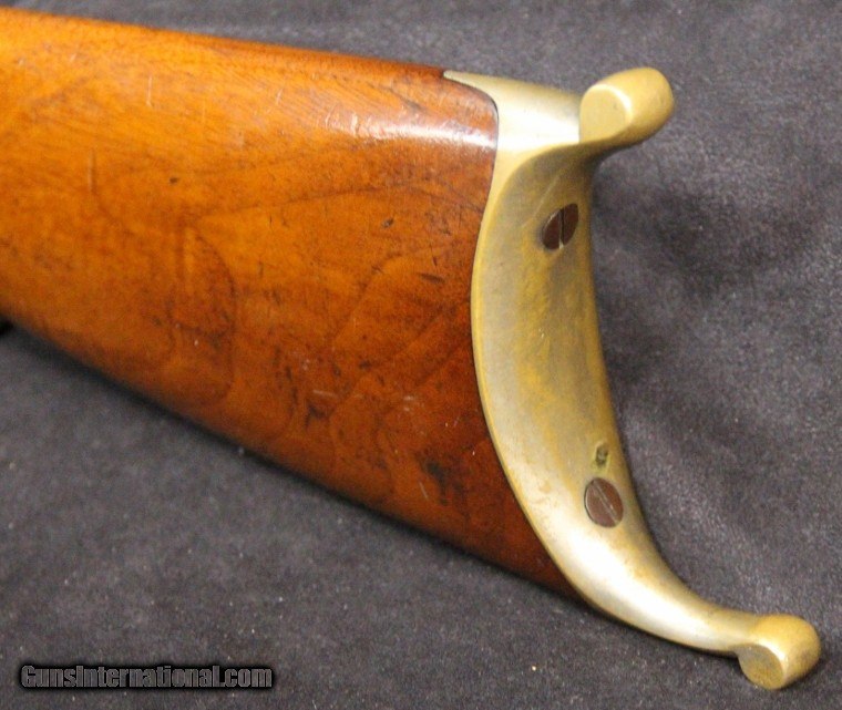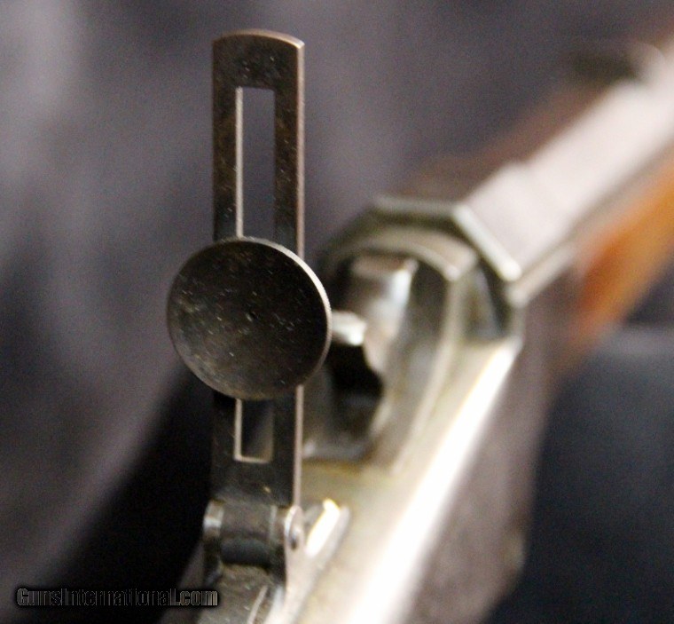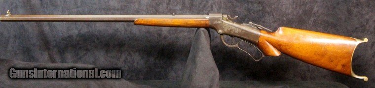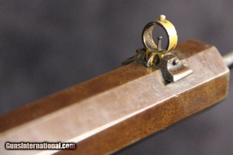 Description: .22rf, s or l, #16187, 26 inch barrel, blue and case color finish, walnut stock and forearm, original sights, silver plate brass Swiss style butt plate, late 1880's. Condition: very good bore with some black powder oxidation, 90% barrel blue turning dark, 10% case color on frame silvered, tang sight is slightly bent, Beach front sight still has most of its gold wash, excellent wood, excellent mechanically, excellent marks. SOLD Antique: Yes |
