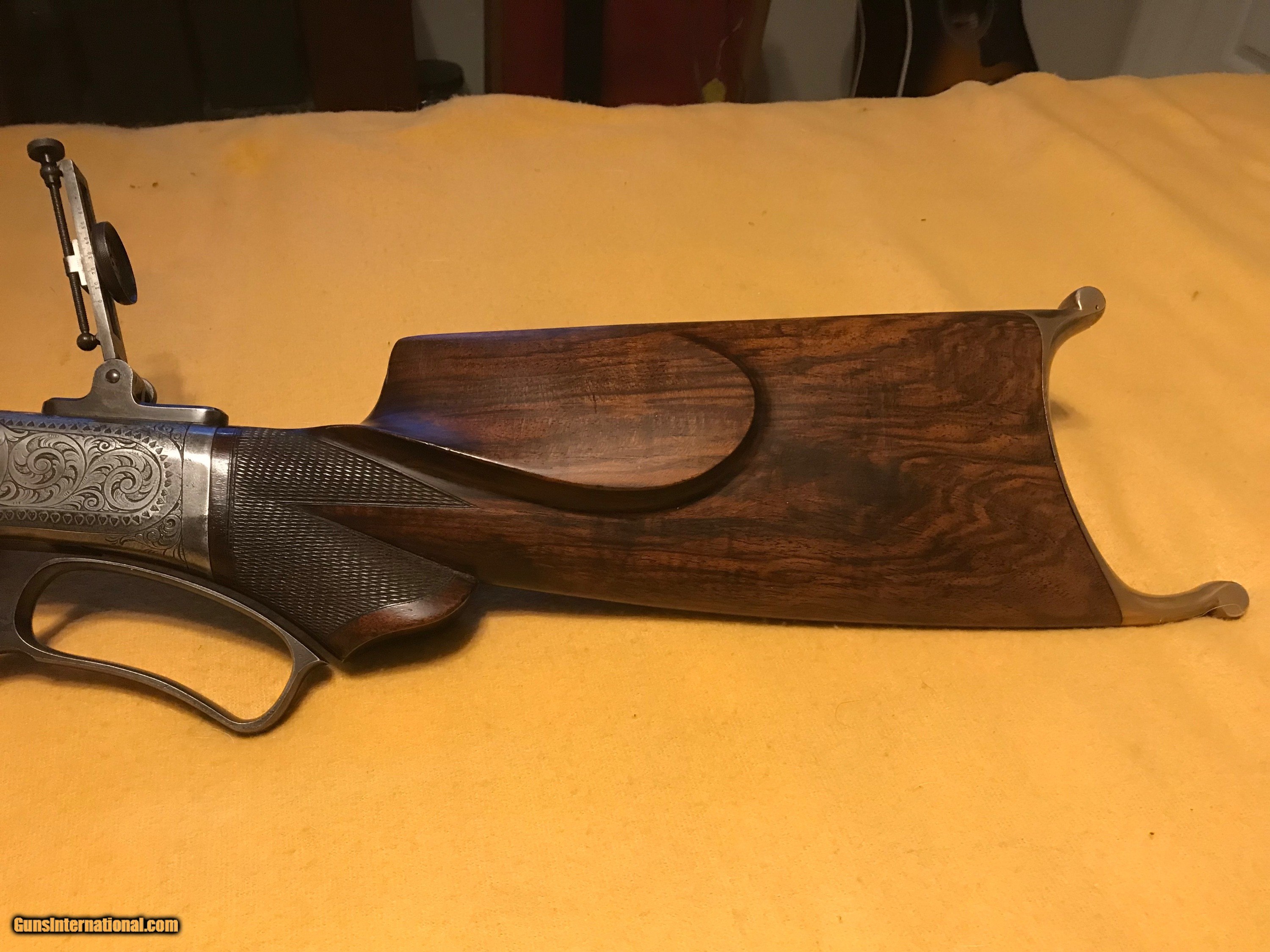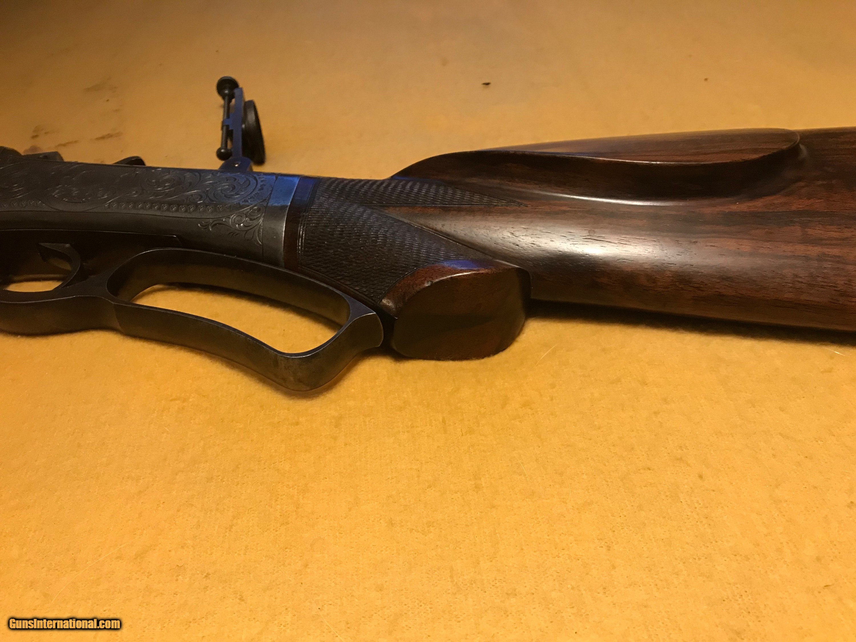 Description: Marlin Ballard No 6 1/2 Rifle 38-55 cal 28" tapperd barrel,Rigby flas, pistol grip checked stock, Schetzen stock cheek piece ,horned grip,80% bore Original Tang sight . Buffalo an Deer Engraved on frame. Engraved by Gustav Young factory original. Checked trigger. Questions call Richard 406-407-0698 . SOLD Antique: Yes Manufacturer: Marlin Ballard Model: 6.5 Serial Number: 36xxx Barrel Length: 28 |
