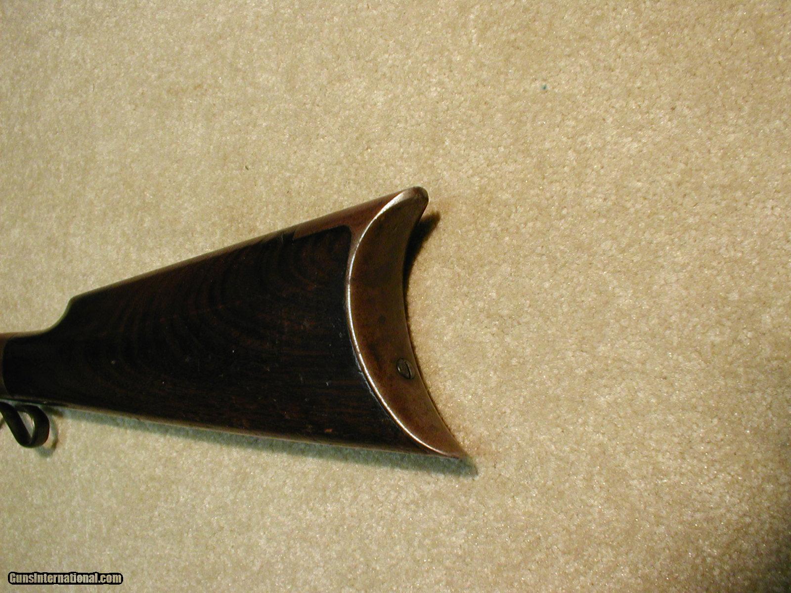 Description: VERY EARLY AND RARE No. 1 HUNTERS RIFLE IN .44 EXTRA LONG CENTER FIRE & RIM FIRE (reversible firing pin), ONLY 300-500 MADE 1876-1880, this is an exceedingly rare J. M. Ballard marked single shot, serial number 4XX, an honest example with 26" medium tapered round barrel with buckhorn rear sight (needs elevator bar only) and blade/ivory bead front sight, tight action, fine markings, matching number on barrel and receiver, deep aged blue/brown patina overall, fine wood shows normal handling and hunting wear but is sound, needs the little "pin" that goes in the lower tang that "locks" or catches in the corresponding hole in the bottom of the loop part of the lever (minor), usual single short hairline crack coming back from the receiver on the left side that goes nowhere (almost all Ballards have this), forearm shows a little saddle wear on the bottom just ahead of the receiver and on the sides, fine bore should scrub out even better, one of the earliest Ballard Models in very respectable condition SOLD Antique: Yes Manufacturer: J. M. Marlin Ballard Model: No. 1 Hunters Model Serial Number: 4XX Caliber Info: 44 CF & RF Condition: fine Barrels: 26" round |