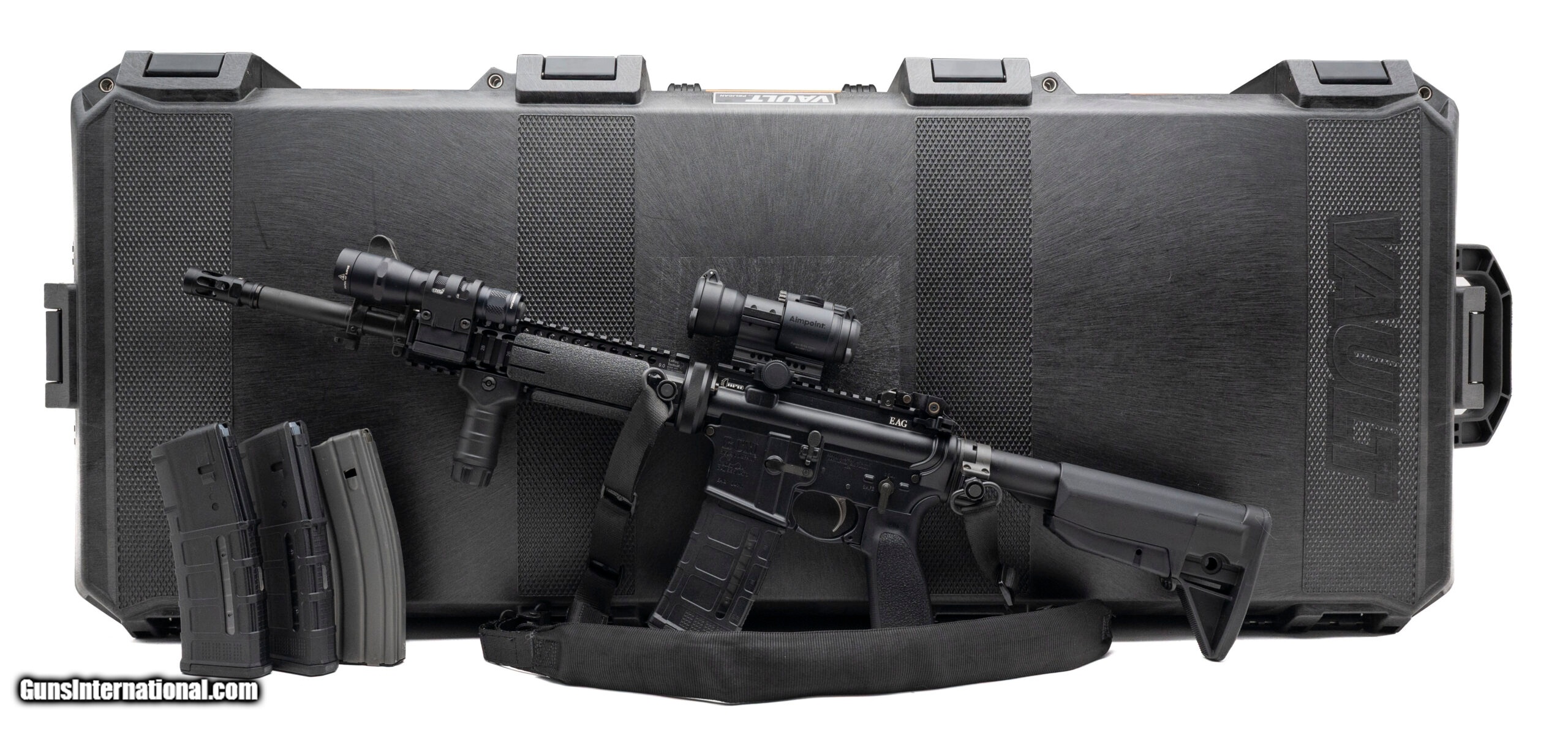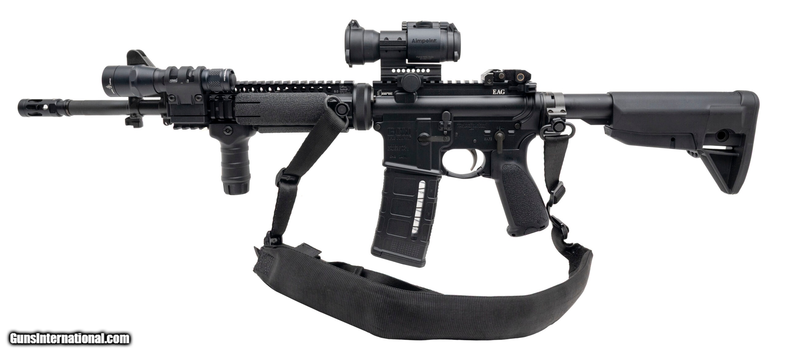 Description: "SN: EAG1426. Modern production, 5.56 NATO with an 14.5"" barrel w/pinned & welded flash hider (16"" overall length). Bore is bright with strong rifling. Semi-auto tactical carbine with an Aimpoint Patrol Rifle red dot optic, Surefire flashlight, 9"" Larue Tactical picatinny handguard, front sight post gas block w/bayonet lug adapter, Tango Down vertical grip, and a Vikings Tactics sling. Overall condition is excellent. Comes with Vault Pelican case and three extra magazines. Price: $2,395.00 Contact Seller |