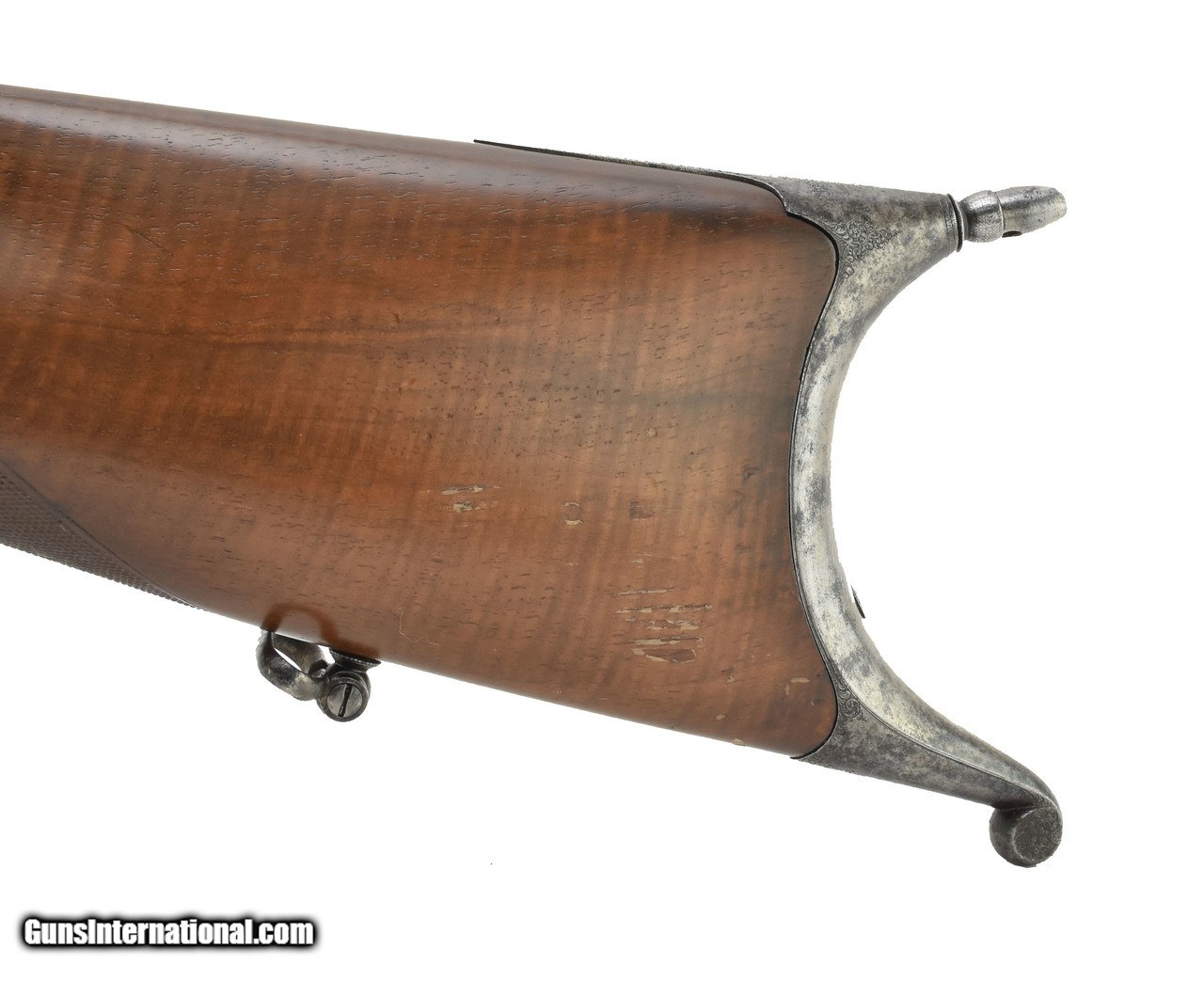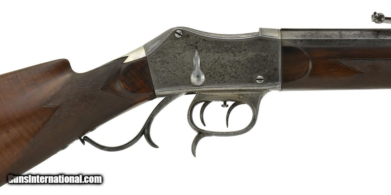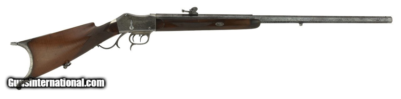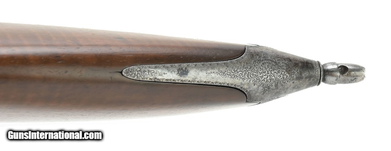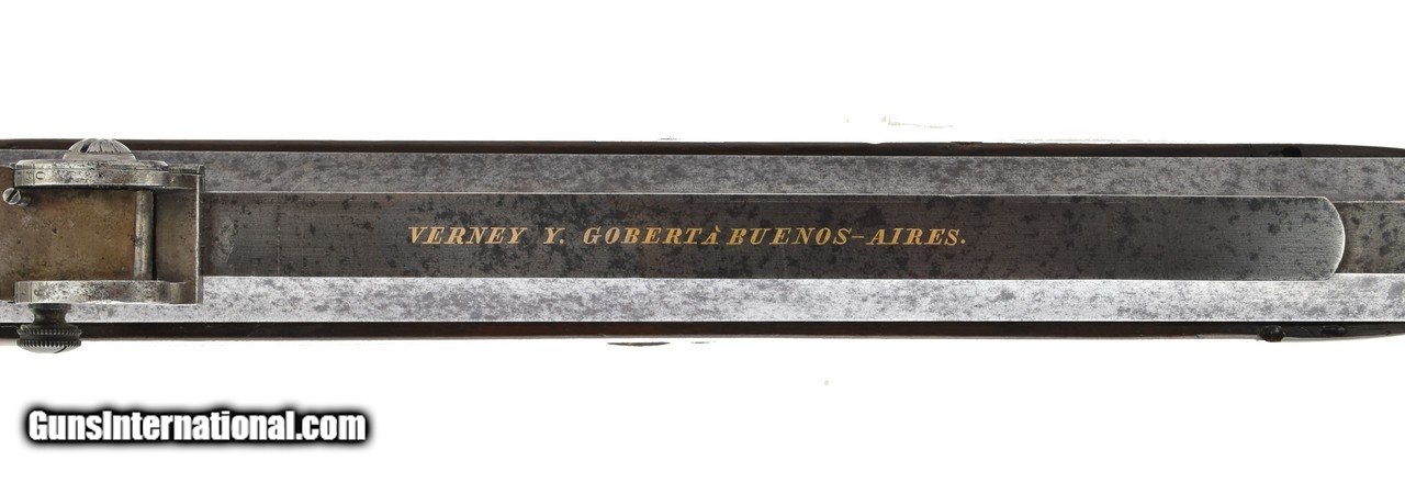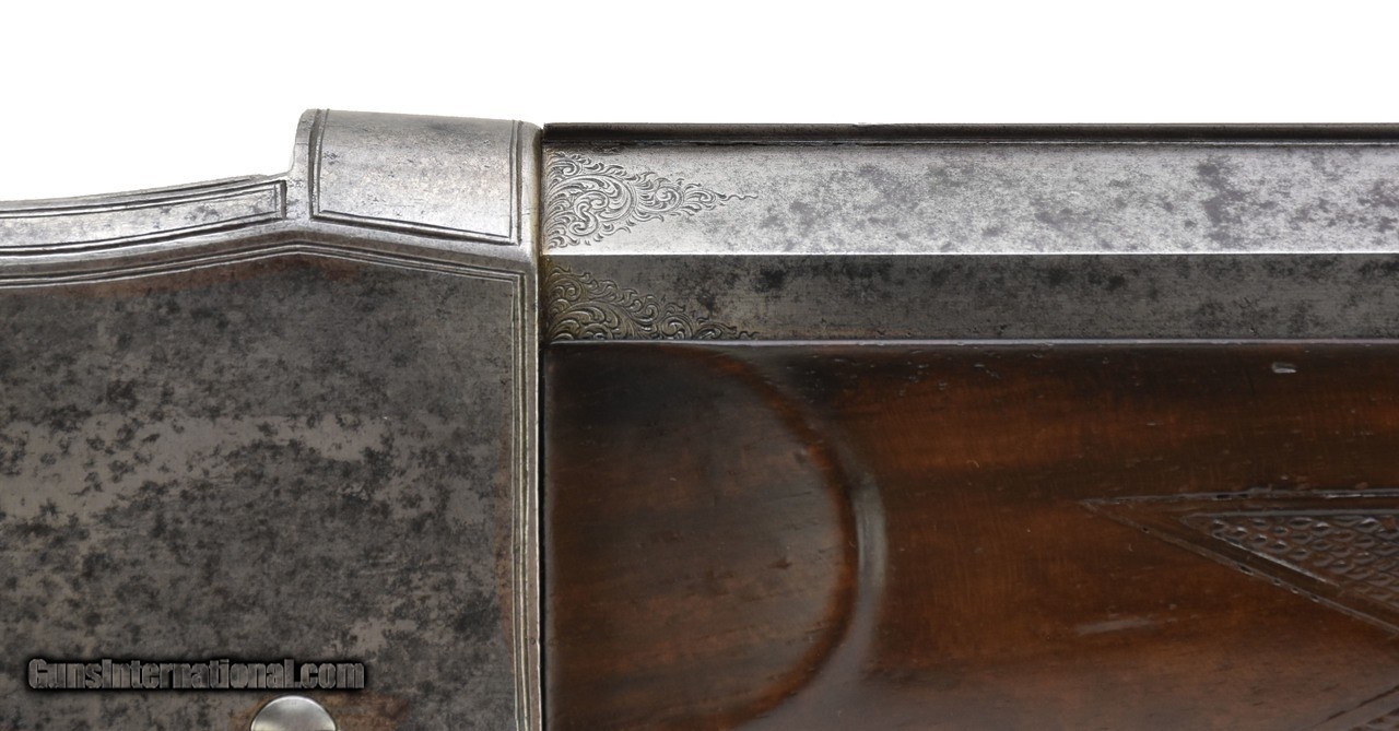 Description: "Henry Martini action target rifle. Approximately .44 caliber and appears to be a short straight case cartridge. Double set triggers. Barrel, buttplate and trigger guard and lever are fine scroll engraved. Barrel length is 31 1/2"" and has an excellent bore. Rear sight adjusts along a 12"" grooved rib for longer sight radius. Barrel is marked in gold lettering ""Verney Y Gobert a Buenos Aires"". Very good overall with a sharp grayish patina. (DALLAS LOCATION) Price: $2,495.00 Contact Seller |