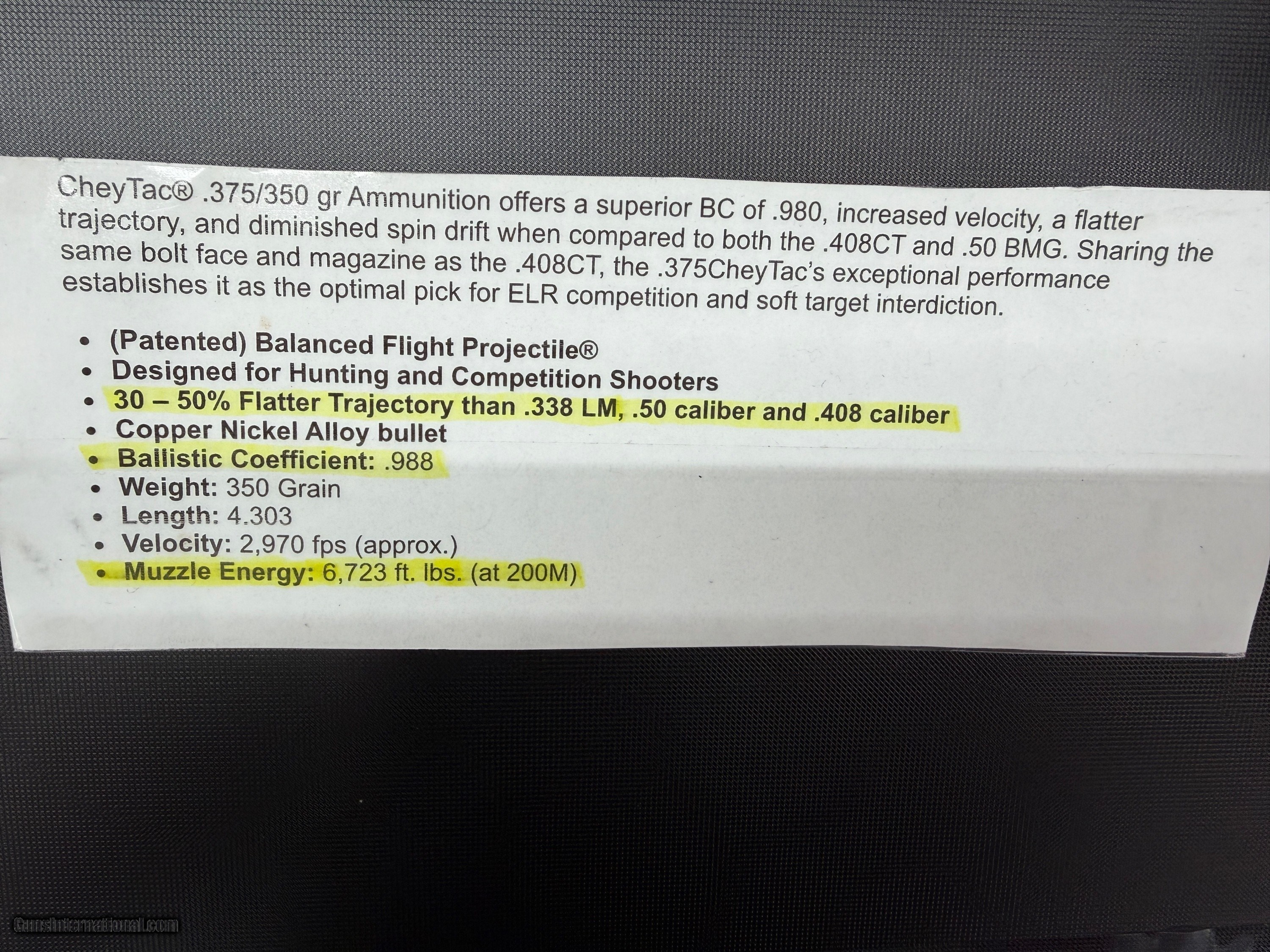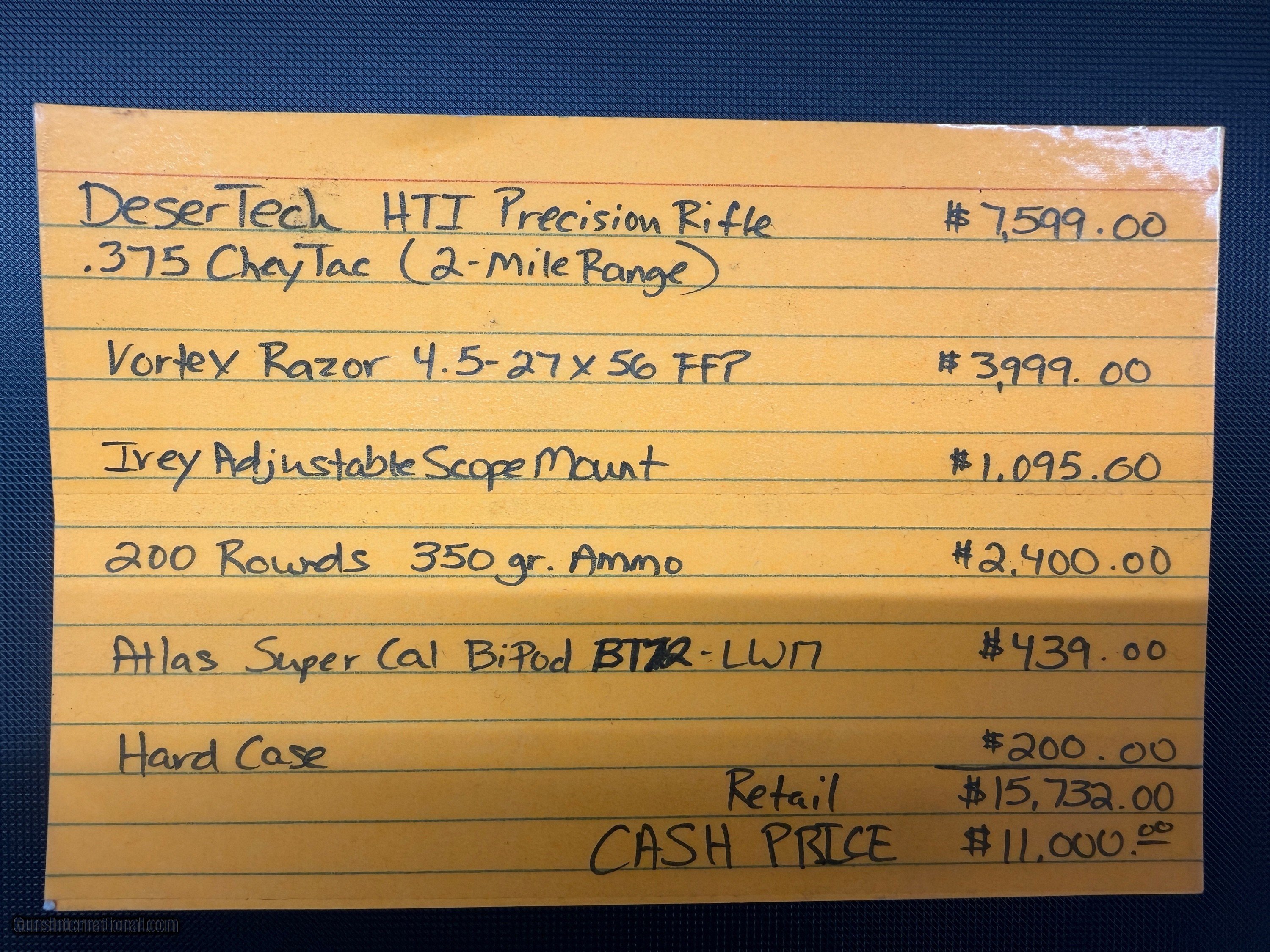Description: Desert Tech 375 Cheytac Rifle in rolling Pelican Case w/ Ivey adjustable MOA scope mount, which is a $1000 base. Has been shot less than 50 times. 200 Rounds of custom 375 cheytac ammo as well if your interested in purchasing them seperatley. Rifle Caliber: .375 CheyTac Manufacturer: Desert Tech Model: HTI Precision Barrel Length: 29'' Condition: Like New Metal Condition: Like New Wood Condition: N/A Bore Condition: Like New Barrel Type: Heavy Action: Bolt Stock: Bullpup Price: $6,900.00 Buy Now Contact Seller |