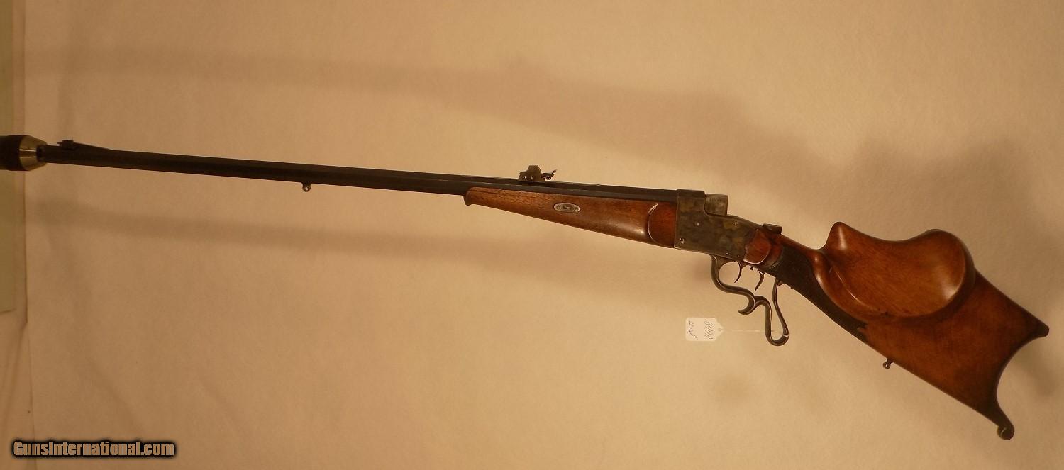 Description: #840A ENGRAVED GERMAN SCHUETZEN 22 RIFLE, underlever dropping block design, adj. sliding rear sight for elevation & windage, ramp blade front sight, DST, large Schuetzen stock with deep cheek rest, Schuetzen buttplate & lever, border engraving around the outside edges of metal, #3 stamped on side of the bbl., 31" oct. bbl., sling swivel eyelettes, exc. stock, VG forearm with small repair to a sliver of wood near the forward part, top of bbl., matted, 98% bbl. blue, 97% casehardening on action & buttplate. SOLD |
