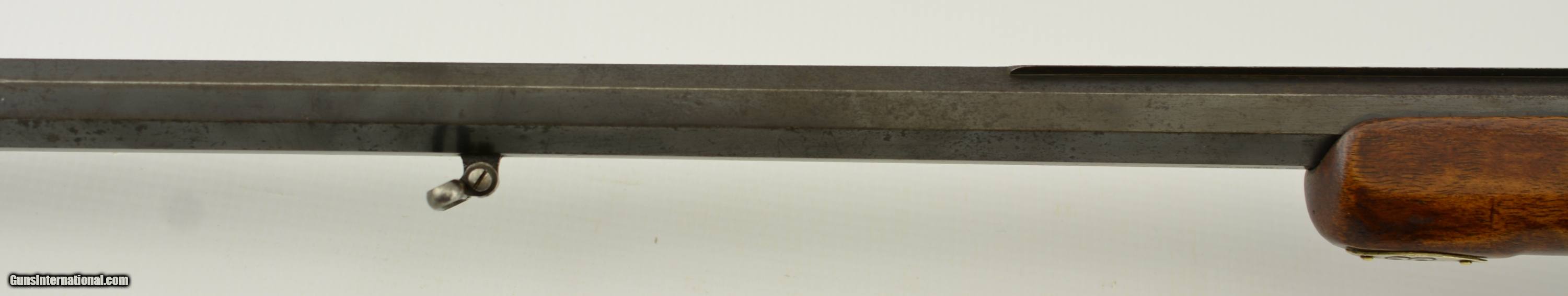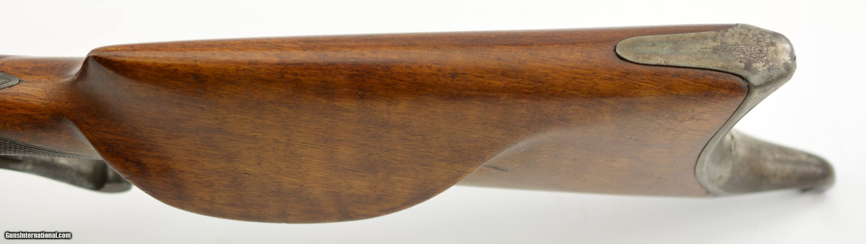 Description: Serial #1815, 8.15 x 46R, 30" octagon barrel with a very good bore that has mild freckling within the grooves. The barrel retains 70-75% of the original blue finish with an overall plum-brown tone along the edges of the flats, as well as mild surface freckling throughout. The barrel still has the original front sight fitted, the rear barrel sight (adjustable for eye-relief) is fitted to the barrel rail, and a small, unobtrusive import mark is present in the underside of the barrel just ahead of the forend tip. The visible portions of the receiver have sparse floral scroll engraving, and retain traces of the original color case-hardening, with bright gray metal on the balance that also has spots of dark freckling scattered about. The wrist tang sight mount is vacant, however the correct rear sight is still present and included. The unusual one-piece walnut stock has a small rack number on an elliptical plaque at the nose of the forend: “3", a rounded cheek-piece with hooked butt, and a further small number plaque at the toe: “16". The double-set triggers are mechanically sound, and have a crisp release. This is an unusual Martini rifle with one-piece stock, and rates very good-fine condition overall. FFL or C&R SOLD Curio/Relic: Yes Manufacturer: Stiegele Model: Martini Serial Number: 1815 Caliber Info: 8.15mm Gauge Info: 8.15mm |