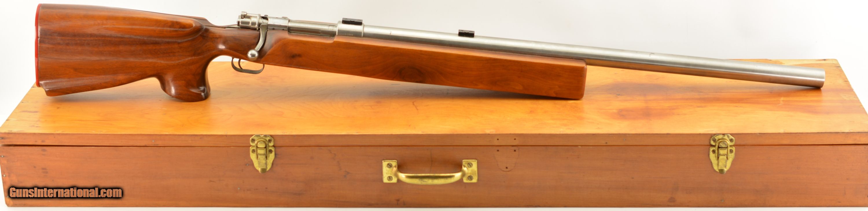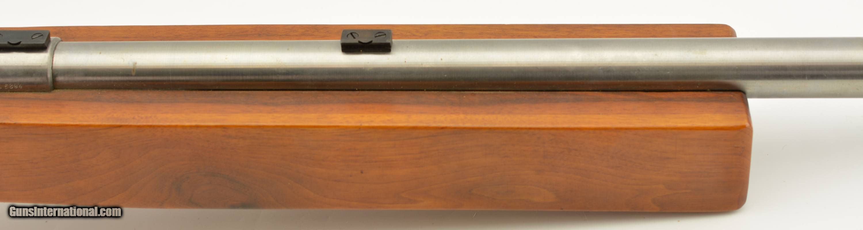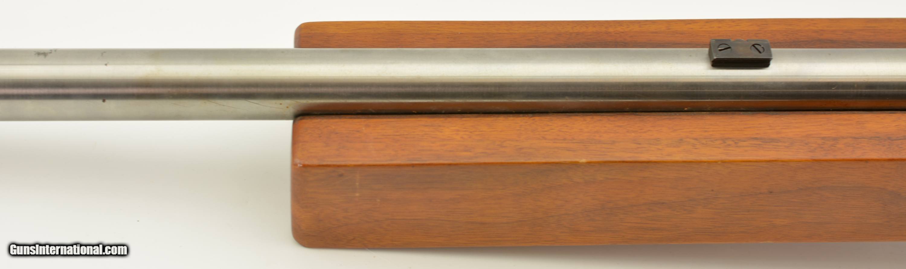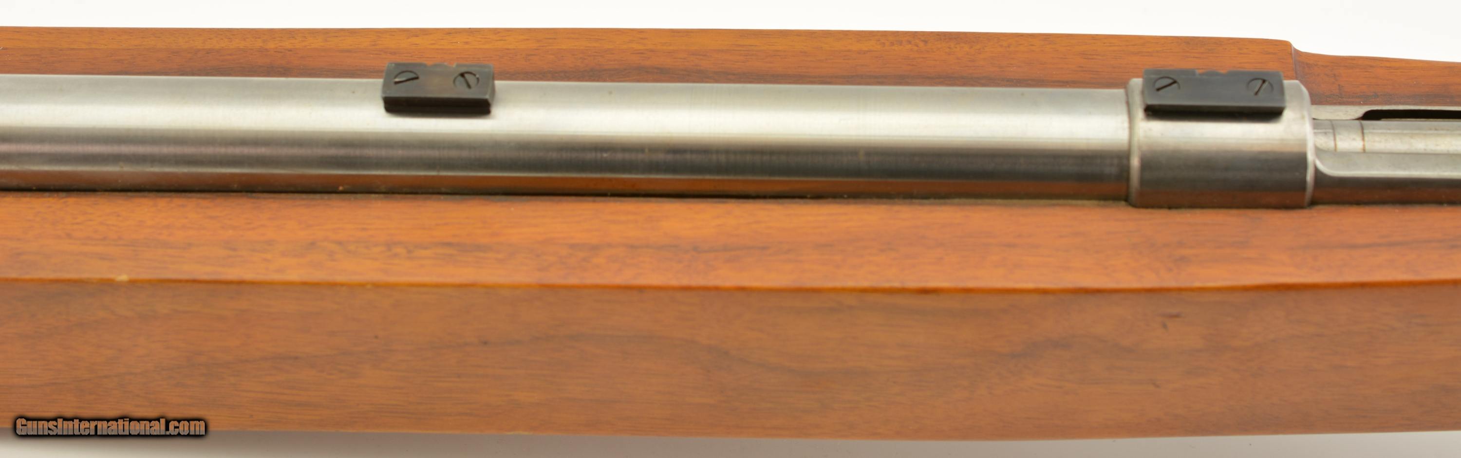 Description: Serial #A5894, .222 Remington, 30" extra heavy target barrel with an excellent, bright bore. This is a very large rifle, weighing in at just over 19 lbs., and has the barrel, receiver, and bolt in-the-white. Some traces of original fire blue are visible on the bolt latch, with the balance turned dark plum-brown. A mottled plum-brown patina is also present on the trigger guard, however the scope blocks retain nearly all of their original blue. The massive wood laminate stock has a blocky, squared forend; curved pistol-grip; and a contoured buttstock with rollover cheek-piece, and red acrylic plastic buttplate with machine-carved initials: "JJS". The rifle is housed in a homemade wooden case that measures 53 1/8" x 12" x 5" (closed), and has three compartments. The rifle compartment is lined with blocks of foam rubber, and two leather security straps are also fitted. Also included are a set of reloading dies, and approximately 75 .222 Rem. brass cases. This is an excellent example of a purpose-built bench-rest target rifle. FFL SOLD Manufacturer: Mauser Model: Bench Rest Serial Number: A5894 Caliber Info: .222 Gauge Info: .222 |