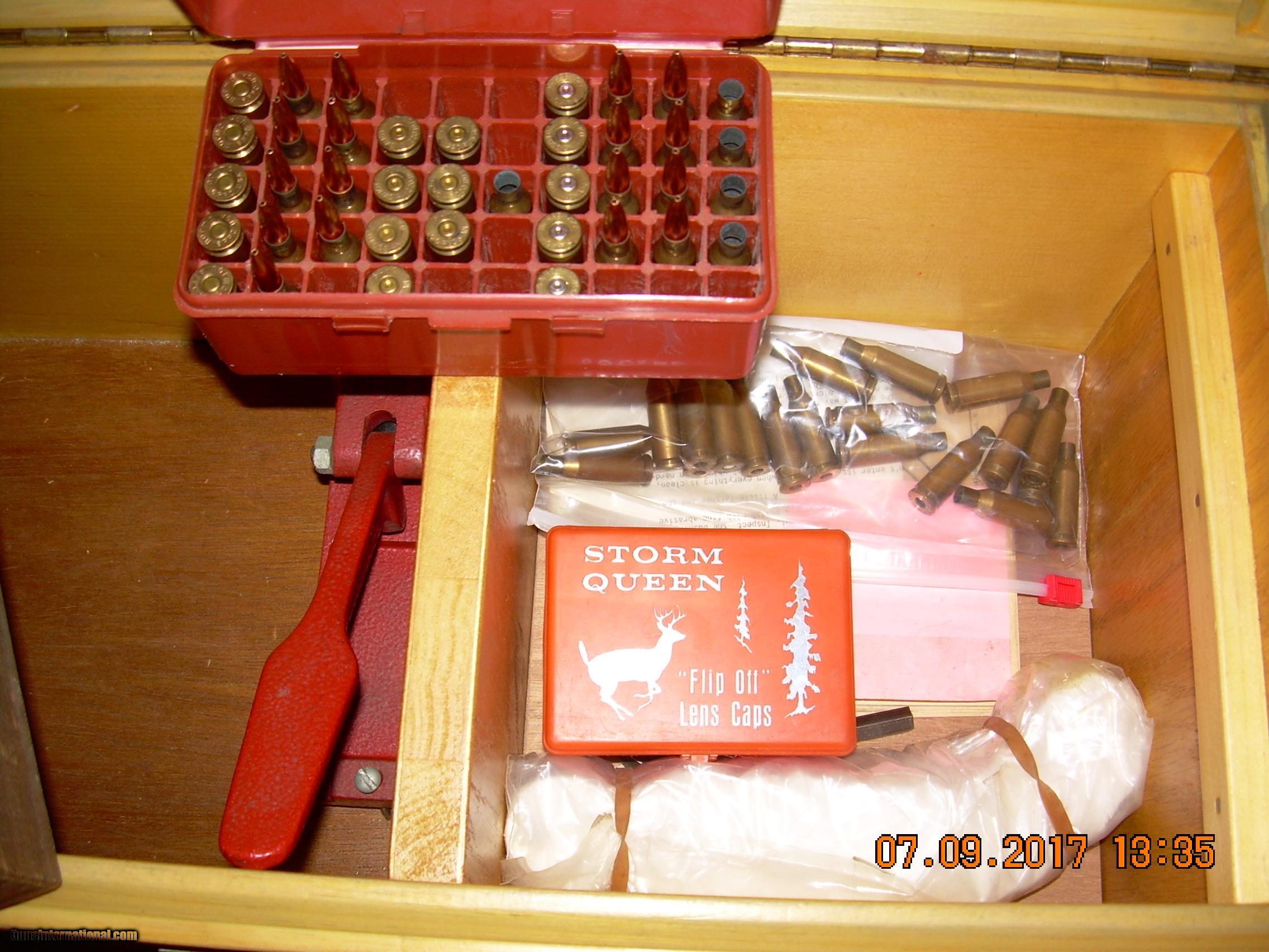 Description: Here we have a complete setup for the beginner benchrester and experienced handloader. A Shilen DGR single shot rifle in 6mm PPC, weighing in at about 11# and 10oz as you see it. No information as to round count except that it appears to be very low. The origional owner passed away early- and rifle has not fired 50 rounds since. Barrel is 26" in length and .925 at the muzzle and about 1.2 at the receiver ring. The rifle and reloading box with accessories as seen pictured $1595. plus actual shipping- FFL required for the rifle. The accessory box with contents, with arbor press weighs 33# 6oz. and could be sold seperately.but comes with the rifle for the $1595.. PRICE REDUCED SOLD Manufacturer: Shilen Model: DGA Serial Number: 2628 Caliber Info: 6mm PPC |