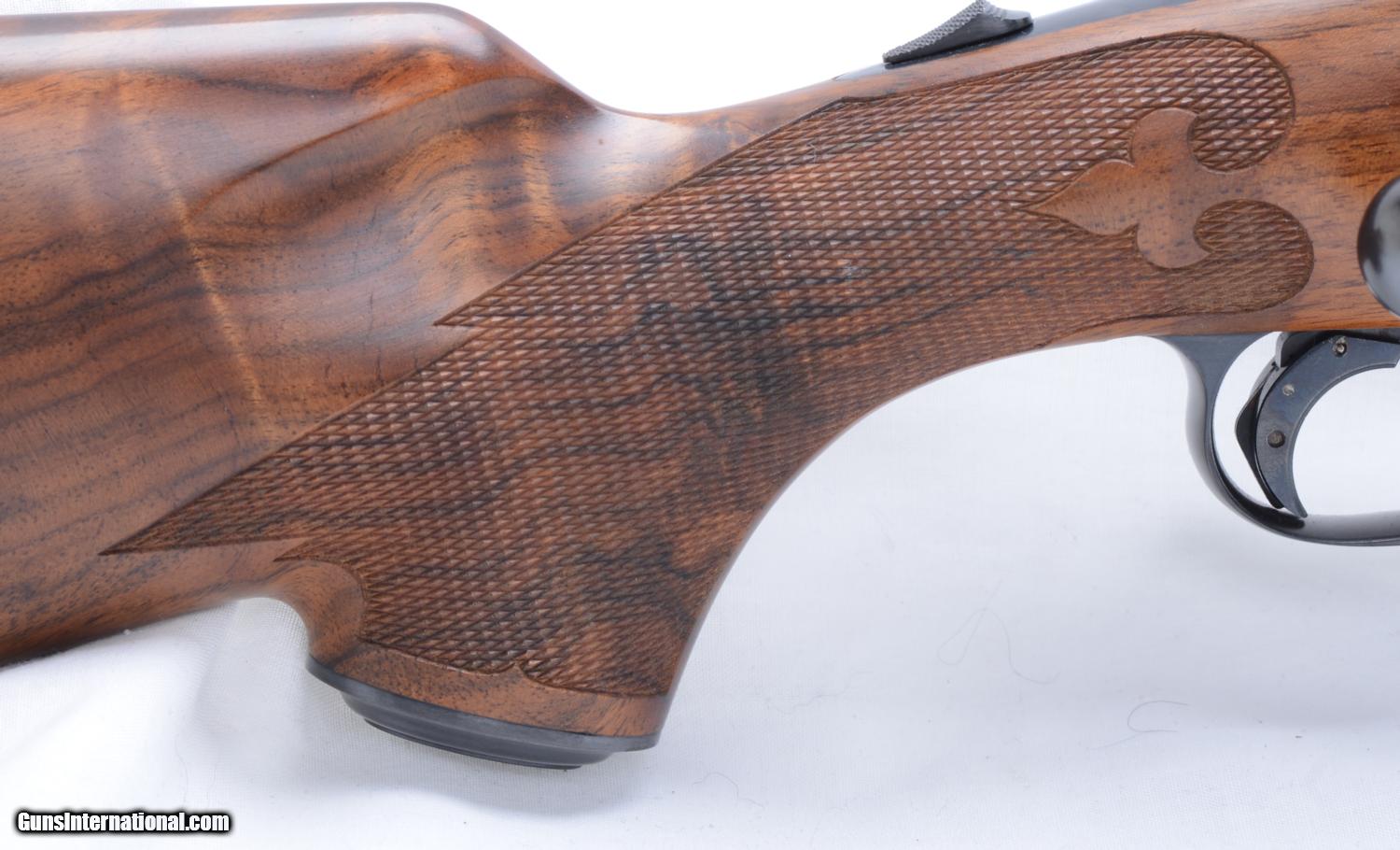 Description: SALE PENDING Winchester pre-64 model 70 custom rifle barreled by Gre’ –Tan chambered in 6 BR w/.270 neck. Very interesting custom rifle built in a heavy sporting or light varmint configuration. The 24” barrel has a muzzle diameter of .676” and is presented in a high polish blue with the Gre’-Tan logo and caliber engraved. The model 70 action has had the bolt polished, tuned and engine turned; a tang safety has been installed and the bolt safety eliminated; the trigger breaks crisply at 2 ¼ lbs. The highly figure stock has an LOP of 13 ¾” over a 1” No_shoc pad; shadow line cheek piece, ebony forend tip and has finely checkered panels with fleur de lis accents. The scope is a Leupold VX II 12 power on Leupold mounts. This is an exceptional rifle in a great light game/benchrest caliber. Overall weight is 9 lbs. 11 oz. SOLD |