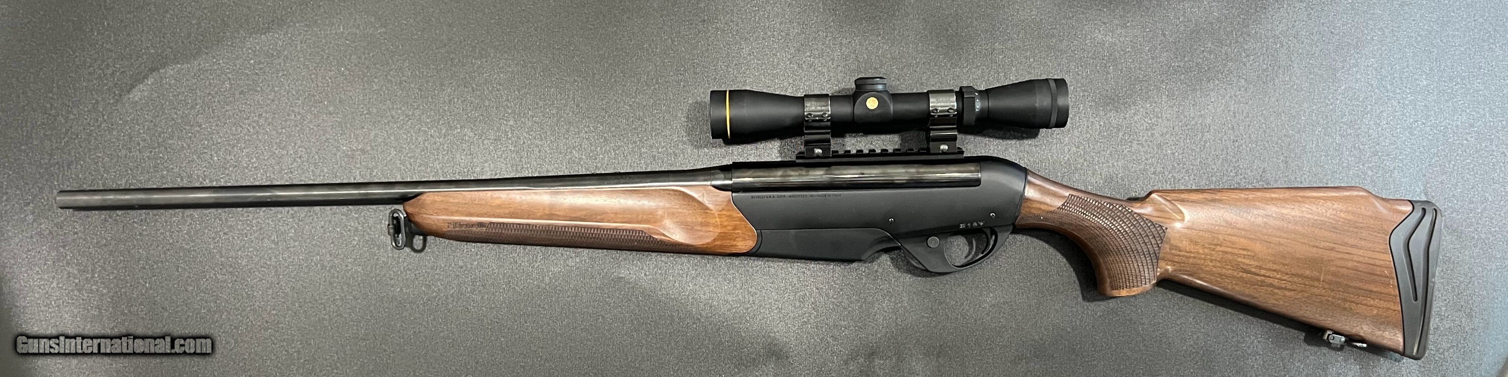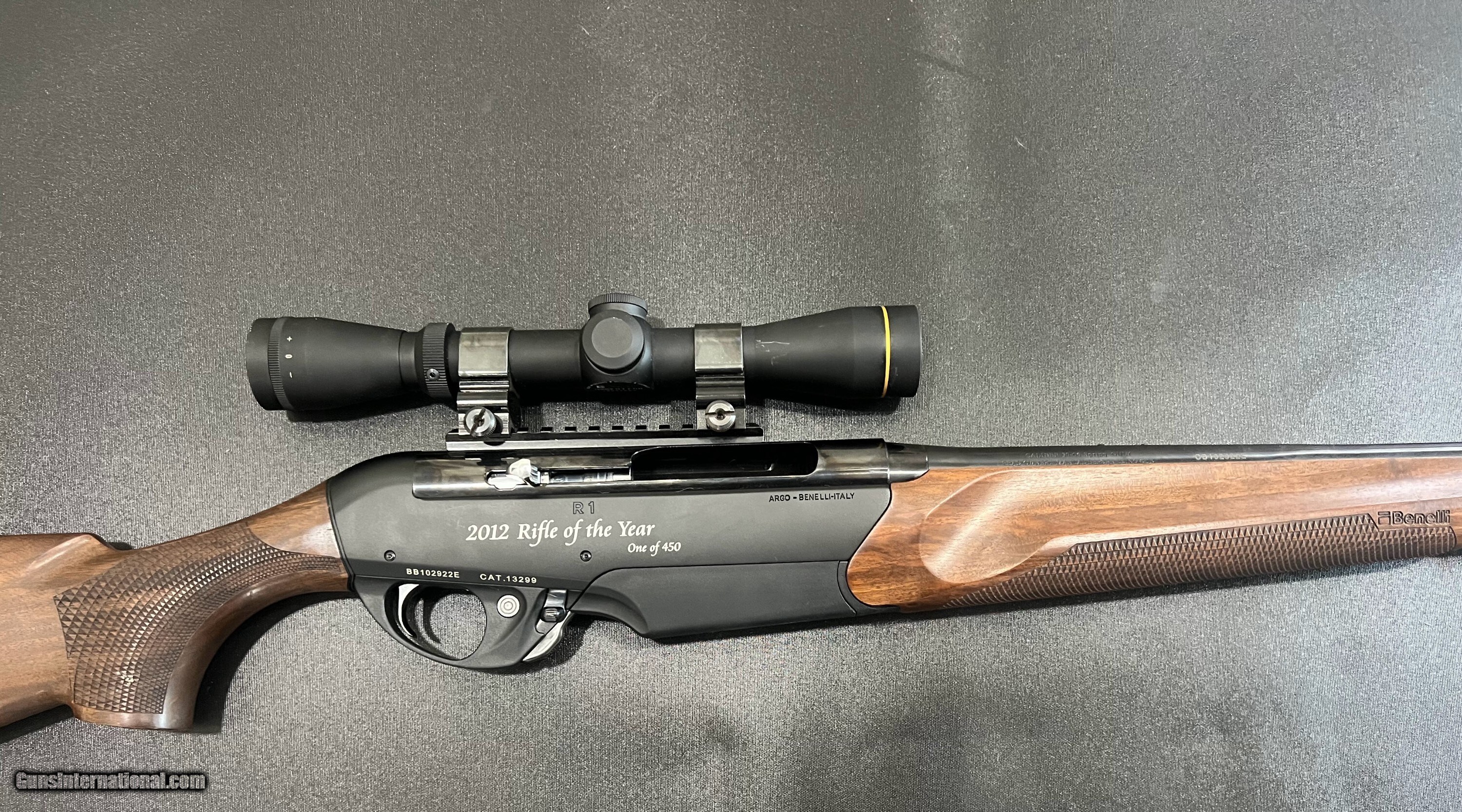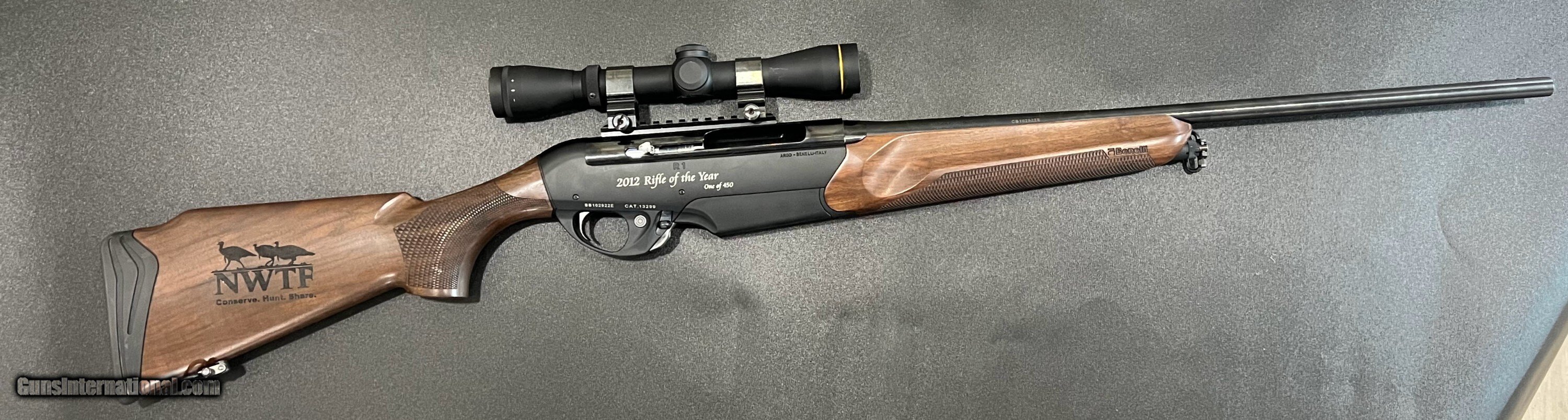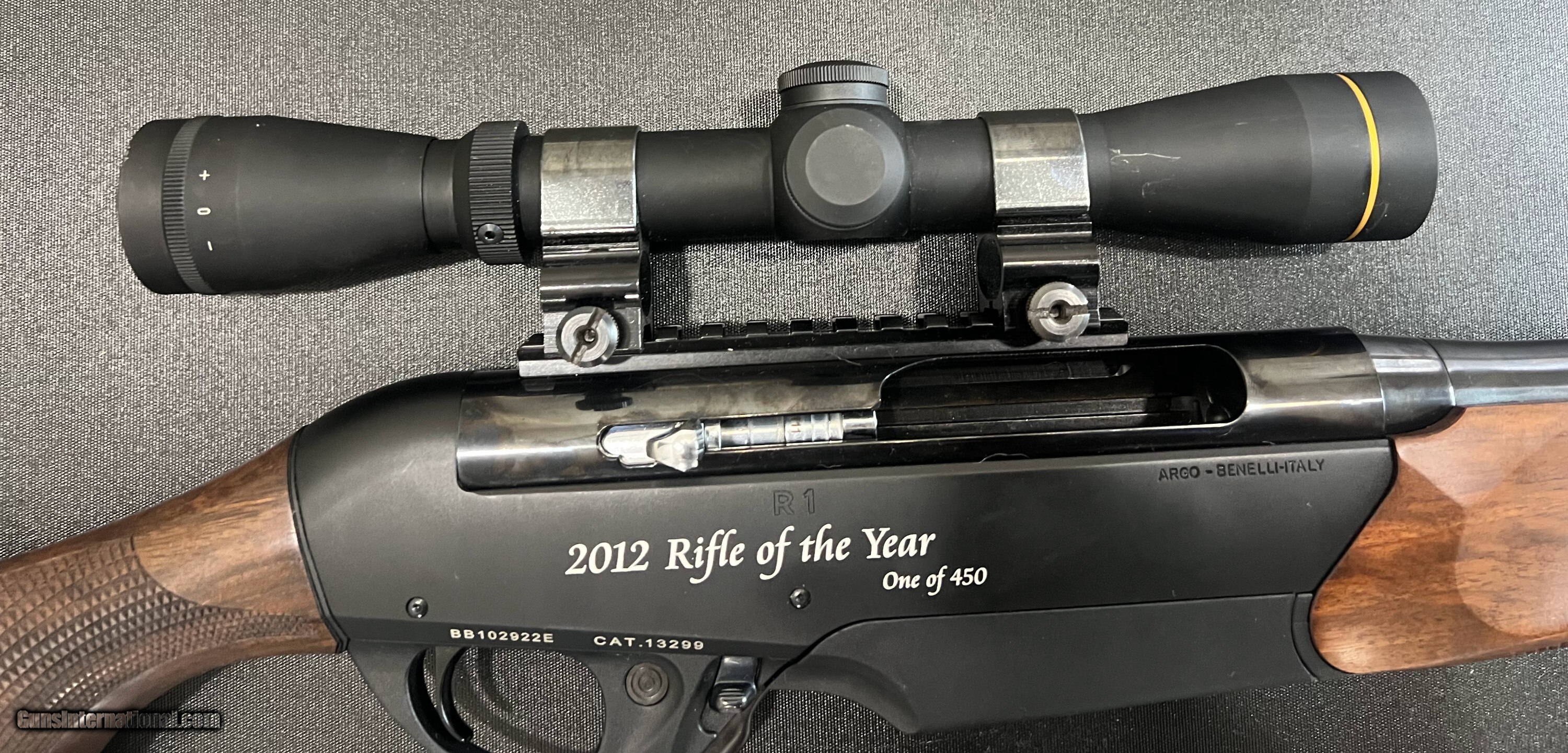 Description: Benelli R1 “2012 Rifle of the Year” Limited Edition (One of 450) – NWTF Stock – Semi-Auto – Scoped Offered is a Benelli R1 semi-automatic hunting rifle featuring Benelli’s A.R.G.O.system and a limited edition receiver marked “2012 Rifle of the Year – One of 450.” This rifle wears a handsome checkered walnut stock and fore-end, with the NWTF (National Wild Turkey Federation) logo on the buttstock. This example is set up ready to hunt with a mounted riflescope on a Picatinny rail with scope rings. Metal finish is a matte black/blue appearance with a clean, classic look. Great choice for a reliable semi-auto hunting rifle with a desirable limited-edition marking. Markings noted: