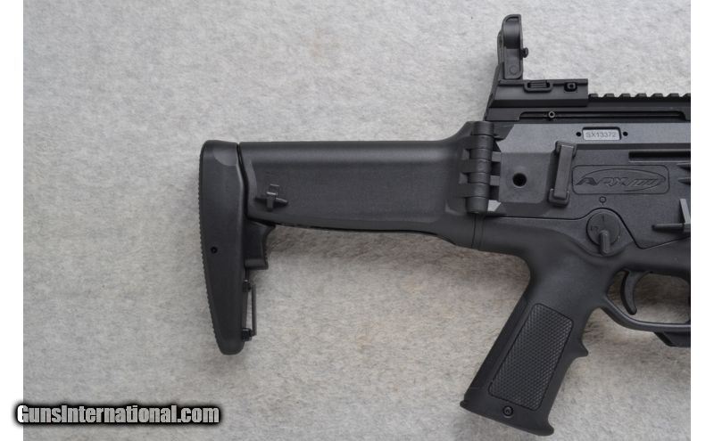 Description: This Beretta Model ARX100 is a semi-auto rifle in 5.56 NATO Cal. It has a 16 inch chrome lined barrel with a 1-7 twist and a muzzle break. The stock forearm is a vented black polymer with side and bottom accessory rails and it has a full black polymer pistol grip. It has a fixed piston moving cylinder gas system designed to need minimal maintence. There is an adjustable gas valve for optimum reliability and endurance with a wide range of ammunition. The barrel is a quick change that can be removed and installed in a few seconds without tools. It has select right or left hand ejection, a reversible bolt handle and ambidextrous controls. It is in excellent condition. SOLD Caliber Info: 5.56 NATO Chambers: Semi-Auto 30 round detachable magazine. Metal Condition: Excellent. Wood Condition: Black polymer stock is in excellent condition. Bore Condition: Excellent. Barrels: 16 inch chrome lined matte black. 1-7 twist. Stock: Adjustable, telescoping and folding black polymer. Stock Dimensions: LOP 13 1/8 inches full open. Fore End: Vented black polymer. Bottom and side accessory rails. Butt Pad: Textured black polymer. Weight: 7 lbs. 3 oz. Sights: Flip up adjustable front and rear sights. Extras: Comes with a soft case, Owners Manual, black nylon sling and one 30 round magazine. Removable adjustable flip up sights. Item Location: Richfield, WI |