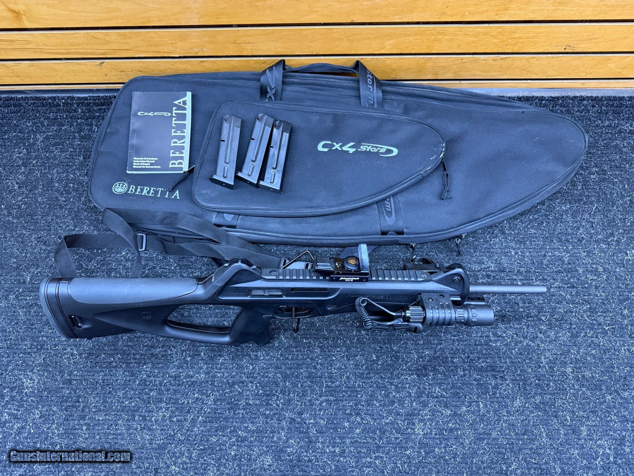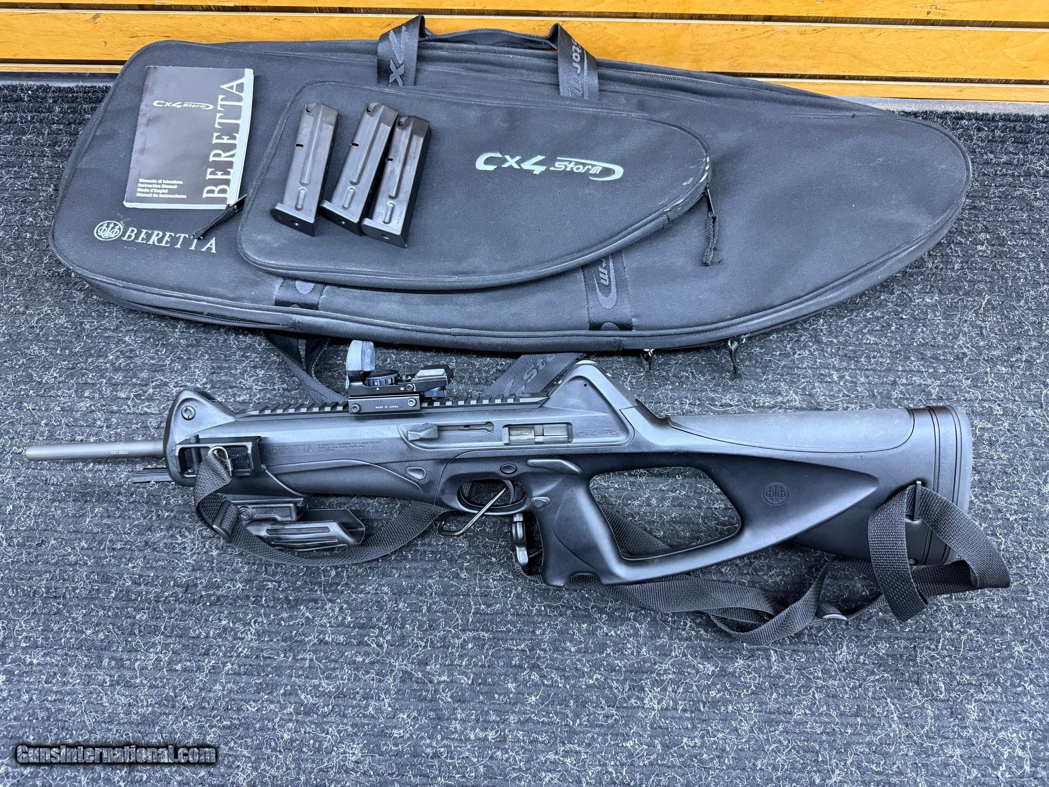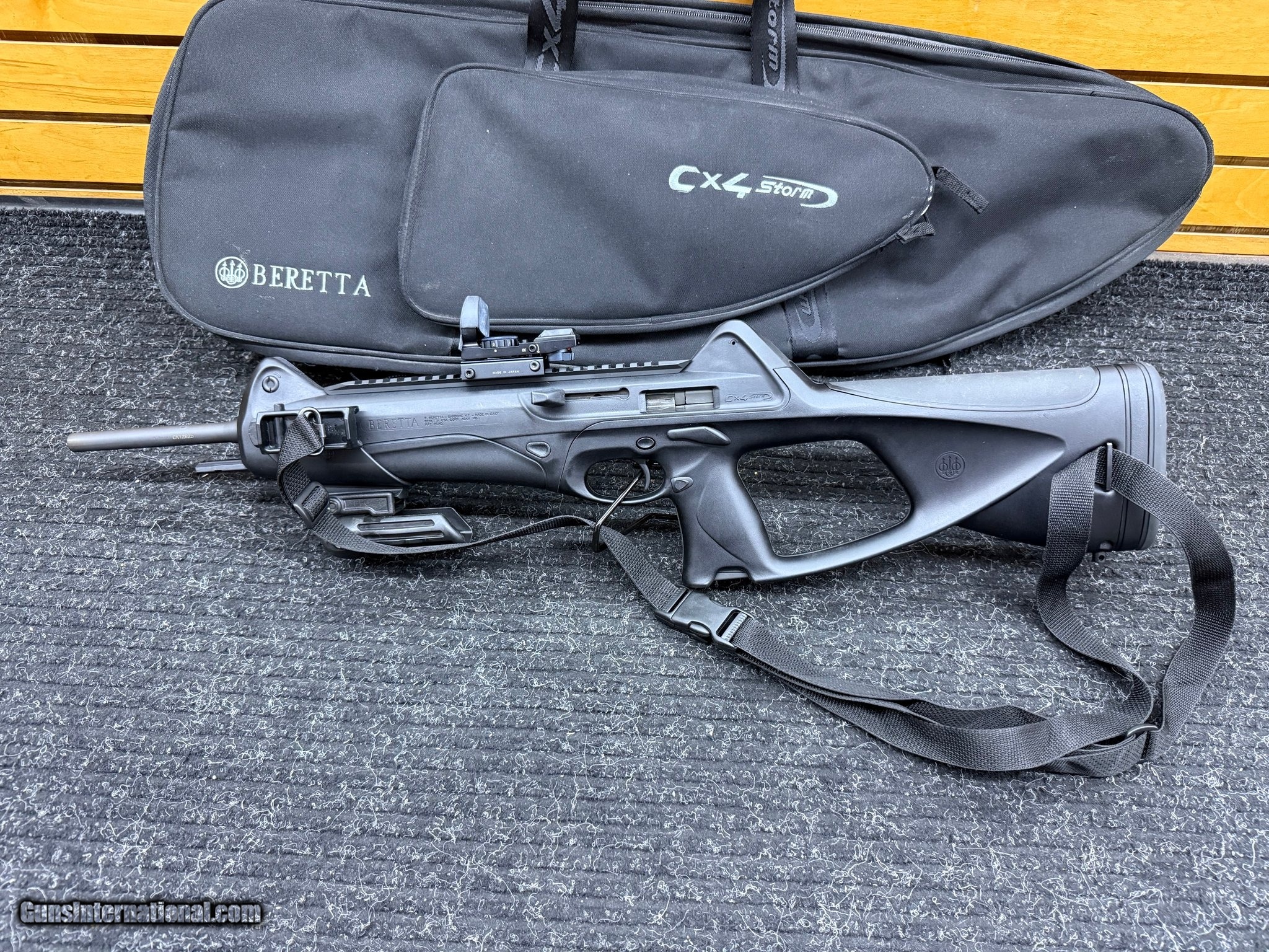 Description: Guns Listing ID: 476906 Beretta CX4 Storm semi auto 9mm carbine in great condition. Comes with original beretta bag, 3-10 round mags, sling, red dot, flashlight, and manual. The Beretta CX4 Storm is a semi-automatic carbine that is part of Beretta‚‚s Storm series, designed primarily for tactical, sport shooting, and personal defense purposes. Here‚‚s a detailed description of the Beretta CX4 Storm: Key Features: Caliber: The CX4 Storm is available in multiple calibers, including 9mm, .40 S&W, and .45 ACP, making it versatile for different applications. Design: It has a modern, compact design with a polymer frame and a sleek, ergonomic shape. The rifle is relatively lightweight, which aids in handling and maneuverability. The CX4 is notable for its ambidextrous controls, making it user-friendly for both left- and right-handed shooters. Operation: The CX4 Storm operates using a blowback system, which is straightforward and reliable. It‚‚s designed for semi-automatic firing, providing quick follow-up shots. Barrel Length: The barrel typically measures around 16 inches, providing a balance between accuracy and portability. It is ideal for close-quarters engagements but still effective at moderate ranges. Magazine: The carbine uses Beretta PX4 Storm pistol magazines, which is a convenient feature for those who own a PX4 pistol, as they can interchange magazines between the two. The magazine capacity varies depending on the caliber, but it typically holds 15–20 rounds. Sight System: The Beretta CX4 Storm comes with integrated iron sights and a Picatinny rail for mounting optics or other accessories. This makes it highly customizable for different tactical needs. It also has a rear aperture sight and a front post sight, which enhances aiming accuracy. Stock: It has a telescoping, adjustable stock that allows for customization to the shooter‚‚s length of pull, improving comfort and accuracy. The stock is made of polymer and is durable enough for demanding use. Recoil and Handling: Despite being chambered in larger calibers, the CX4 Storm‚‚s blowback system and lightweight construction minimize felt recoil, allowing for faster follow-up shots. Performance: Accuracy: Known for its reliable accuracy at medium ranges, the Beretta CX4 Storm performs well in scenarios that require rapid target acquisition. Durability: The carbine is constructed to handle tough conditions and can endure harsh environments, making it suitable for law enforcement, military, and civilian use. Customization: Due to its modular design, the CX4 Storm can be accessorized with various attachments such as optics, tactical lights, grips, and bipods. Applications: Personal Defense: The CX4 Storm‚‚s compact size and versatility make it a good option for home defense and tactical situations. Sport Shooting: It‚‚s popular among competitive shooters due to its accuracy and low recoil. Law Enforcement/Military: Its ambidextrous design, reliability, and compatibility with pistol magazines make it a great choice for law enforcement agencies. Overall, the Beretta CX4 Storm is appreciated for its solid build, ease of use, and adaptability, offering a great balance between power, portability, and precision. < SOLD Manufacturer: BERETTA Model: CX4 STORM Condition: Used - Non-Certified Barrels: 16.6 Gauge Info: 9MM LUGER (9x19 PARA) Finish: black |
