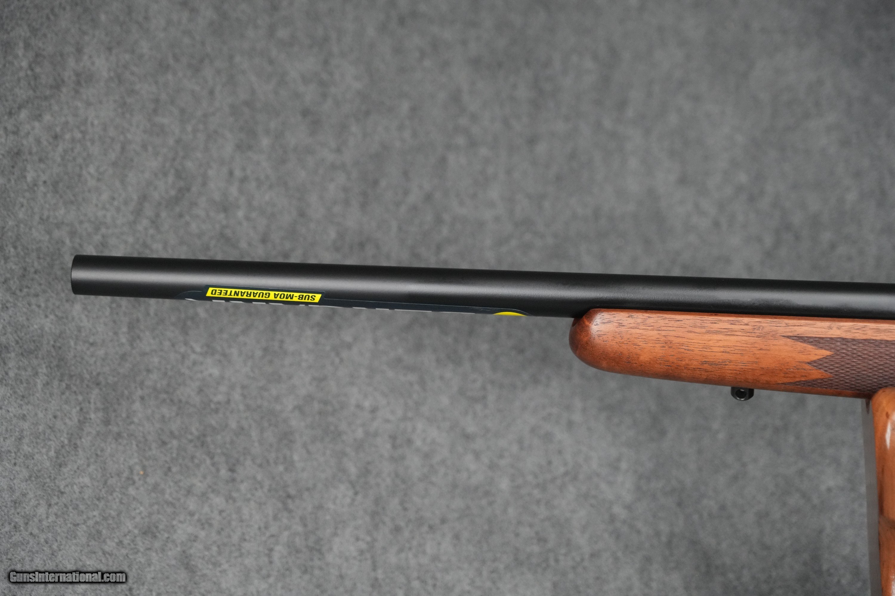 Description: ***BRAND NEW IN BOX*** ***The firearm pictured is the ACTUAL gun for sale! All images are of the ACTUAL item, unless specified otherwise. The item seen is the item you will receive. *** The B-14 Timber rifle features a Monte Carlo style walnut stock with a raised comb and cheek piece. As with the entire B-14 Series, the Timber brings Bergara Barrel accuracy to a line of hunting rifles that is affordable to serious big-game hunters. Built in Spain at Bergara's highly automated and efficient barrel factory, this rifle delivers a level of quality and performance that is unmatched in its price range. The world-renowned Bergara barrel on this most accurate hunting rifle is complemented by a super-smooth B-14 Action, which is a two-lug system with a sliding plate extractor and a coned bolt nose and breech to ensure a smooth feeding and extraction of the cartridge. It’s also outfitted with a Bergara curved trigger we designed to guarantee a crisp, clean pull every time you fire the rifle. The trigger comes set at about three pounds. The Timber is available with a hinged floor plate. It has been factory drilled and tapped to fit Remington 700 style rings and bases. The (#4) Bergara 4140 CrMo steel barrel is finished in matte blue. The stocks are bedded with integral pillars for stability and enhanced accuracy. During the stock making process 2 oversized holes are machined and filled with a tough metal infused epoxy resin. After the epoxy cures, the stock is CNC machined to exacting tolerances. The result is 2 solid epoxy pillars that surround the action screws. The stock is then finished with multiple coats oil. Safety: 2 Position Frame Finish: Cerakote Black Drilled & Tapped: Yes Weight: 7.7 lbs. Firearm Stock: Walnut Monte Carlo Features: B14 Two Lug Bolt | Sliding Plate Extractor | SUB-MOA Guarantee Finish: Black, Blue Firing System: Internal Hammer Trigger: Bergara Curved Magazine Type: Hinged Floorplate Trigger Pull Average: 3.00 Barrel Configuration: Single Barrel Description: 3 Profile SUB-MOA Barrel Twist: 1-10 Rifled Barrel: Yes Sling Attachment: Yes SOLD Rifle Caliber: .308 Winchester Manufacturer: Bergara Model: TIMBER Barrel Length: 20" Barrel Condition: BRAND NEW |