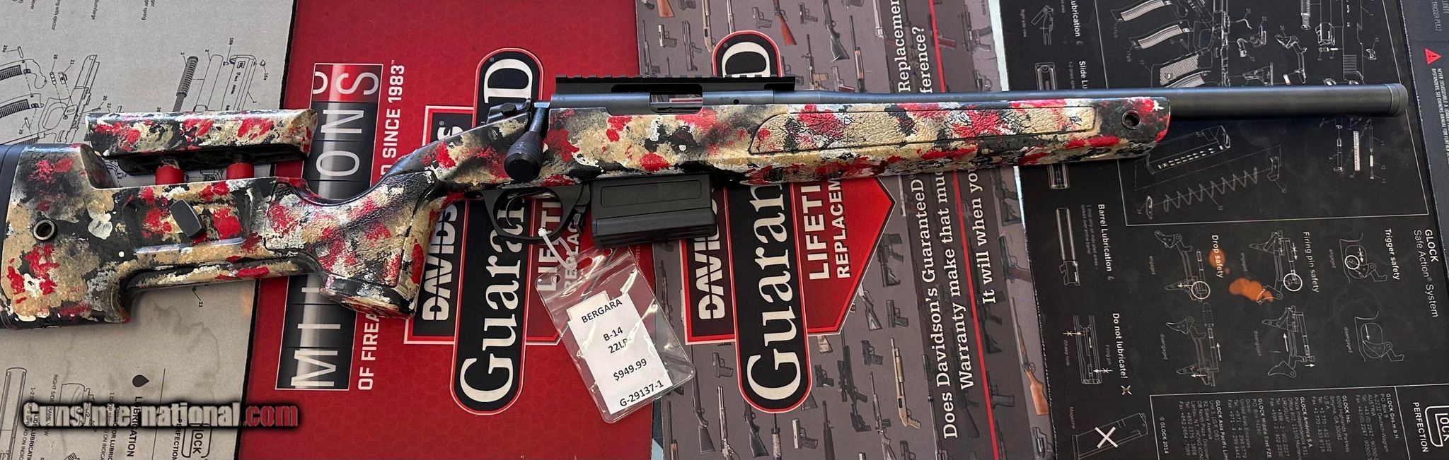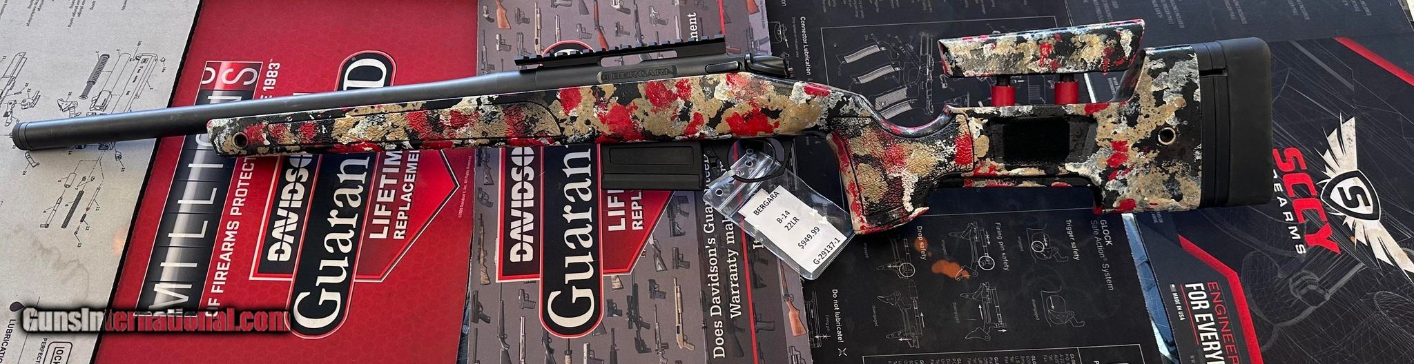 Description: Guns Listing ID: 1129145 A custom paint job of black/tan/red/white, comes with the single magazine that can be seen in photo. It has a threaded barrel. No sight SOLD Manufacturer: BERGARA Model: B-14 Caliber Info: .22 LR Condition: Used - Non-Certified Barrels: 18 BARREL Finish: CERAKOTE |