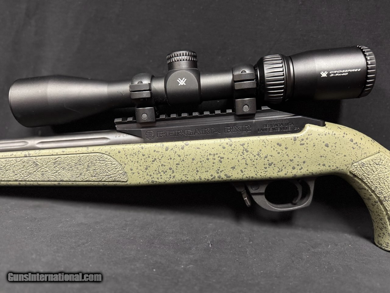 Description: Guns Listing ID: 572815 Up for sale is a BEAUTIFUL pre-owned Bergara BXR Carbon .22LR semi-automatic rifle with a Vortex Crossfire II 3-9x40mm Optic. This rifle is in near EXCELLENT condition showing minimal handling and use. The rifle features a 16.5" barrel threaded and capped for the easy attachment of a suppressor and is made from 4140 CrMo steel that is fluted for weight reduction as well as expedited barrel cooling. The bore is clean and sharp still retaining it‚s mirror finish. The Bergara BRX ships with one 10/22 compatible rotary-style 10 round magazine. Please see all photos for a true condition of this rifle. The Bergara BXR Carbon 22LR Rifle is designed with all the features a serious rimfire shooter wants. This 22 rifle is built with a 4140 CrMO fluted barrel that reduces the rifle‚s overall weight while still offering reliable precision. The Bentz chamber on this Bergara 22LR is tighter than standard rimfire barrels to deliver improved accuracy and performance when firing standard velocity or match-grade rounds. To ensure an optimal feel, the Bergara BXR Carbon comes with three removable stock spacers for adjusting the length of pull, making this rifle great for rimfire shooters of every size. A pre-threaded muzzle and integral Picatinny rail offer stable platforms for attaching accessories and optics. Great for target shooting or a round of plinking, the Bergara BXR Carbon 22LR Rifle offers match-level accuracy and performance in a semi-automatic rimfire rifle. SOLD Manufacturer: BERGARA Model: BXR Caliber Info: .22 LR Condition: Used - Non-Certified Barrels: 16.5" BARREL Action: SEMI AUTOMATIC Finish: GREEN SPLATTER |