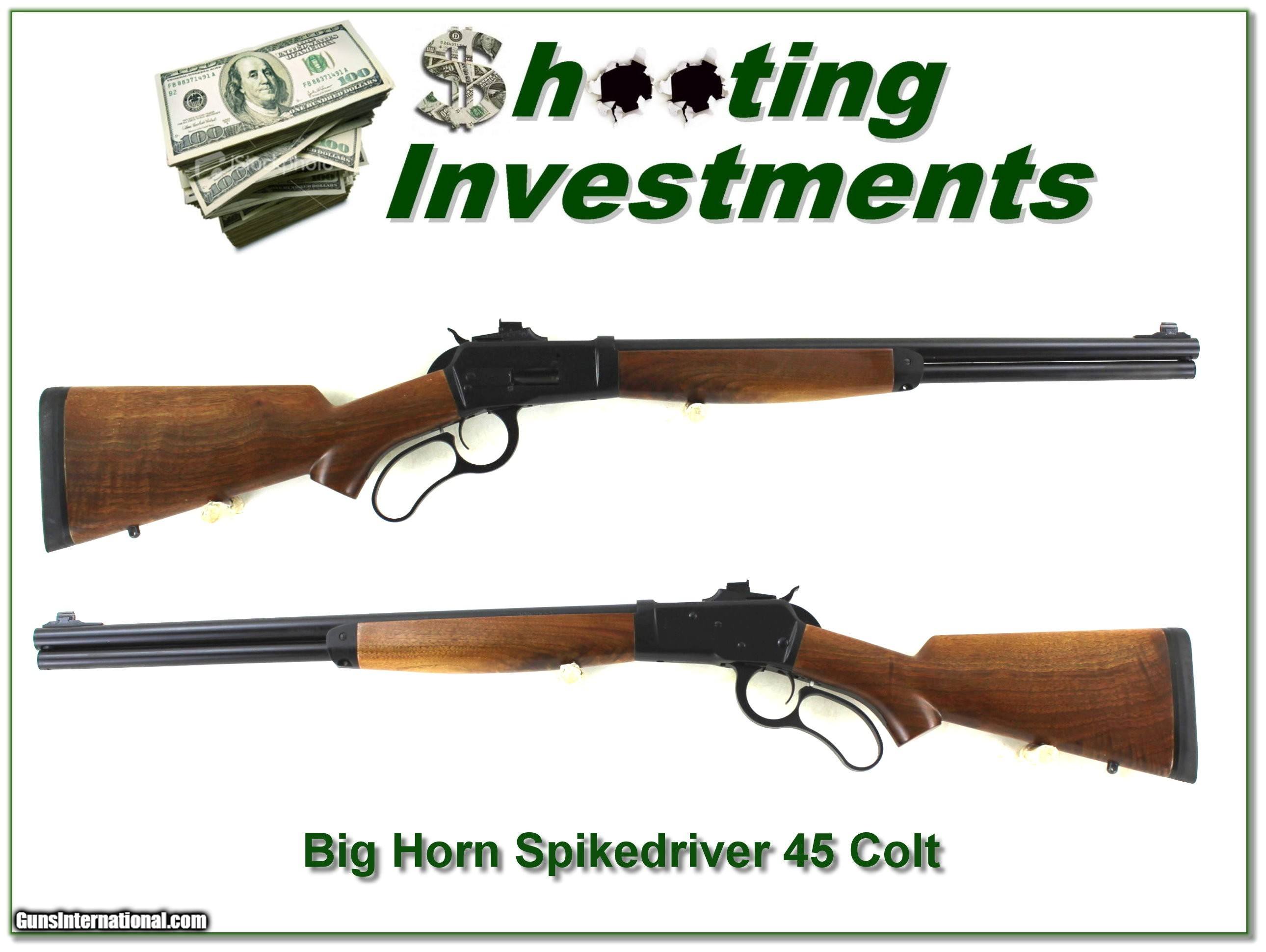 Description: Collectors, hunters and shooters, this is an early Big Horn Armory Spikedriver in 45 Colt. It has the early BHA rear sight and 20in barrel. The gun looks new with no marks I see and I’m sure only a few rounds fired! I am selling this one on consignment and as such lay-a-way can’t be used. It does of course have the standard 3-day inspection. Shipping and insurance is $59. Please email me with any questions or larger pictures. (Consign your quality firearms with Shooting Investments for only 12%! Let me know if you have any you would like to sell!) 24-1166 Payment: Payment is by Money Order, Cashier’s Check or Personal Check. I can now also accept Credit Cards (MasterCard, Visa, Discover & American Express) with a 3% convenience fee. Shipping: The shipping charge will be listed in each description. It is $49 for most firearms. Some heavy guns or those insured for over $2000 will be higher. Shipments to Alaska and Hawaii are higher because air shipment is required. Most firearms are shipped on Tuesday and Thursday and usually in 5 days of receipt of payment. We package all shipments carefully and insure them. Optics are shipped Priority Mail and most other non-firearm shipments are shipped First Class. Returns: Our return policy is simple. If for any reason you are not pleased with your purchase, you may return your item for a full refund of purchase price. Ammunition cannot be returned. It is important to us that you are happy. Guns cannot be fired or dissembled before returning them and they must be returned in the same condition as received. Notification of a return must occur within 3 days of receipt at your dealer. Shipping, convenience and dealer fees are not refundable and are the responsibility of the buyer. Lay-a-way: If needed, we offer a 60 day lay-a-way option on most firearms. It is 1/3 now, 1/3 in 30 days and 1/3 in 60 days. Lay-a-way firearm sales are final and cannot be returned. If a lay-a-way is not completed the first payment cannot be refunded. Consigning your firearms with Shooting Investments: We will help you get top dollar for your firearms. While most local guns shops charge 20% or more, our fee is only 12% with a minimum of $100. At your local gun shop it might take months to sell. Selling on-line provides instant access to thousands of interested buyers. You won’t find any other on-line dealer willing to sell your firearms for only 12% or listing every gun on 3 separate s. Selling through an House typically costs the seller 15% and the buyer an addition 15% (so 30%) and you have to wait several months to sell and longer to receive funds. If properly priced, we will sell your firearms within a few weeks. Send us an email or give us a call and we’ll explain how easy it is for you to get top dollar. Trading: Trading for us is really just buying your gun to re-sell. If you have a gun you want to trade, please email a picture and we will let you know what we can give for it. You will always get more if we sell it for you on consignment. SOLD |