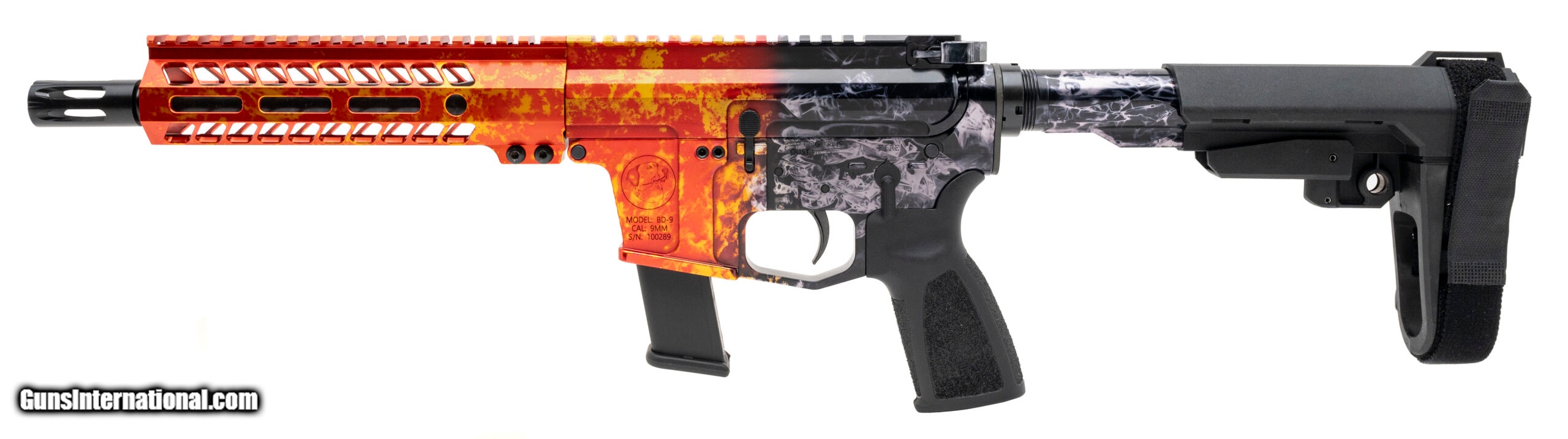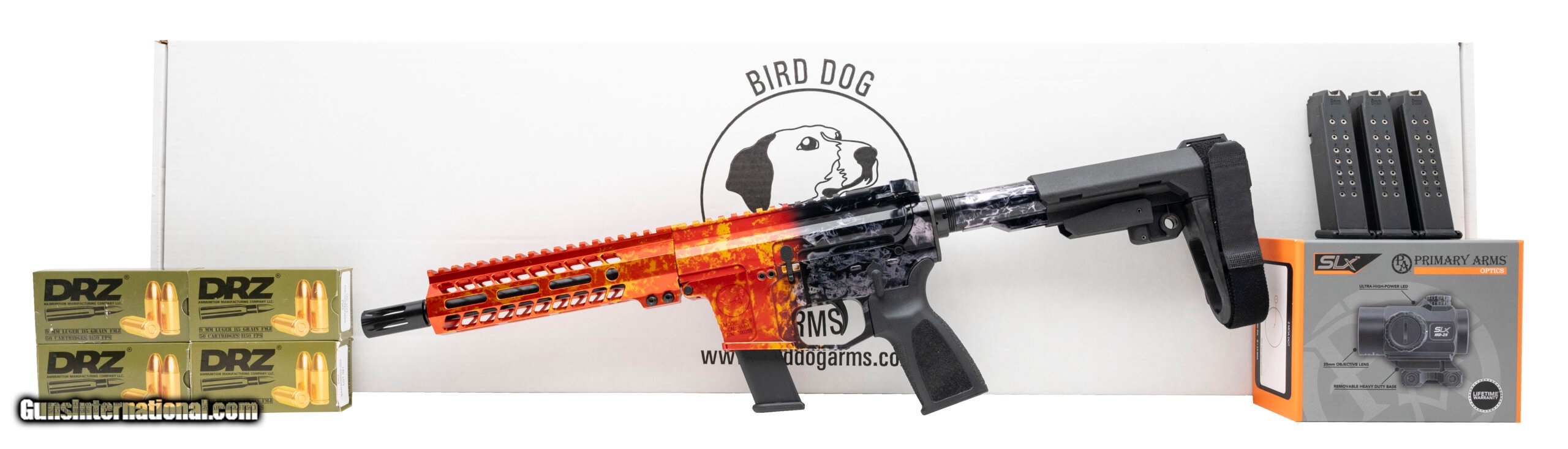 Description: "Bird Dog BD-9 Pistol Bundle Pack. 9mm with an 7.5"" threaded barrel with Bird Dog muzzle brake. Bundle Pack includes Pistol Brace ,Primary Arms MD-25 Micro Red Dot sight, 200 Rounds of DRZ 115 Grain 9mm Luger Ammo, and three pack of KCI USA Glock 17 9mm 17 round Magazines. New. (STOCK PHOTO) SOLD |