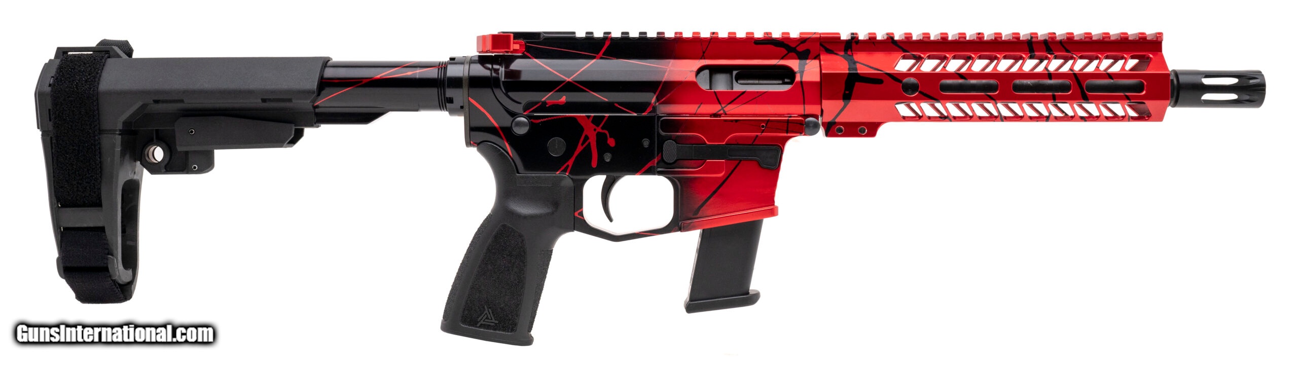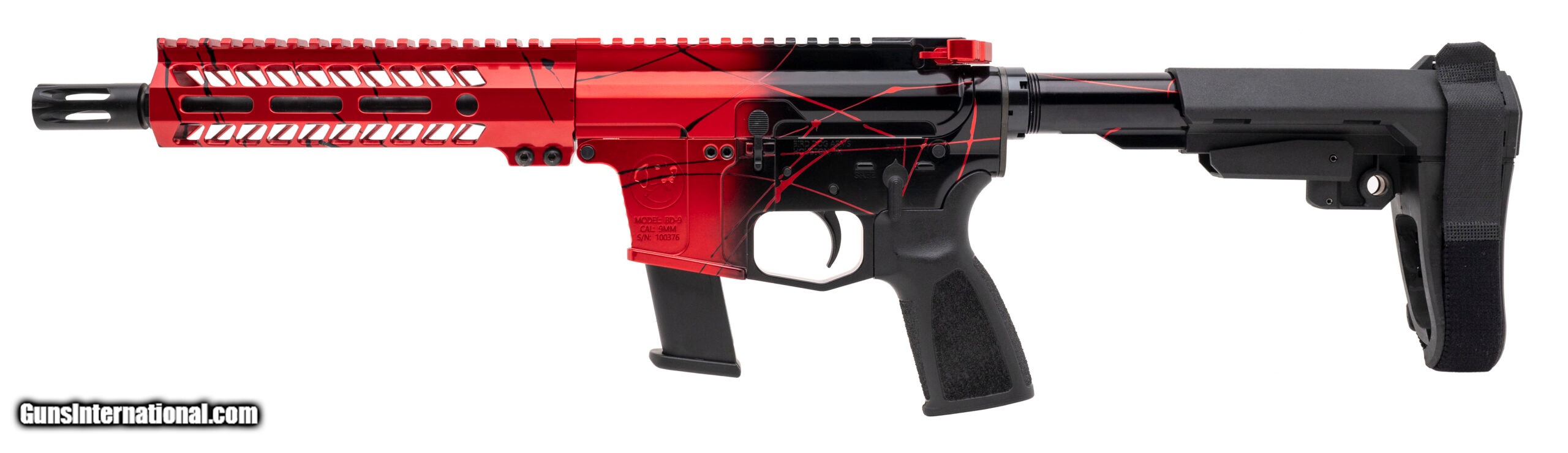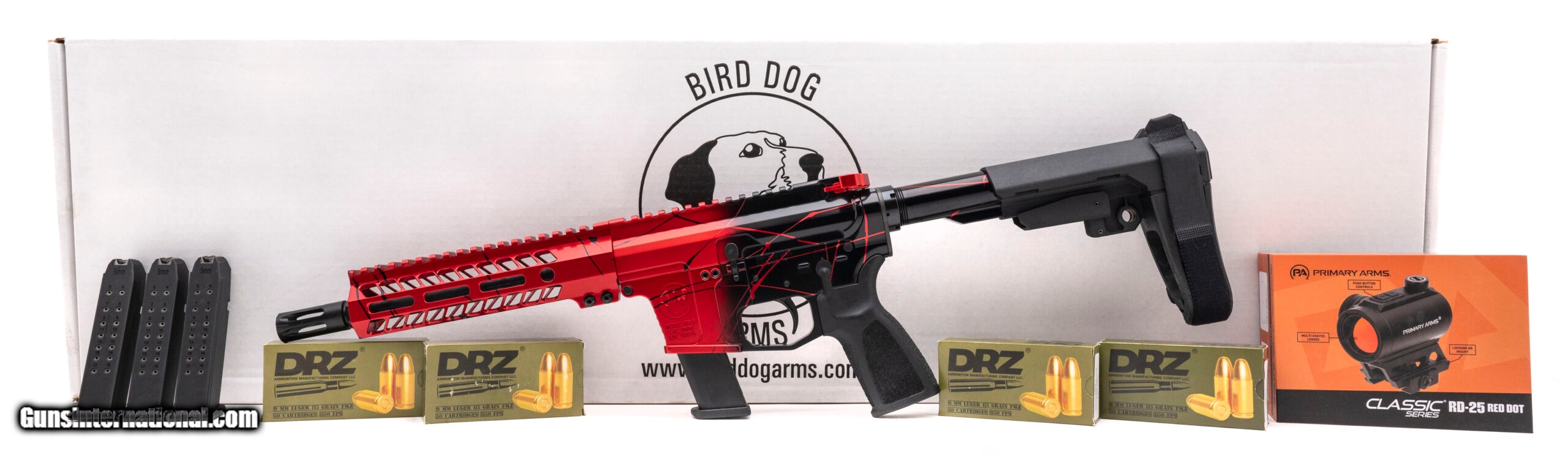 Description: "Anodized Red/Black Splatter Bird Dog BD-9 Pistol Bundle Pack. 9mm with an 7.5"" Threaded Barrel with Bird Dog Muzzle Brake. Bundle Pack Includes Pistol Brace, Primary Arms RD-25 Red Dot Sight, 200 Rounds of DRZ 115 Grain 9mm Luger Ammo, and Three Pack of KCI USA Glock 17 9mm 17 Round Magazines. NEW. (STOCK PHOTO) SOLD |