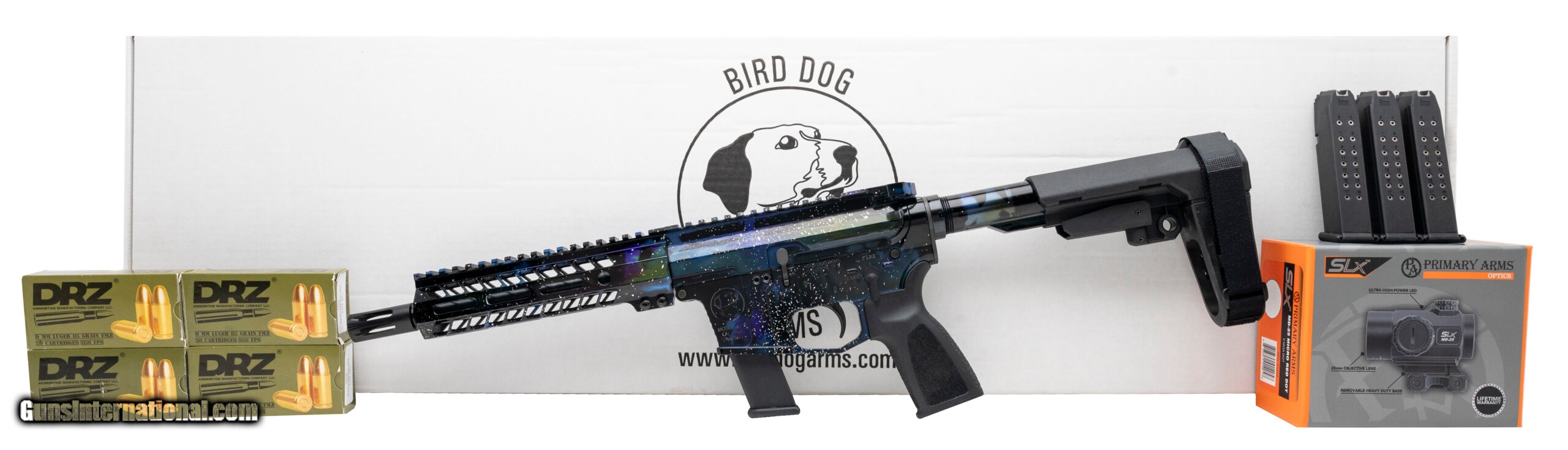 Description: "Bird Dog BD-9 Pistol Bundle Pack. 9mm with an 7.5"" threaded barrel with Bird Dog muzzle brake. Bundle Pack includes Pistol Brace ,Primary Arms MD-25 Micro Red Dot sight, 200 Rounds of DRZ 115 Grain 9mm Luger Ammo, and three pack of KCI USA Glock 17 9mm 17 round Magazines. New. (STOCK PHOTO) SOLD |