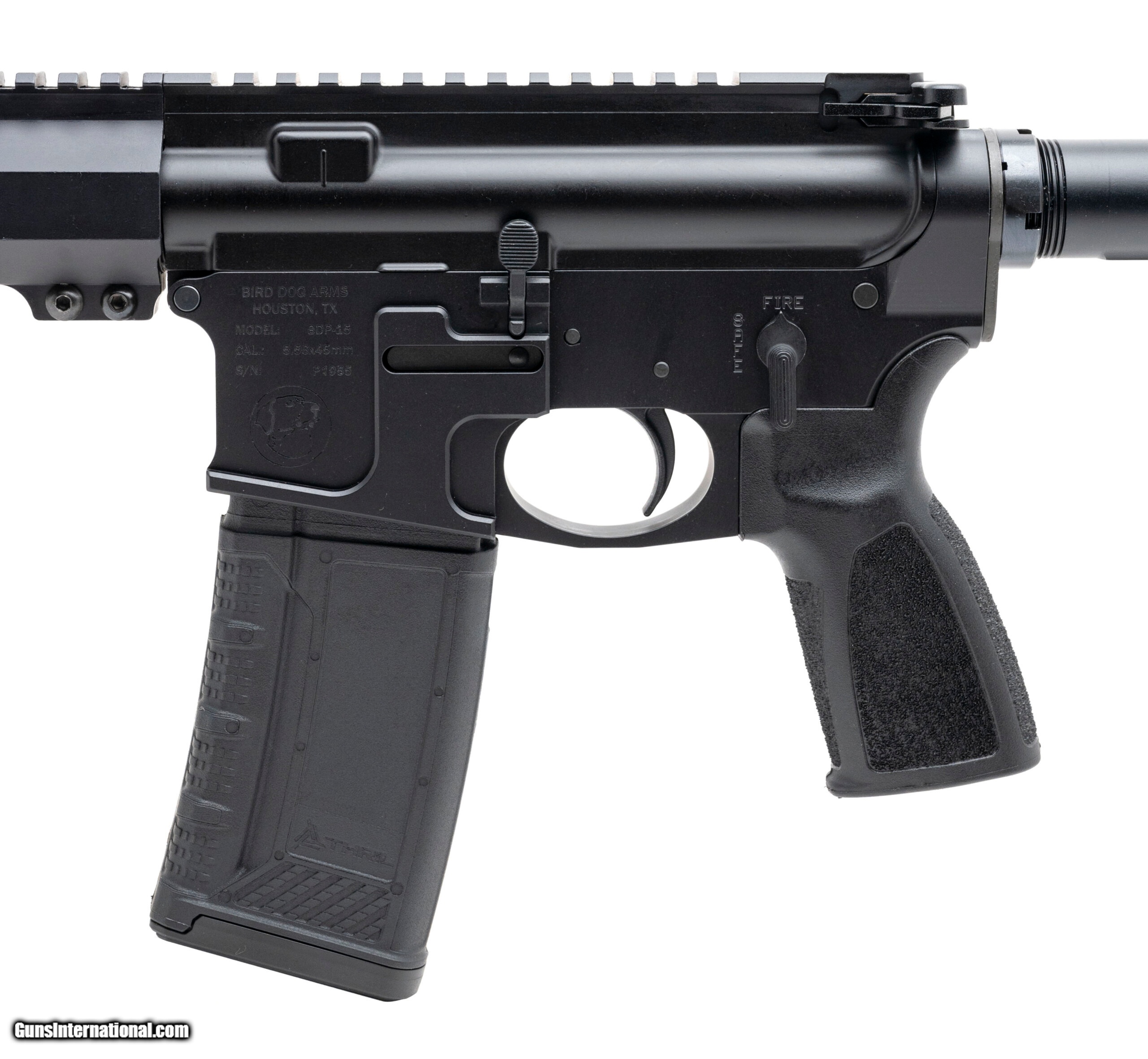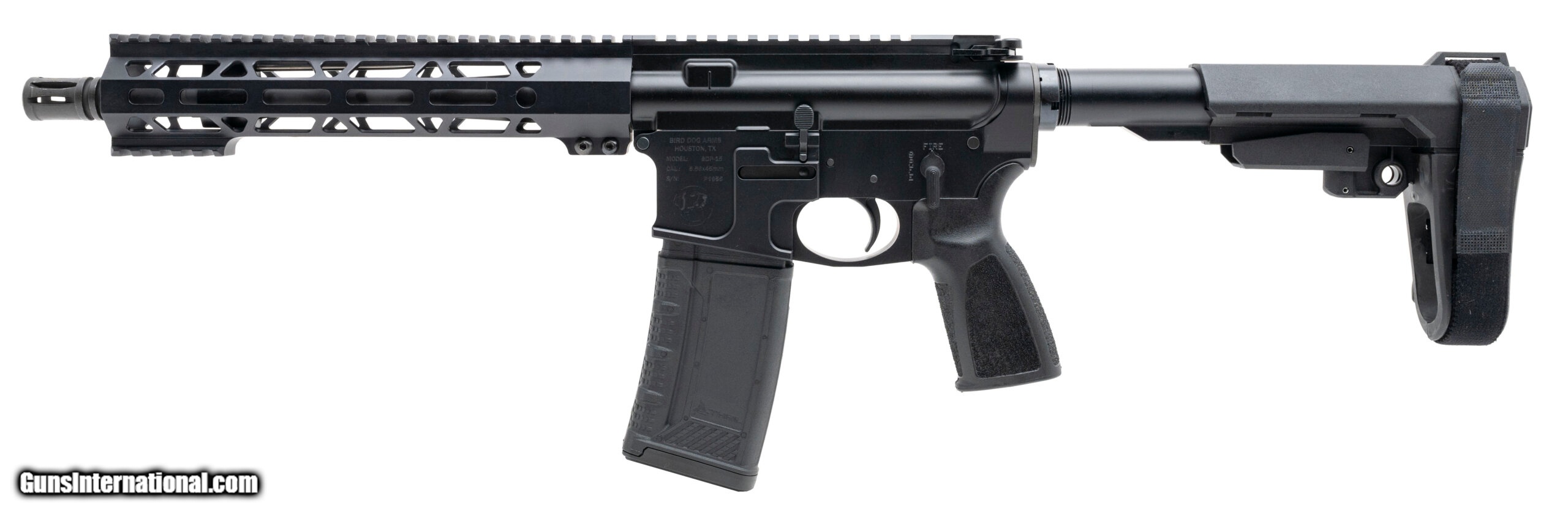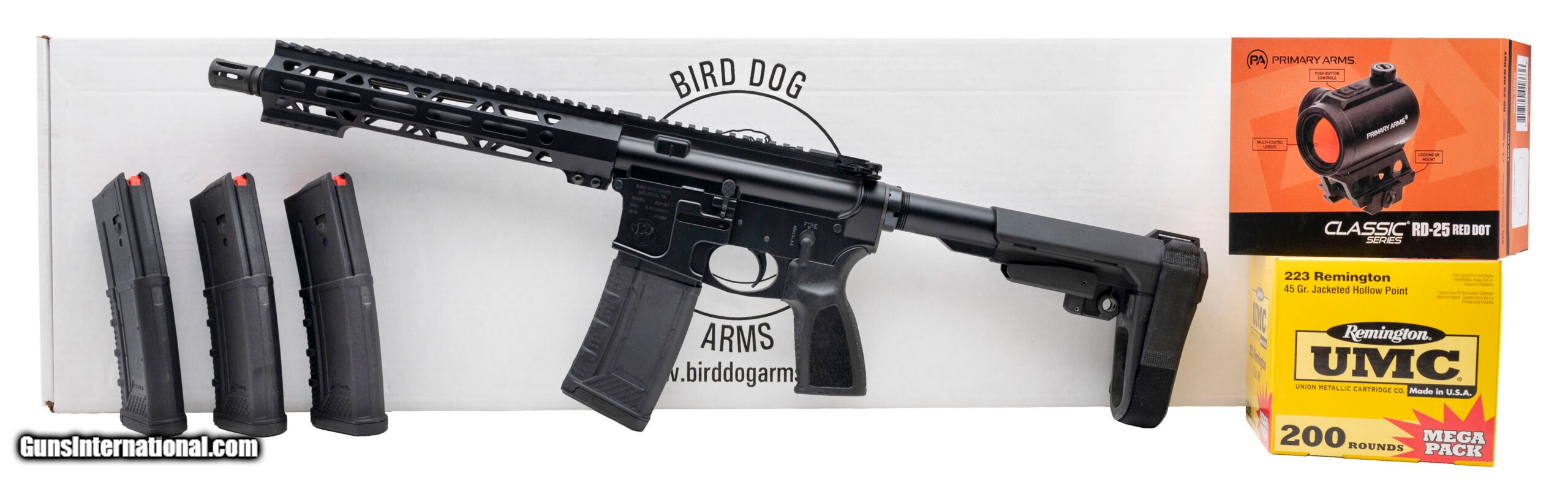 Description: "Bird Dog BDP-15 Pistol Bundle Pack. 5.56X45mm with an 10.5"" barrel with Bird Dog muzzle brake. Semi-automatic Pistol with a Pistol Brace and matte black finish. Bundle Pack includes three Athril 30-Round Magazines, Primary Arms RD-25 Red Dot sight, and 200 Round Remington UMC 45 Grain JHP Ammo. New. (STOCK PHOTO) SOLD |